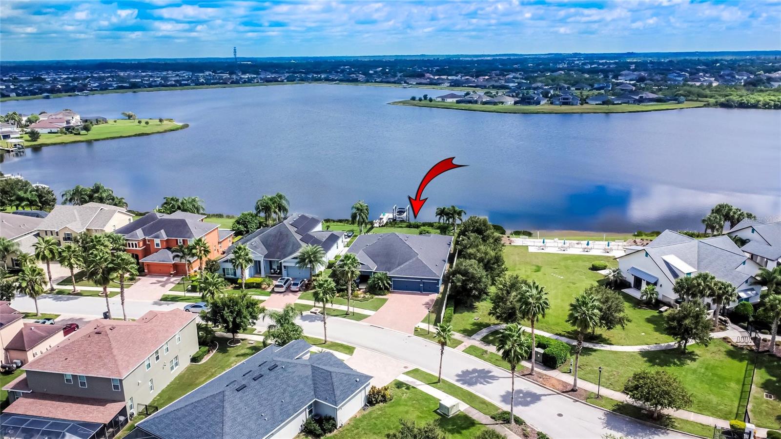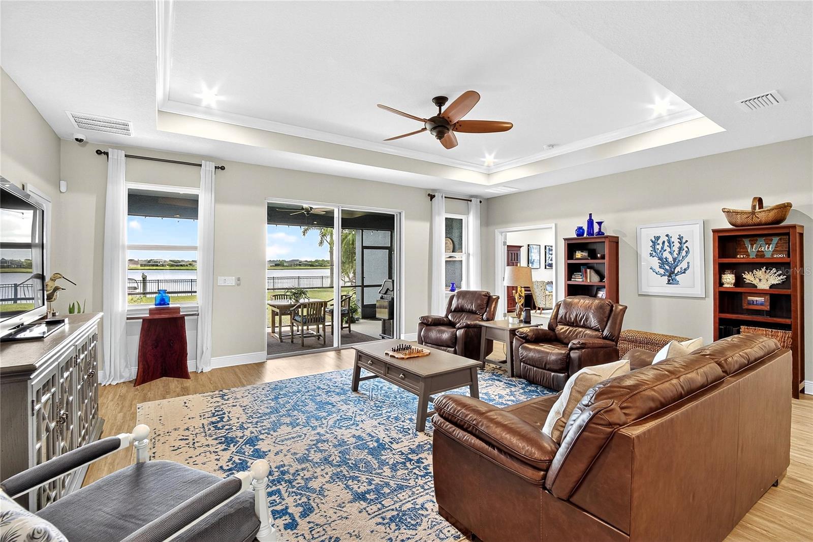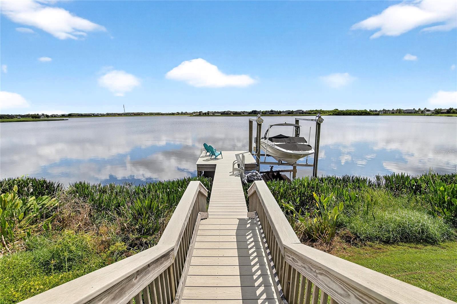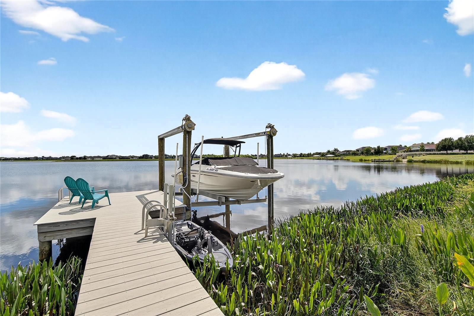AMAZING WATER VIEWS, BOATING, AND WATERSKIING, ALL IN YOUR VERY OWN BACKYARD AT LUCAYA LAKE! Welcome to this incredible lakefront home that was an original model for the GATED LUCAYA LAKE CLUB community. With 4 Beds and 3 Baths, plus a home office and bonus room, the floorplan is ideal for everyday living and entertaining. Step inside to tall ceilings, luxury finishes, and gorgeous LVP flooring that runs throughout the main living areas, bonus room, home office, and the primary bedroom. The floor plan is open and airy and starts with a formal dining room opposite the foyer from the home office, with French doors for privacy and quiet. Next is the kitchen with a large working island with a breakfast bar, lots of counter space and cabinet storage, a closet pantry, and stainless-steel appliances that include a gas range and double ovens. All this overlooks the casual dining area and a spacious great room with sliders and views of the lake. The smart design features three wings to the home. The first is the primary suite with walk-in closets and a stunning bath with high-end finishes. The second is the bonus room with a full bath and bedroom, ideal for an in-law suite, and includes a separate entrance. The third features two more spacious bedrooms and another full bath. Extra home features include overhead storage in the garage, a whole-house generator, and hurricane shutters. With cooler months around the corner, the screened lanai is the perfect spot to enjoy the beautiful water views and entertain by putting the custom, teak wet bar with storage to good use. Or take your boat on the lake from your dock that was constructed in 2022 with composite decking, which is shared with one immediate neighbor and features an electric boat lift rated for 7,500 lbs. For active lifestyles, the community amenities are a short walk next door and include a resort-style pool, splash pad, and 24-hour fitness center. Thank you for your interest in the beautiful home and for taking the time to see it in person.
