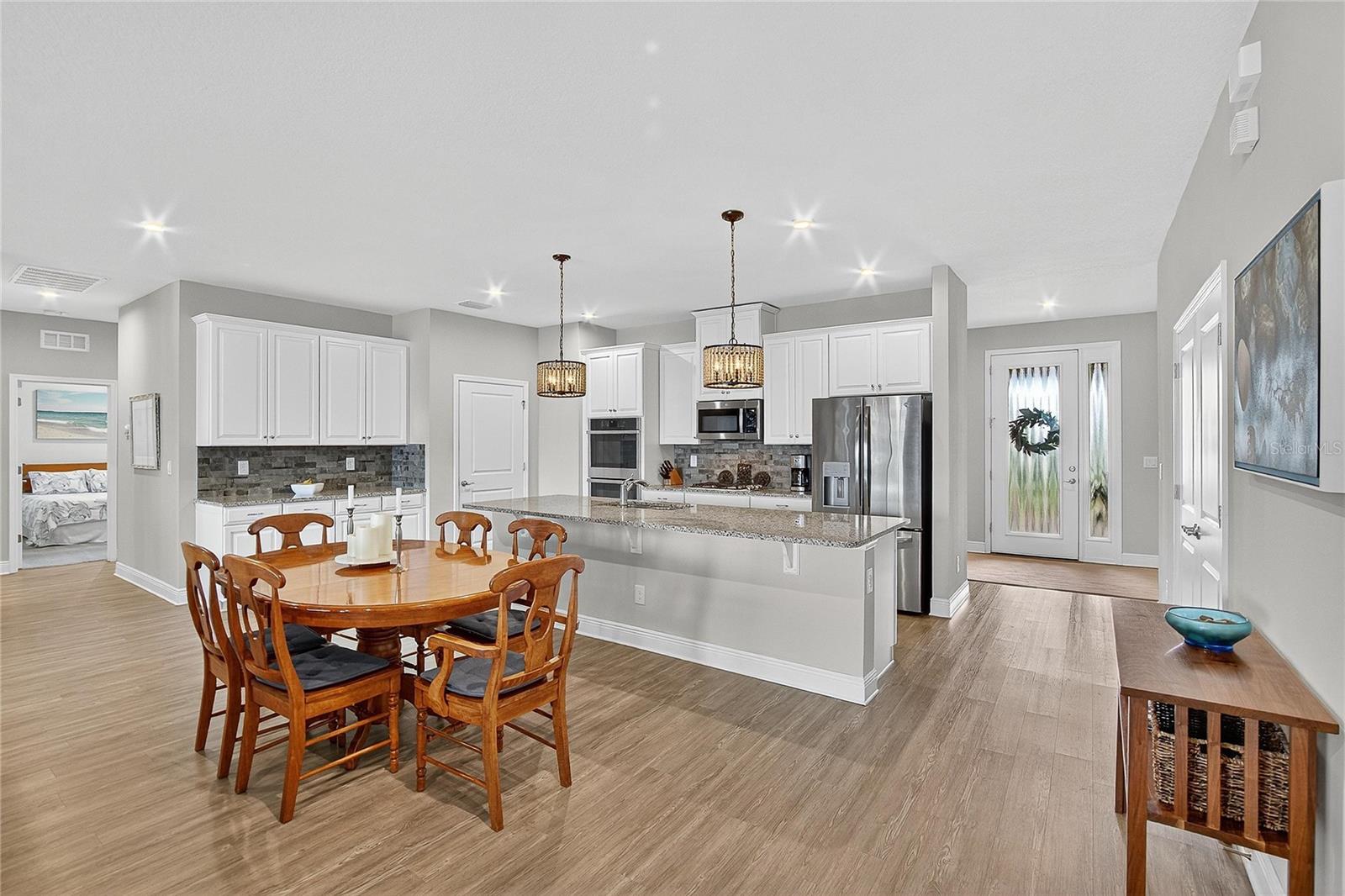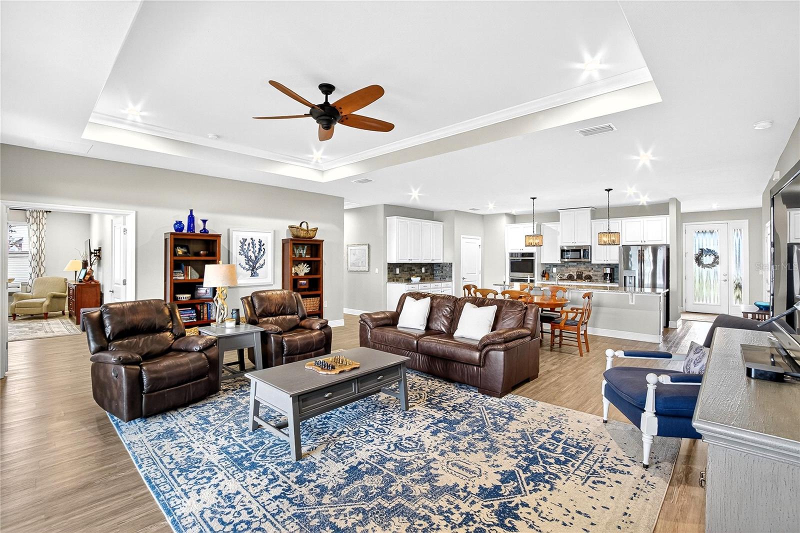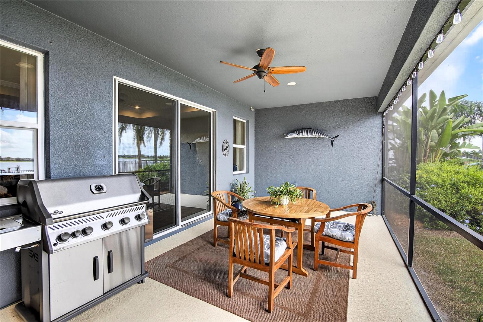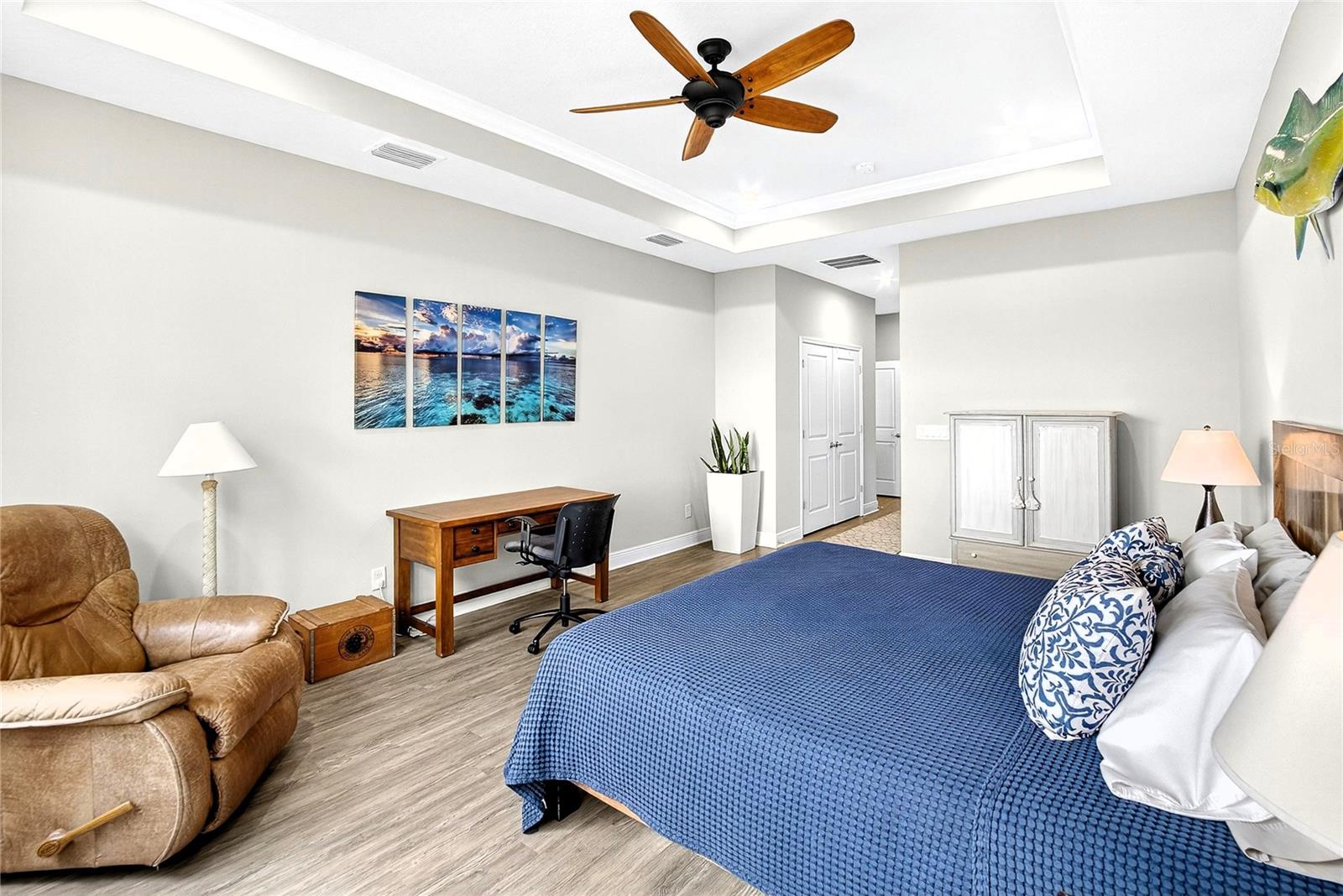 AMAZING WATER VIEWS, BOATING, AND WATERSKIING, ALL IN YOUR VERY OWN BACKYARD AT LUCAYA LAKE! Welcome to this incredible lakefront home that was an original model for the GATED LUCAYA LAKE CLUB community. With 4 Beds and 3 Baths, plus a home office and bonus room, the floorplan is ideal for everyday living and entertaining. Step inside to tall ceilings, luxury finishes, and gorgeous LVP flooring that runs throughout the main living areas, bonus room, home office, and the primary bedroom. The floor plan is open and airy and starts with a formal dining room opposite the foyer from the home office, with French doors for privacy and quiet. Next is the kitchen with a large working island with a breakfast bar, lots of counter space and cabinet storage, a closet pantry, and stainless-steel appliances that include a gas range and double ovens. All this overlooks the casual dining area and a spacious great room with sliders and views of the lake. The smart design features three wings to the home. The first is the primary suite with walk-in closets and a stunning bath with high-end finishes. The second is the bonus room with a full bath and bedroom, ideal for an in-law suite, and includes a separate entrance. The third features two more spacious bedrooms and another full bath. Extra home features include overhead storage in the garage, a whole-house generator, and hurricane shutters. With cooler months around the corner, the screened lanai is the perfect spot to enjoy the beautiful water views and entertain by putting the custom, teak wet bar with storage to good use. Or take your boat on the lake from your dock that was constructed in 2022 with composite decking, which is shared with one immediate neighbor and features an electric boat lift rated for 7,500 lbs. For active lifestyles, the community amenities are a short walk next door and include a resort-style pool, splash pad, and 24-hour fitness center. Thank you for your interest in the beautiful home and for taking the time to see it in person.