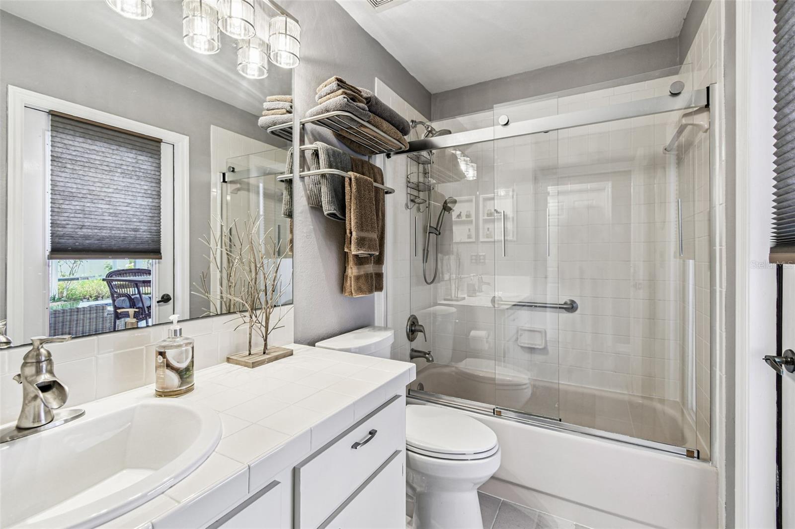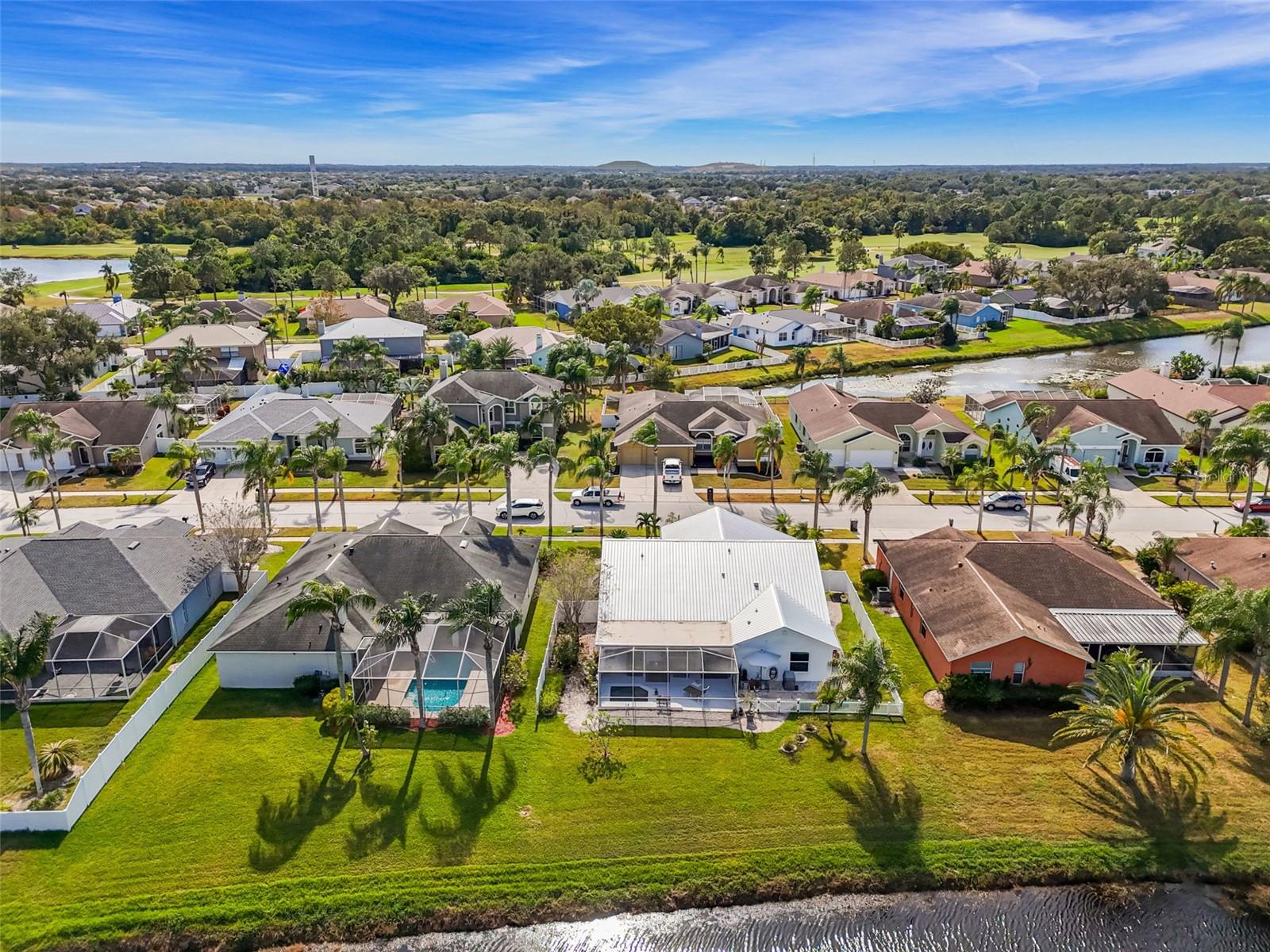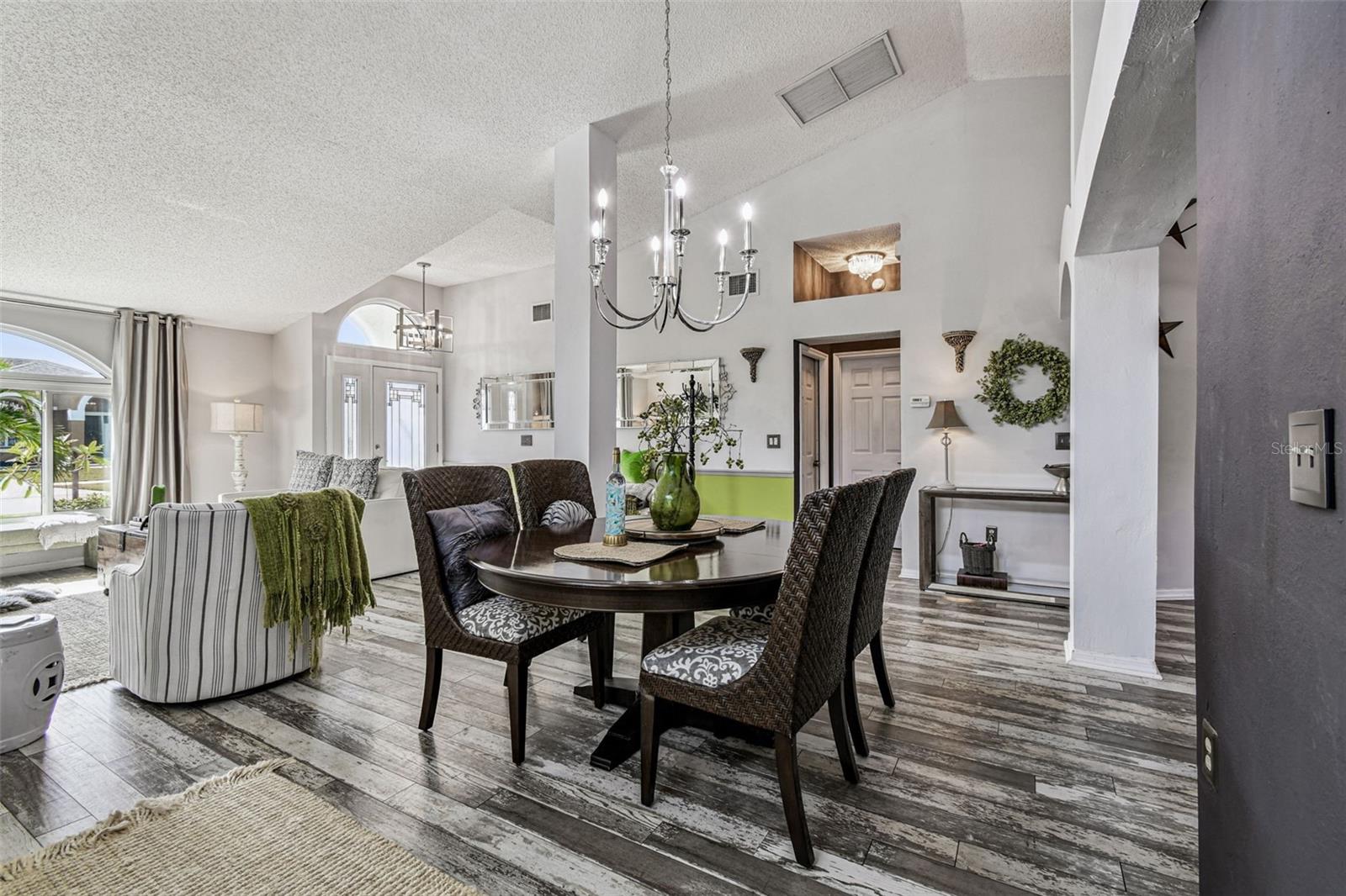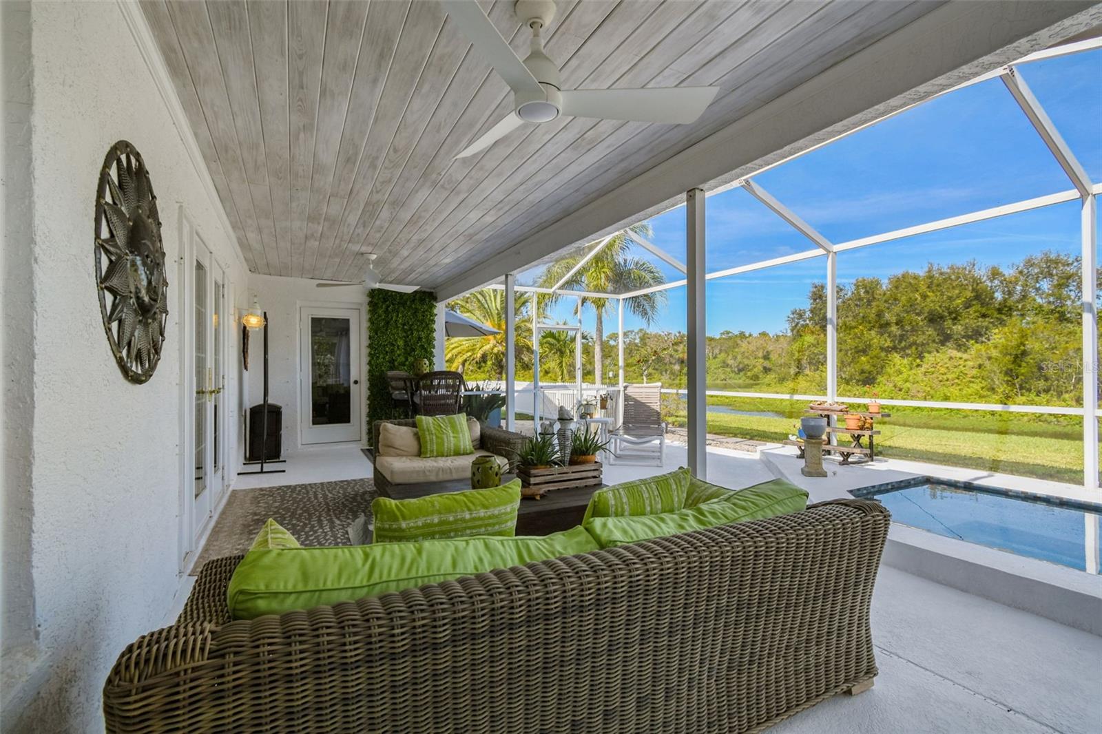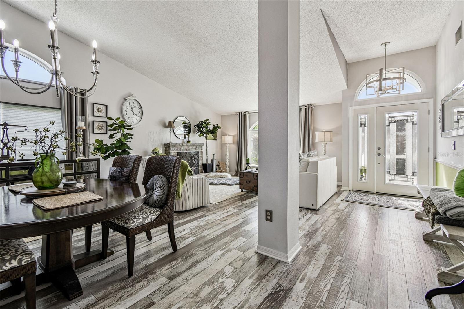 This stunning home has undergone a beautiful transformation. Step inside and you're welcomed with the same fantastic flooring throughout the entire home. The floors flow seamlessly from room to room. The living and dining rooms are light and bright with newer impact windows throughout. The kitchen was remodeled in 2017 with new cabinets, flooring, appliances, and stunning quartz counters. The Swarovski crystal chandelier is the icing on the cake. The family room is a wonderful place to look out the French doors to the water and conservation views, or to hang out and watch movies. Down the hall, there are two great-sized bedrooms with good-sized closets. The pool bathroom is perfectly placed with a door to the outside. It has been updated with new lighting, a sink, a faucet, and a toilet. There is also a laundry room that includes the washer and dryer. The primary suite is split from the two other bedrooms and is a private space. It has a large walk-in closet with a fun sparkly chandelier. The primary bathroom has been updated with new sinks, faucets, and lighting. Outside the lanai area is a great space for lounging. There is an 8-person spa that is perfect for relaxing. a brand new heater in 2025. The yard is partially fenced with a doggie door that is fantastic for your furry friends. The backyard has water and conservation with no rear neighbors. There is a huge 3-car garage with the most beautiful garage doors. The side garage door to the yard is an impact door that was installed in 2025. Other improvements are a metal roof, which is new in November 2024, and the impact windows were installed in 2024 and 2025. Come make this beautiful house your new home.