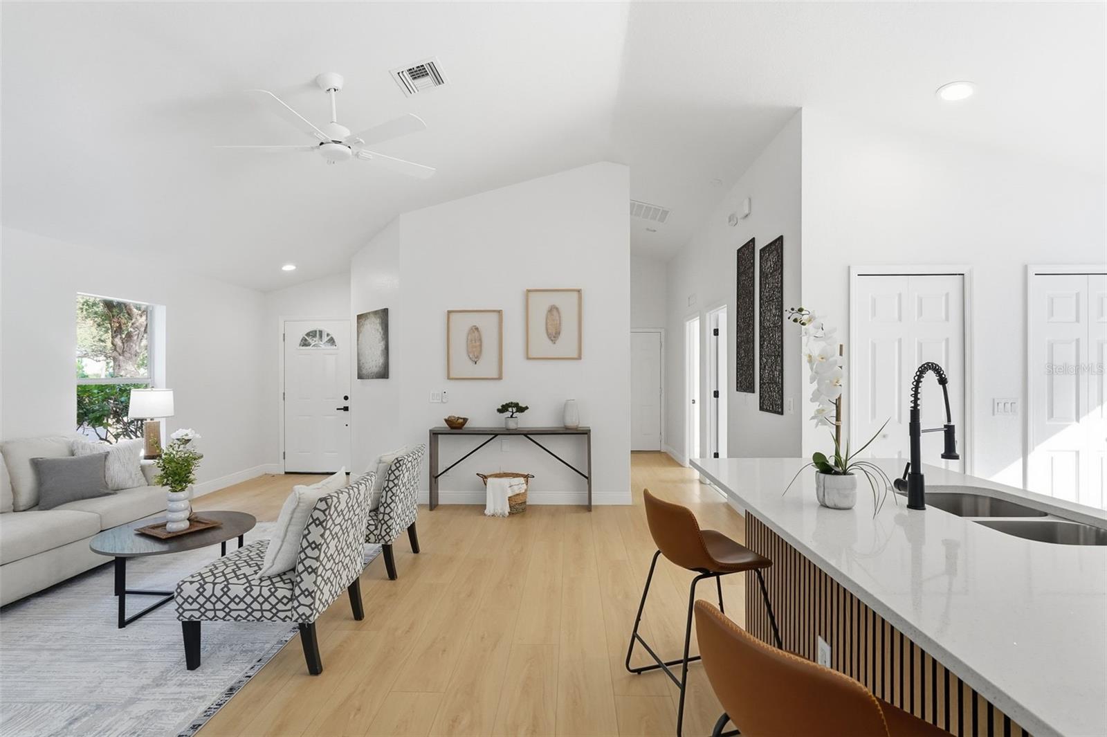 Beautifully Updated 3 Bedroom, 2 Bath Home on Corner Lot – New Roof, New Floors, and Modern Upgrades Throughout! Welcome to this fully renovated 3-bedroom, 2-bathroom home situated on a spacious corner lot with mature landscaping and great curb appeal. Step inside to an open, airy layout featuring high vaulted ceilings, abundant natural light, and brand-new luxury vinyl tile flooring. The home offers both a screened front porch and a screened back porch, providing inviting spaces to relax and enjoy the outdoors. The kitchen has been completely updated including real wood shaker cabinets, dovetail soft-close drawers, soft-close doors, quartz countertops, a modern glass backsplash, and stainless steel appliances. Both bathrooms have been beautifully renovated with new vanities, stylish fixtures, and contemporary design. The primary suite features a walk-in closet and a private en-suite bathroom, while two additional bedrooms and a second updated bath provide flexibility for family, guests, or a home office. A new roof, upgraded lighting, fresh interior and exterior paint, and modern finishes throughout make this home truly move-in ready. Located in the desirable Rivercrest community, residents enjoy access to exceptional amenities including a resort-style pool, hot tub, splash area, playground, tennis and basketball courts, dog-friendly walking paths, scenic lakes, and nearby elementary school and daycare. Conveniently tucked away yet close to shopping, dining, and major highways, this home blends comfort, style, and convenience. Schedule your private showing today!