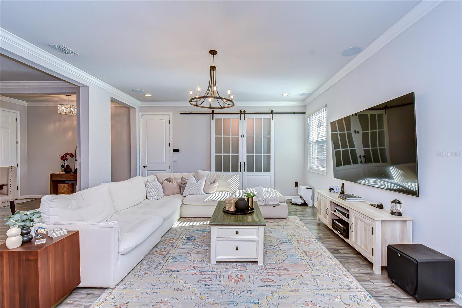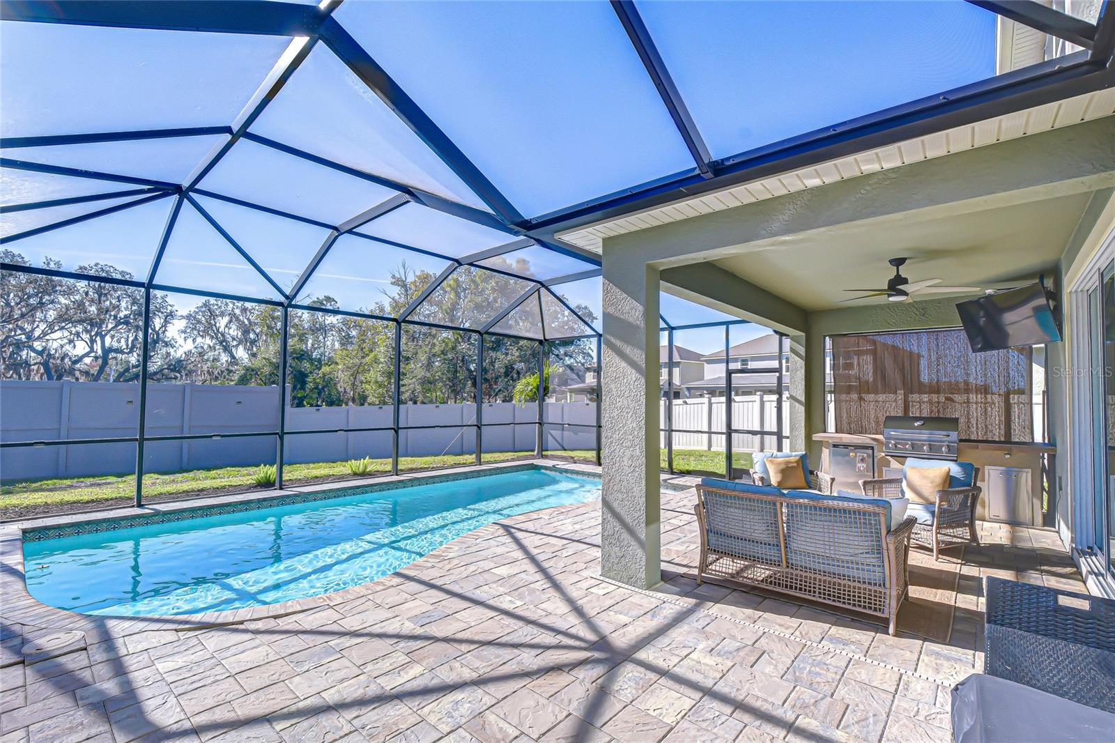 Welcome to this beautifully appointed home in the sought-after, gated Boyette Park community. Tucked away on a quiet loop street with no through traffic, this saltwater pool home sits on an oversized pie-shaped homesite with no backyard neighbors, offering exceptional privacy. From the stone-accented elevation and paver driveway to the lush, upgraded landscaping, this home makes an immediate impression. Inside, an open and light-filled floor plan awaits, featuring ceramic tile wood plank flooring throughout the main living areas. The kitchen is thoughtfully designed with 42” wood cabinetry with soft-close drawers and upgraded hardware, granite countertops, a large center island, undermount sink, spice cabinet, tile backsplash, upgraded stainless steel appliances, and enhanced lighting. A generously sized walk-in pantry is conveniently located under the stairs. The kitchen flows seamlessly into the great room and breakfast nook, making it ideal for everyday living and entertaining. Custom barn doors off the great room lead to a private flex space, perfect for a home office, playroom, or gym. Upstairs, a spacious loft provides a second living area with endless flexibility. The primary suite features a private en-suite bath and his-and-hers walk-in closets with custom organizational cabinetry. Three additional bedrooms are generously sized and share a full bath. This home is equipped with an ELAN smart home panel with four cameras and a 7.1 surround sound system throughout, including the covered lanai—perfect for entertaining. The laundry room includes built-in cabinetry and a utility sink for added convenience. The three-car garage offers Wi-Fi-enabled garage door openers, a dedicated workshop area, speckled epoxy-style flooring, built-in cabinetry, and EV charger hookup ready. Step outside to the screened lanai and enjoy the beautiful saltwater pool and outdoor kitchen, creating the ultimate outdoor retreat. With no direct backyard neighbors, this space offers both privacy and the perfect setting for gatherings with family and friends. This community offers an exceptional lifestyle, featuring the added security of gated living along with the convenience of lawn and exterior maintenance. Residents also enjoy resort-style amenities including a community pool, playground, splash pad, covered pavilion, dog park, and a peaceful seating area overlooking the pond—perfect for enjoying Florida’s natural beauty. Ideally located near restaurants, shopping centers, and grocery stores, with easy access to the interstate, this home truly combines comfort, convenience, and community living. Schedule your private showing today and experience all that Boyette Park has to offer.