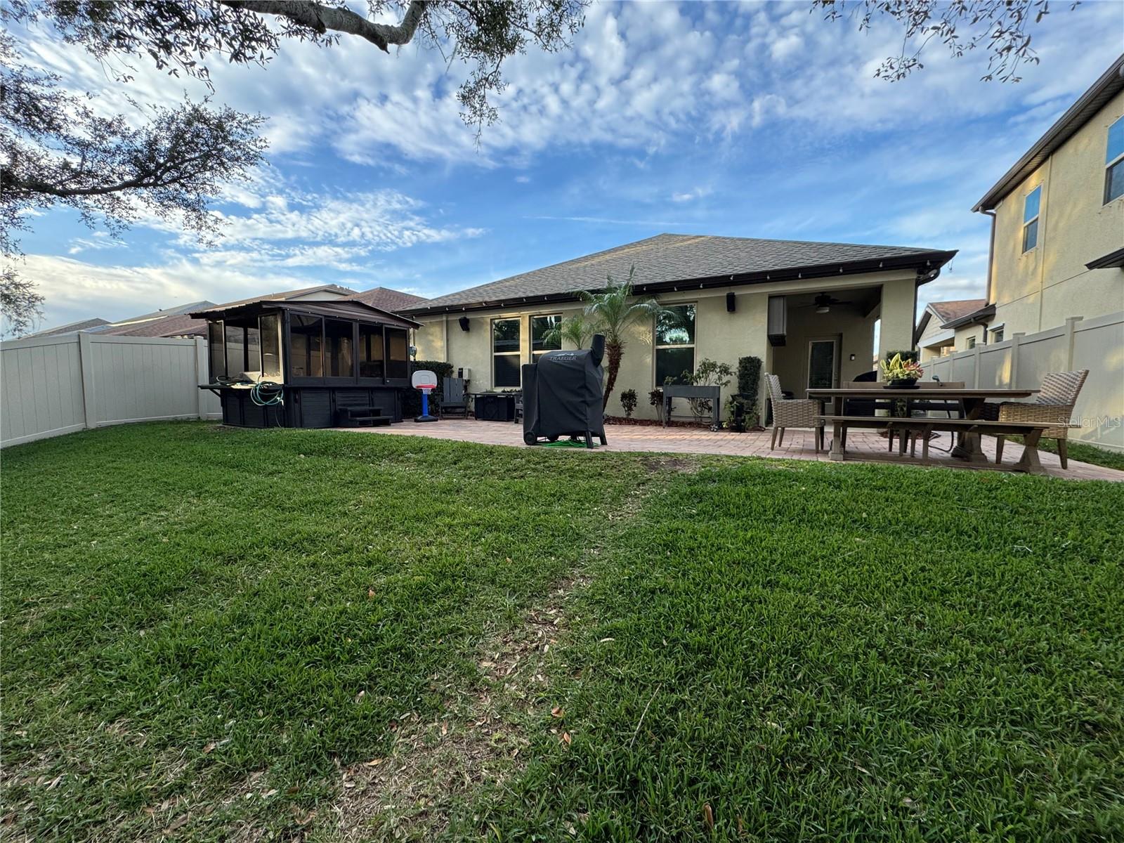 This beautiful one owner home features 2 BONUS/FLEX spaces to use in many ways in the highly desirable, well maintained GATED community of Mariposa. Situated perfectly within 5 minutes of I-75/Crosstown Expessway and US 301 corridor near everything N Riverview/Tampa has to offer. BRAND NEW roof installed January 2025 for peace of mind going forward, along with gutters on entire home. Beautiful stone elevation, pavered driveway and home sits on a 150' deep private lot. As you enter the home, you'll find the 1st BONUS ROOM/OFFICE with double doors for privacy if necessary. The wide open great room is nice size with custom built-in entertainment area with equipment storage, mood lighting and full panel glass door leads to rear lanai and backyard. Kitchen features 42' cabinets w/crown, tile backsplash, under cabinet lighting, island with seating and power, pendant lighting, walk-in pantry, double oven, cooktop and stainless appliances. Dining area includes bar area and can accommodate a nice size table for wide open entertaining. Laundry room is adjacent to kitchen with built-in cabinets and sink. Bedrooms 2 and 3 share bath 2 with dual sinks, corian countertops and tub shower combination. ADDITIONAL BONUS ROOM located at rear of home, currently used as playroom is great size and features double doors, again for privacy and quiet if necessary, with full panel glass door to exterior patio. Great size Primary bedroom is light and bright and features en-suite bathroom, dual sinks, corian countertops, walk-in shower, 2 walk-in closets and 2 linen closets. The backyard feels like an oasis, with pavered patio area, enclosed HOT TUB, fully fenced yard with 2 gates and exterior lighting. Seller has upgraded this home with tons of smart home technology, whole home wifi extenders, some rooms have motorized blinds, speakers, cameras, too much to list. Additional upgrades include landscape lighting, HVAC w/fresh air intake and dehumidifier, hurricane shutters, irrigation front and back. Mariposa is impeccably maintained, NO CDD and offers resort-style amenities including a pool, clubhouse, playground, indoor/outdoor entertaining areas with grills, and bar space. Shopping, dining, entertainment and schools are all within close proximity. Schedule your private appointment today!