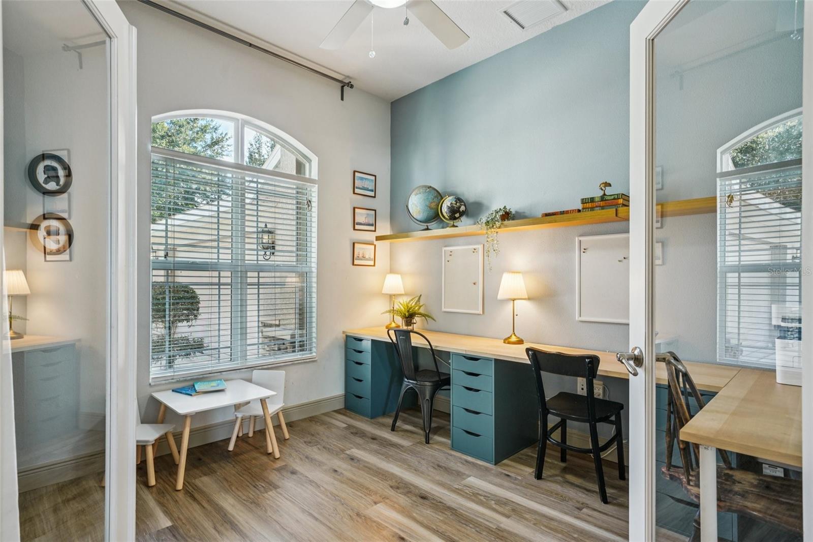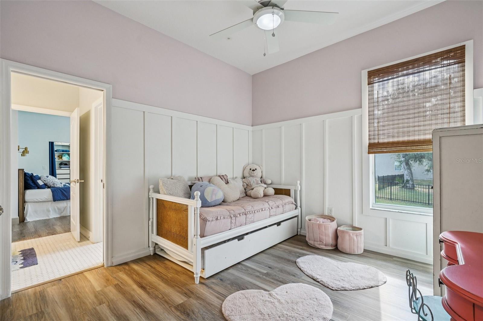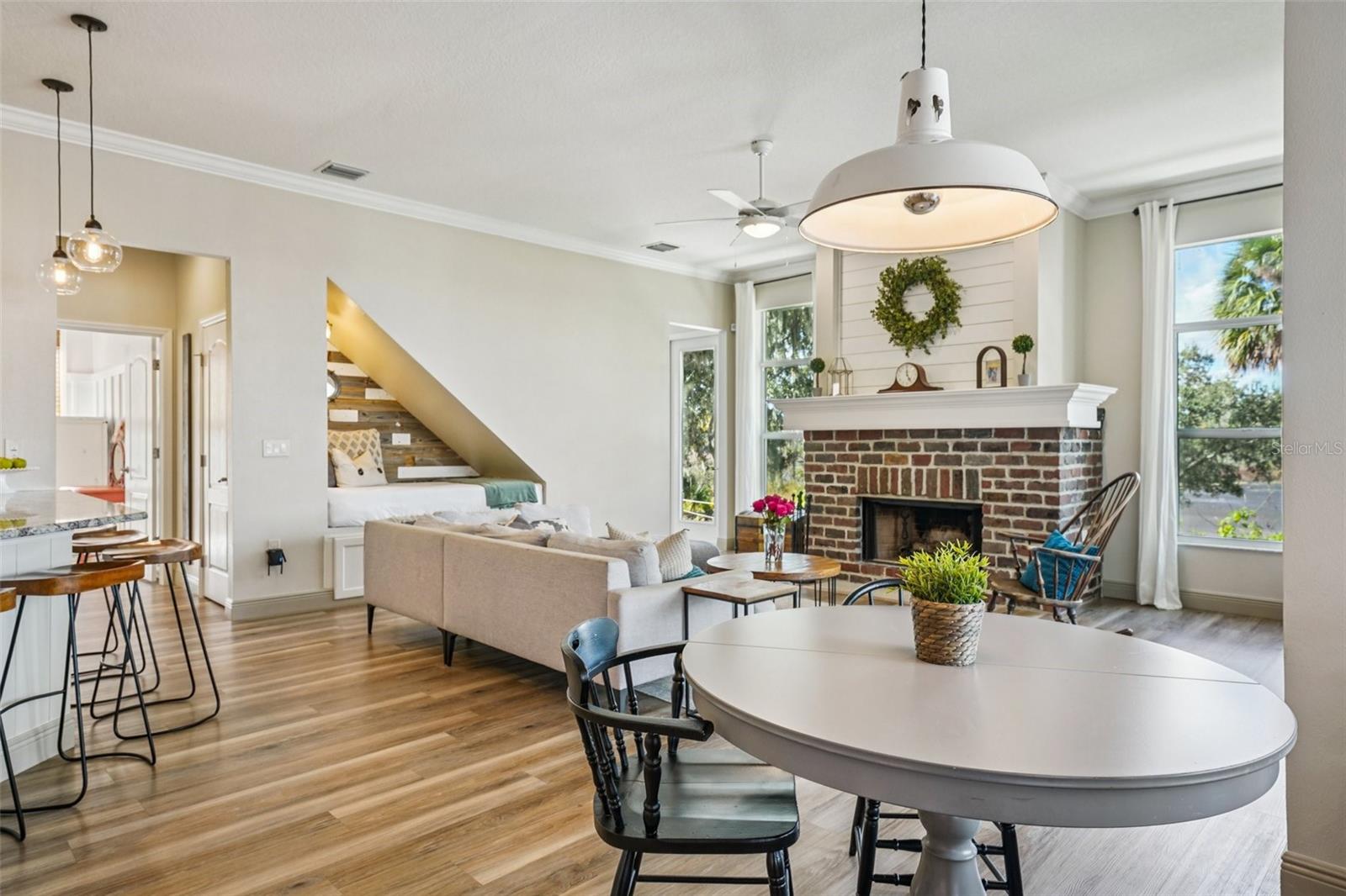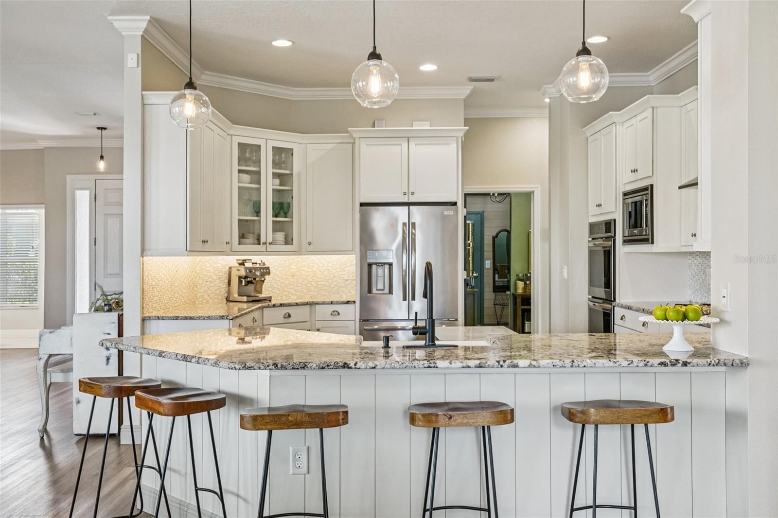 Located in a private gated community on a breathtaking 2.43-acre oversized conservation homesite with direct access and panoramic views of Shadow Lake is this exceptional 2-story residence. Mature oak trees, lush landscaping, and a courtyard-entry 3-car garage with coach lights create striking curb appeal, while the upgraded open deck design (no corner column) and pocket sliding glass doors maximize uninterrupted lake and nature views. The great room showcases a stunning custom wood-burning fireplace built with authentic bricks reclaimed from the historic streets of Ybor City, flanked by large side windows to frame the water views. A custom shiplap mantle with hidden electrical outlet, built-in lighting, and outlets on both sides of the fireplace add both beauty and function. A charming, lighted book nook creates a cozy retreat within the living space. Elegant 5¼" crown molding in the family room, dining room, and foyer, along with upgraded base trim, enhances the home’s architectural detail throughout. Luxury CoreLuxe 5mm waterproof rigid vinyl plank flooring in the San Fernando Hickory finish flows throughout the first floor, with extra material available for the staircase or upstairs bonus room. Storage is abundant with an extended, oversized pantry, spacious laundry room, and well-designed closets featuring swinging doors in the main bedrooms. The gourmet kitchen is a true centerpiece, featuring GE Café appliances, white painted maple shaker-style cabinetry with 42" uppers and crown molding, Level 3 “Alaska Delicatus” White Diamond granite countertops, custom under-cabinet lighting and outlets, a large breakfast bar with generous seating, and a separate breakfast nook. The first-floor primary suite offers tranquil lake views and a spa-inspired bath with a corner 6' garden tub, a fully enclosed shower with a Mr. Steam Thermasol SAA-240 steam unit (unit present, replacement needed for functionality), and a custom double vanity with designer mirrors. Outdoor living is equally impressive with covered and rear porches, an upgraded open deck, fire pit, outdoor kitchen with grill, private irrigated yard, mature oak trees. The spectacular 21’ x 17’ all-cedar Rainbow Clubhouse Package II play set come with a penthouse, monkey bars, rock wall, slide, fort, flower boxes, and hammock swing—professionally installed in November 2024 and backed by a lifetime cedar warranty. A whole-house generator and Energy Star aluminum-framed double-pane windows complete this remarkable lakefront retreat. Don’t miss your chance to make this gem your own—schedule a private tour today!