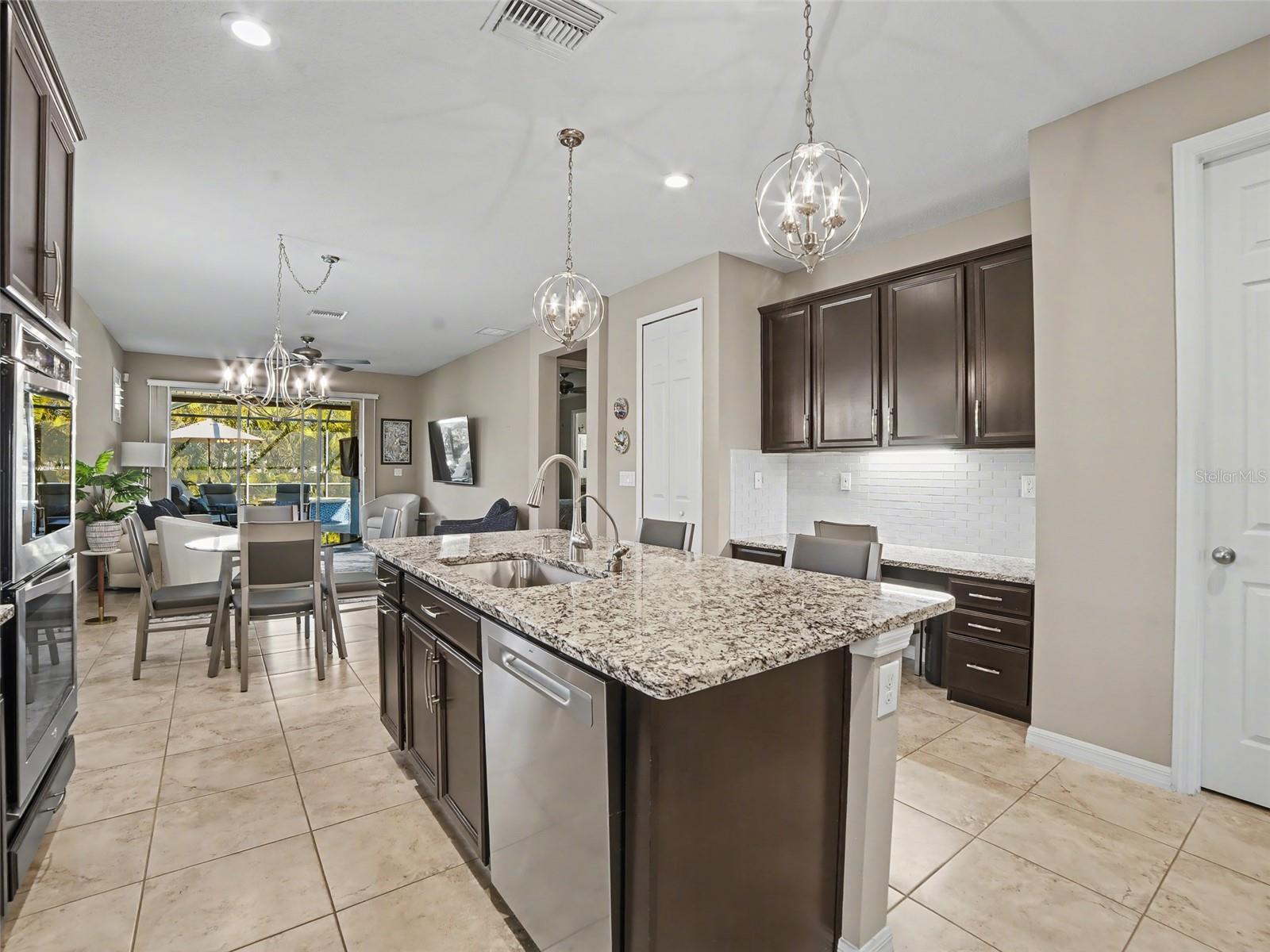 WELCOME TO PARADISE at The Reserve at Pradera, one of Riverview’s most desirable communities! This beautifully maintained 3-bedroom, 2-bath, 2-car garage, single-story Beazer St. Augustine II model is truly move-in ready and perfectly positioned on a quiet cul-de-sac. The home sits on a premium oversized pie-shaped lot with no backyard neighbors, offering exceptional privacy along with a heated swimming pool and spa, brick paver lanai, and extended screened patio—ideal for year-round Florida living. Step inside to a welcoming foyer that opens to a versatile formal sitting room, library, or flex space, perfect for a home office, playroom, or additional living area. Elegant plantation shutters on all windows and ceramic tile flooring throughout the main living areas enhance both style and durability, with carpeted bedrooms providing comfort and warmth. The open-concept floor plan is ideal for entertaining, seamlessly connecting the living, dining, and kitchen areas. Triple sliding glass doors flood the space with natural light and showcase beautiful views of the backyard and sparkling pool. The gourmet kitchen is a chef’s dream, featuring granite countertops, a large center island, stainless steel appliances, Moen fixtures, 42-inch cabinetry with crown molding, and a white subway tile backsplash. With two pantries and a convenient built-in workspace, this kitchen offers both style and functionality. The kitchen flows effortlessly into the casual dining area and spacious living room—perfect for gatherings of any size. The primary suite is massive and designed as a true retreat, offering ample space for a California King bed, a sitting or TV nook, and tranquil pool views. The spa-like ensuite bathroom features dual vanities with Moen faucets, a luxurious soaking tub with decorative listello tile, a step-in spa-style shower with listello accents, and an exceptionally large walk-in closet that feels like its own room. Two additional bedrooms are generously sized and share a well-appointed guest bathroom complete with granite countertops, vanity area, tub/shower combination with decorative listello tile, and Moen fixtures. Additional interior highlights include an indoor laundry room with cabinetry (washer and dryer convey), ample storage throughout, and impressive energy efficiency with an ENERGY STAR HERS Index of 54. Step outside to your private backyard oasis, complete with: In-ground heated pool and spa Automated pool cleaning system Jandy remote control for all pool and spa functions Programmable color pool and spa lighting No homes behind you, providing peaceful views and exceptional privacy Residents of The Reserve at Pradera enjoy resort-style amenities, including a sparkling community pool with splash pad, cabana, basketball courts, walking trails, dog park, playground, and expansive green spaces. Conveniently located near US Highway 301 and I-75, this home offers quick access to downtown Tampa, MacDill Air Force Base, Tampa International Airport, as well as shopping, dining, and top-rated schools. This exceptional home will not last—schedule your private showing today!