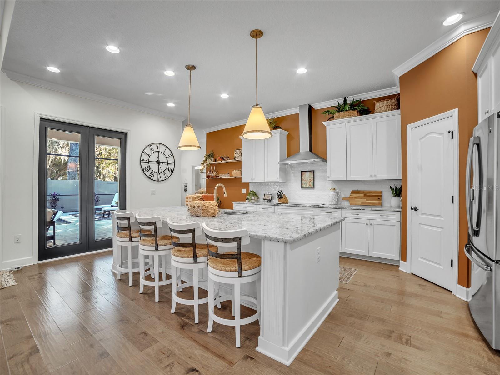 Welcome home to this exceptional Sunrise Homes Fairview Breeze floor plan, located in the prestigious Hickory Breeze community—a boutique enclave of just 24 homes surrounded by majestic oak trees. Perfectly positioned on a north-facing 0.23-acre homesite with 80 feet of frontage, this residence offers no CDD fees, low HOA dues, FishHawk Ranch schools district. From the moment you arrive, striking curb appeal sets the tone with a Craftsman-style façade, brick-paver driveway and porch, double glass designer entry doors, elegant coach lighting, rain gutters, and lush professional landscaping. Mature oaks and manicured tropical plantings frame the property, while low-maintenance sprinkler and drip irrigation systems ensure year-round beauty. Inside, the home showcases a wide-open spacious floor plan, soaring ceilings, 5.25-inch baseboards, recessed and designer lighting, and extensive crown molding throughout. The expansive gathering room features rich wood-look tile flooring, a tray ceiling in the foyer, surround sound pre-wiring, and two French door style windows and one set of French doors that flood the space with natural light and seamlessly connect to the screened lanai—perfect for entertaining or relaxing. A dedicated office/study with tray ceiling, plantation shutters, while the formal dining room accommodates large gatherings with style. The gourmet kitchen is a chef’s dream, featuring a large entertaining island with seating for four, granite countertops, white 42" cabinetry with soft-close drawers, white subway tile backsplash, gold designer hardware, pendant lighting over kitchen island, a walk-in pantry, and a stainless steel appliances cooktop with hood, wall oven with convection settings, and built-in wall microwave. Widened walkways enhance accessibility. The owner’s suite is a private sanctuary with tray ceilings, a massive walk-in closet with custom shelving, and private French door access to the lanai and spa/swimming pool. The spa-inspired en-suite bath features granite countertops, a freestanding soaking tub, oversized walk-in shower with floor-to-ceiling designer tile, white luxury cabinetry, modern black fixtures, designer lighting for a true resort-style feel. This split bedroom floor plan offers privacy for family and guests, with three additional bedrooms and two beautifully appointed full baths, feature medium-brown cabinetry, granite countertops, square sinks, framed mirrors, and ceramic tile flooring, while all bedrooms enjoy ample natural light. The outdoor living experience rivals a private resort. A custom brick-paver pool deck and screened lanai frame a heated swimming pool with spa, sun shelf, and spa jets, creating a tranquil escape just steps from the owner’s suite. Thoughtfully positioned French doors allow seamless indoor-outdoor flow, perfect for intimate evenings or elevated entertaining. The vinyl-fenced backyard, enhanced with decorative rock landscaping, tropical plantings, and ambient lighting, offers privacy and refined style, while ceiling fans, coach lighting, and generous lounging areas complete this sophisticated Florida retreat—ideal for sunrise serenity or sunset gatherings. For those seeking convenience, comfort, and elegance, this home is fully prepped for smart-home integration, including pool automation, lighting controls, and home security, iAquaLink pool controls, Nebula pool lighting system, integrated pool cage, HVAC system with UV sanitation, water softener.