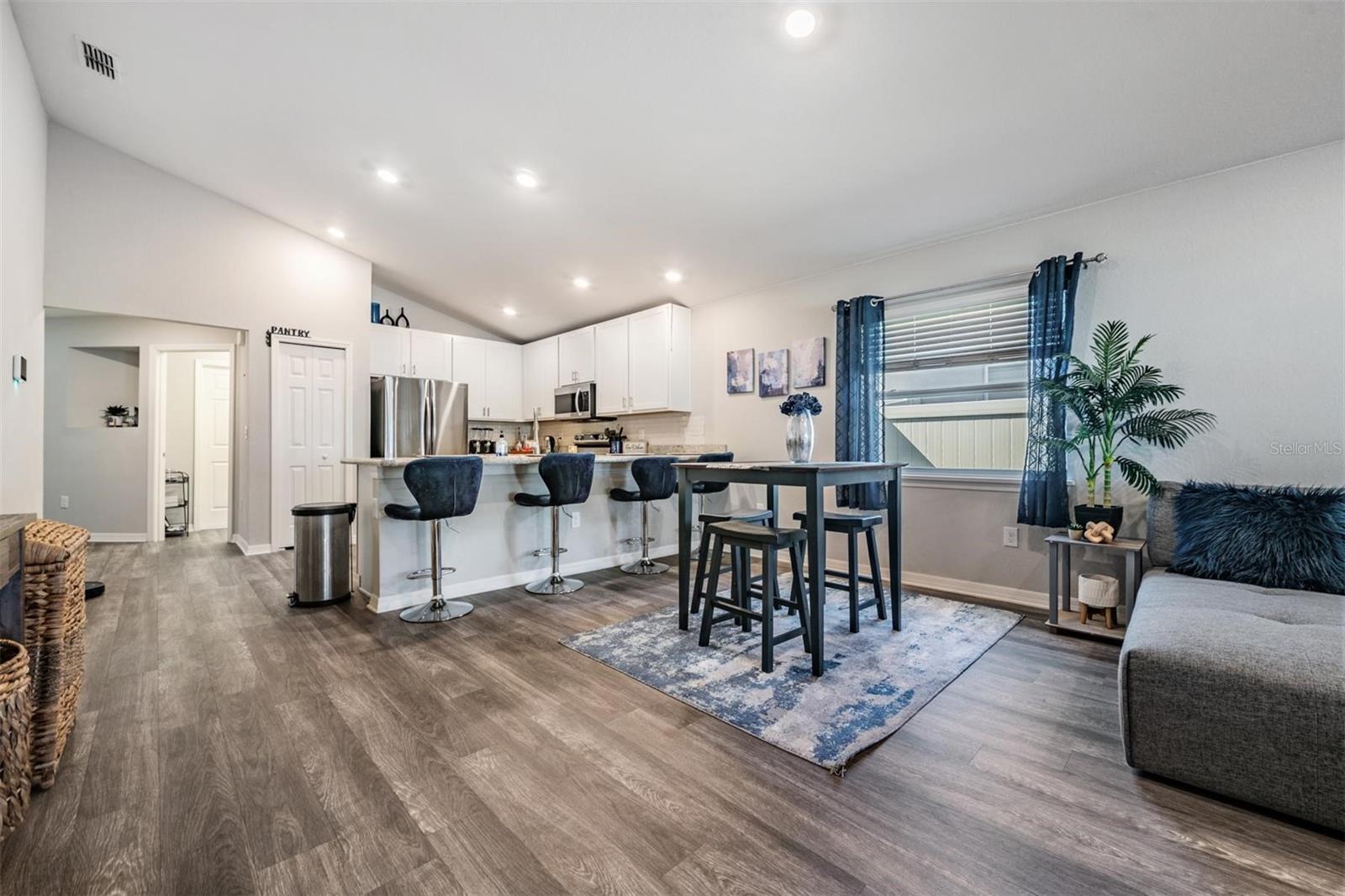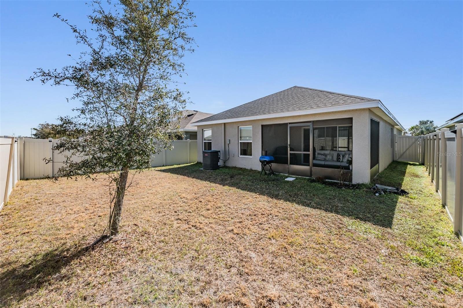 Built in 2022 and beautifully maintained, this move-in ready 3-bedroom, 2-bath home offers a bright open-concept layout designed for comfortable everyday living. The spacious kitchen features white shaker-style cabinetry, stainless steel appliances, a large center island with seating, and generous counter space overlooking the main living and dining areas — perfect for entertaining or staying connected. Vaulted ceilings and recessed lighting enhance the airy feel throughout the main living space. The private primary suite includes a walk-in closet and an en-suite bath with dual sinks and a glass-enclosed shower. Step outside to enjoy the covered and screened lanai, ideal for relaxing year-round. The fully fenced backyard provides privacy and space for pets or play, while still remaining low maintenance. Additional highlights include a 2-car garage, neutral finishes throughout, and newer 2022 systems for peace of mind. Conveniently located near shopping, dining, and major commuter routes, this home offers modern living in a growing Riverview community.