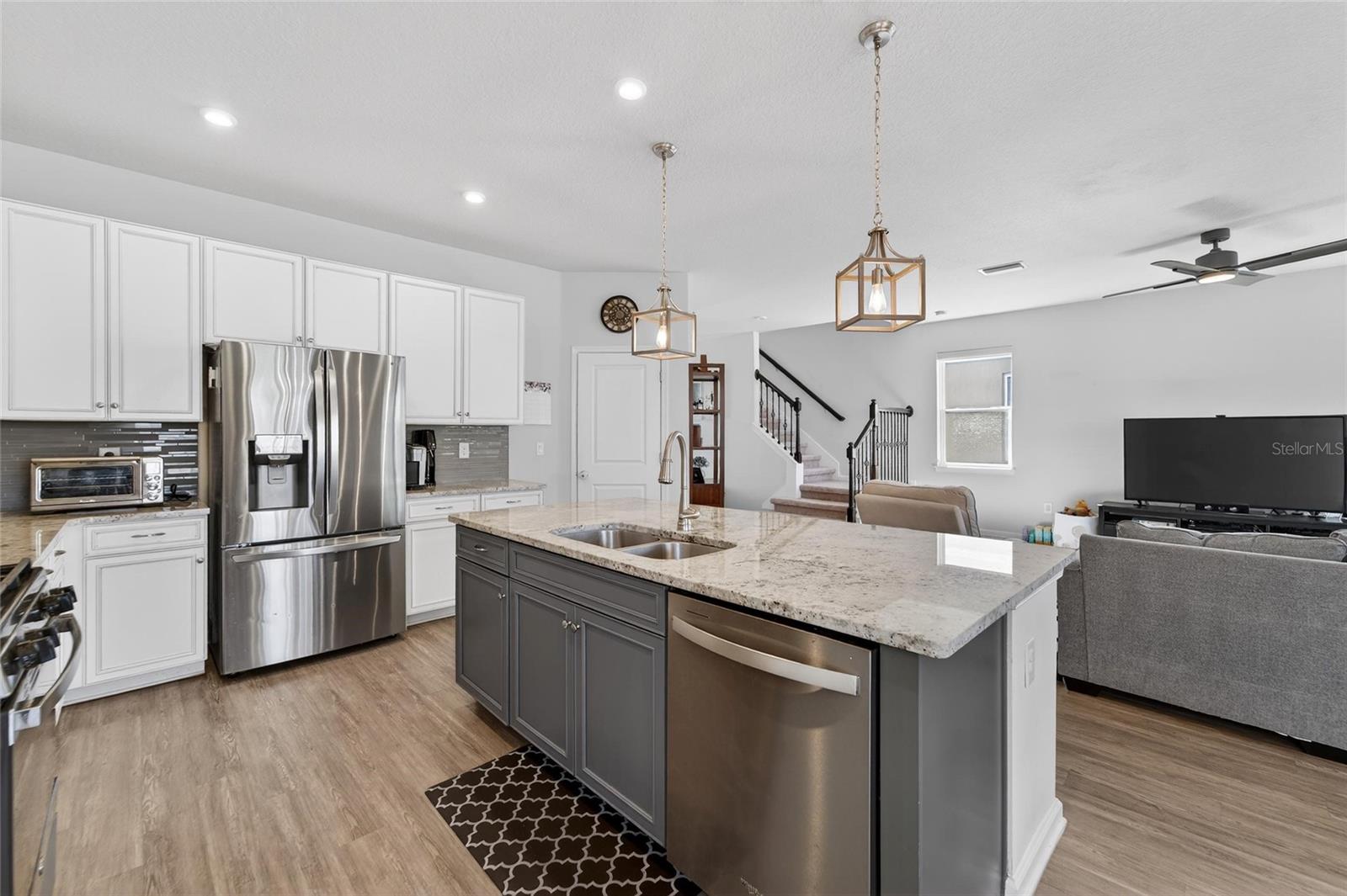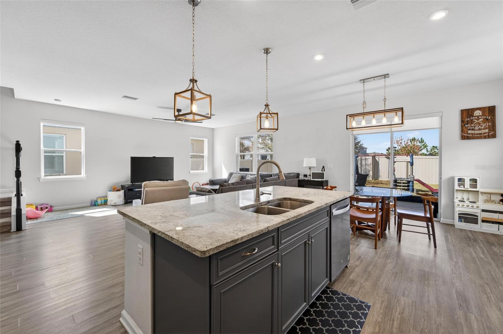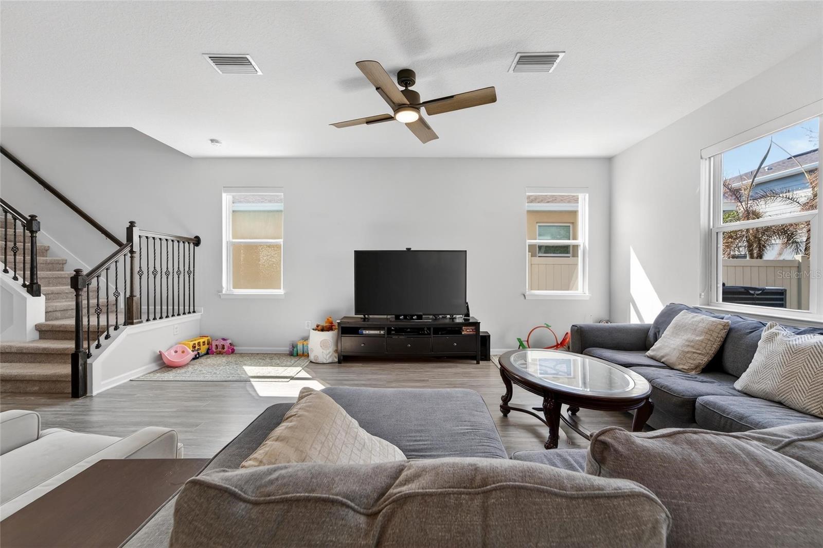 2020 BUILT HOME IN GATED LUCAYA LAKE CLUB — 4 BEDROOMS + OFFICE + LOFT! This PRACTICALLY NEW 4 bedroom, 2.5 bath home offers 2,446 square feet of thoughtfully designed living space in one of Riverview’s most desirable gated communities. With a functional layout and quality upgrades throughout, the home provides flexibility for both everyday living and entertaining. Inside, the OPEN-CONCEPT floor plan is filled with natural light and features beautiful VINYL FLOORING throughout the first floor. A dedicated office downstairs offers privacy for working from home, while the spacious upstairs loft provides additional living space ideal for a media room, playroom, or other flex space. The luxurious kitchen features a GAS RANGE, GRANITE countertops, SOFT-CLOSE SOLID WOOD CABINETRY stainless steel appliances, reverse osmosis water system, and a large center island with bar seating. The dishwasher is approximately 1.5 years old with a new garbage disposal recently installed. Upstairs, the primary suite includes TWO WALK-IN CLOSETS and a private bath with DOUBLE VANITY, dedicated vanity space, and a glass-enclosed walk-in shower with a NEW SHOWER DOOR. Updated faucets and towel holders have been installed in the bathrooms and kitchen, along with newer light fixtures and ceiling fans throughout the home for added comfort. The large SCREENED-IN LANAI features a roll-down shade screen for additional privacy and comfort during the warmer months. The fully FENCED backyard offers room to enjoy, and the existing playground can remain with the home if desired. This home also features a NEWER AC CONDENSER (2024), TANKLESS GAS WATER HEATER, owned water softener system, new garage storage shelving, and a driveway that was resealed in October. A post-hurricane inspection confirmed no storm impact, and the sellers report no loss of power during 2024 storms. Residents of Lucaya Lake Club enjoy access to a 78-ACRE BOATABLE LAKE, RESORT-STYLE POOL with tented cabanas, fitness center, clubhouse, guard house with gated lakeside access, central park, playground, SPLASH PAD, and floating dock. **Ask about the possibility of a VA assumable loan.