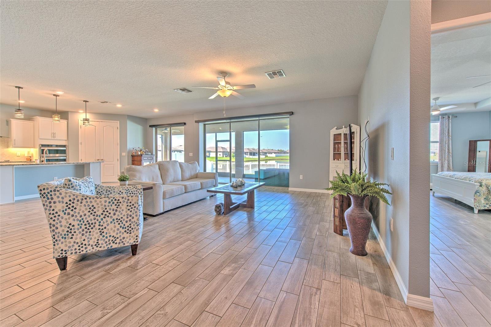One or more photo(s) has been virtually staged. Welcome to this 2020 Pulte build with serene sunset and water views! This generous 3 car garage, 6 bedroom, 3.5 bathroom home boasts an upstairs loft and media room in addition to the spacious downstairs living room, perfect for multigenerational living. As you walk into the proper foyer, you are greeted by three secondary bedrooms, a powder room, a full hallway bathroom, and a downstairs primary bedroom and ensuite bathroom with a massive walk-in closet. The open concept dining room, living room, and kitchen all have a West-facing view of the pond. This beautiful kitchen offers an oversized pantry, white kitchen island, and stunning under cabinet lighting. The 3 car tandem garage offers plenty of room for a home gym or to store all your toys, and off the garage is a convenient mudroom drop-off zone and an oversized laundry room equipped with cabinetry and a utility sink. Upstairs, the massive loft boasts a wet bar featuring a beverage fridge, dishwasher, sink, and full cabinetry, perfect for preparing morning coffee or movie night popcorn. Enter through double doors into the media room, offering a second large space for upstairs entertaining or generational living. The second floor is complete with two secondary bedrooms and a full bathroom. Enjoy the sunset and water views from the fully-fenced backyard with a generous screened-in lanai. The fence has solar light caps along the pond offering an upscale warm glow to the pond view. Located in the South Fork community with multiple resort-style pools, playgrounds, and a clubhouse, this home offers the ultimate Florida living.