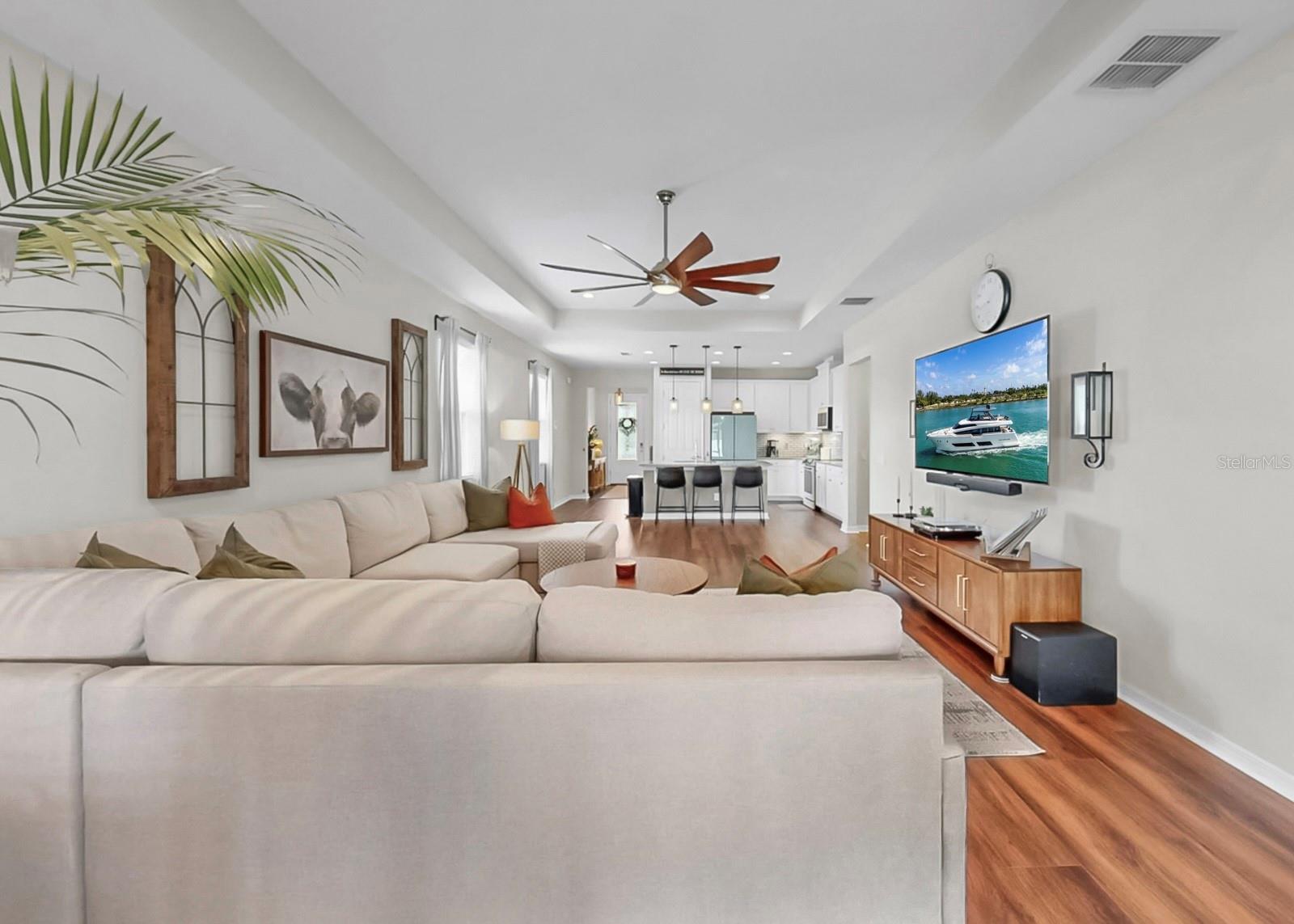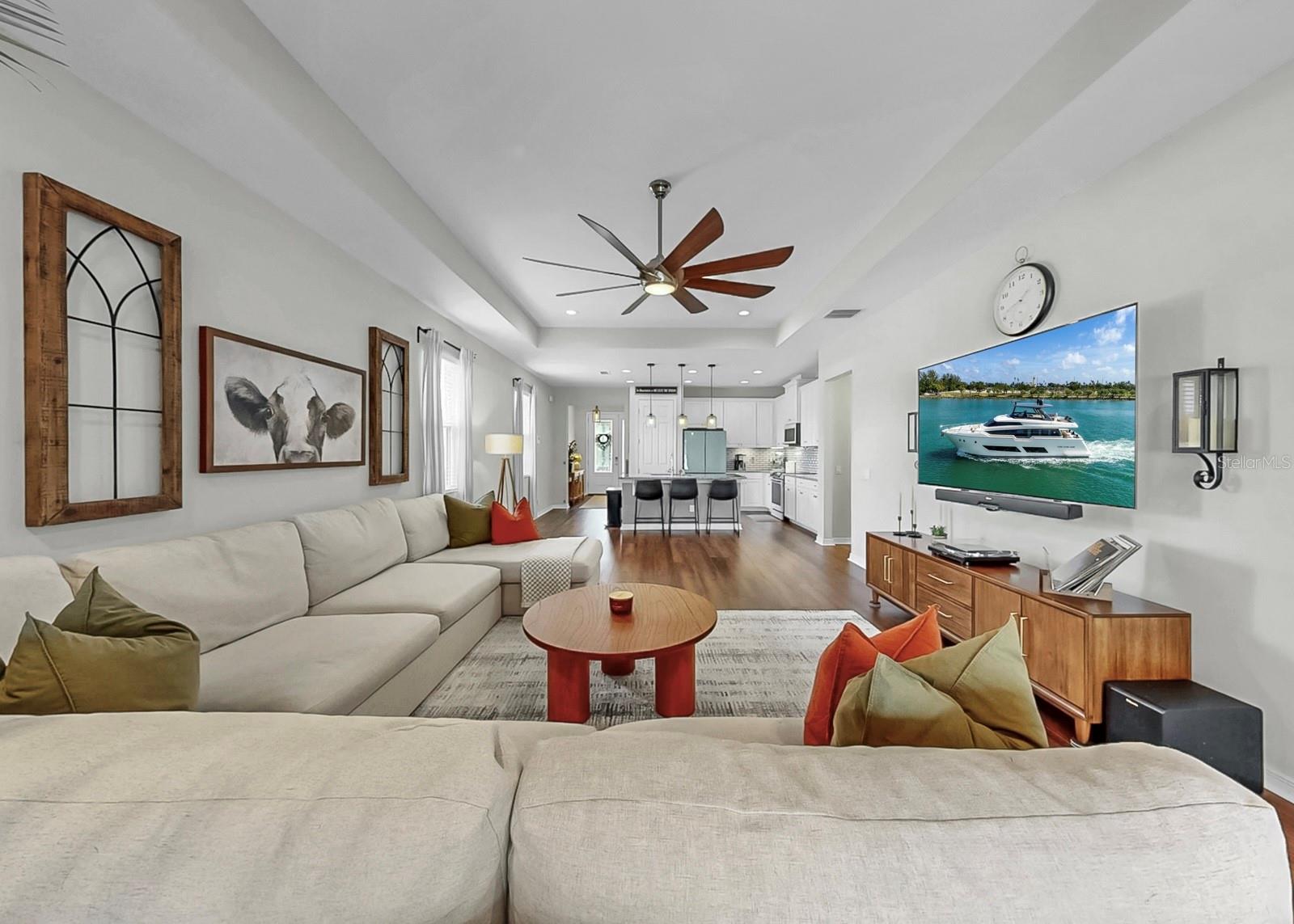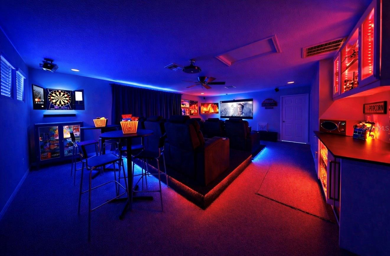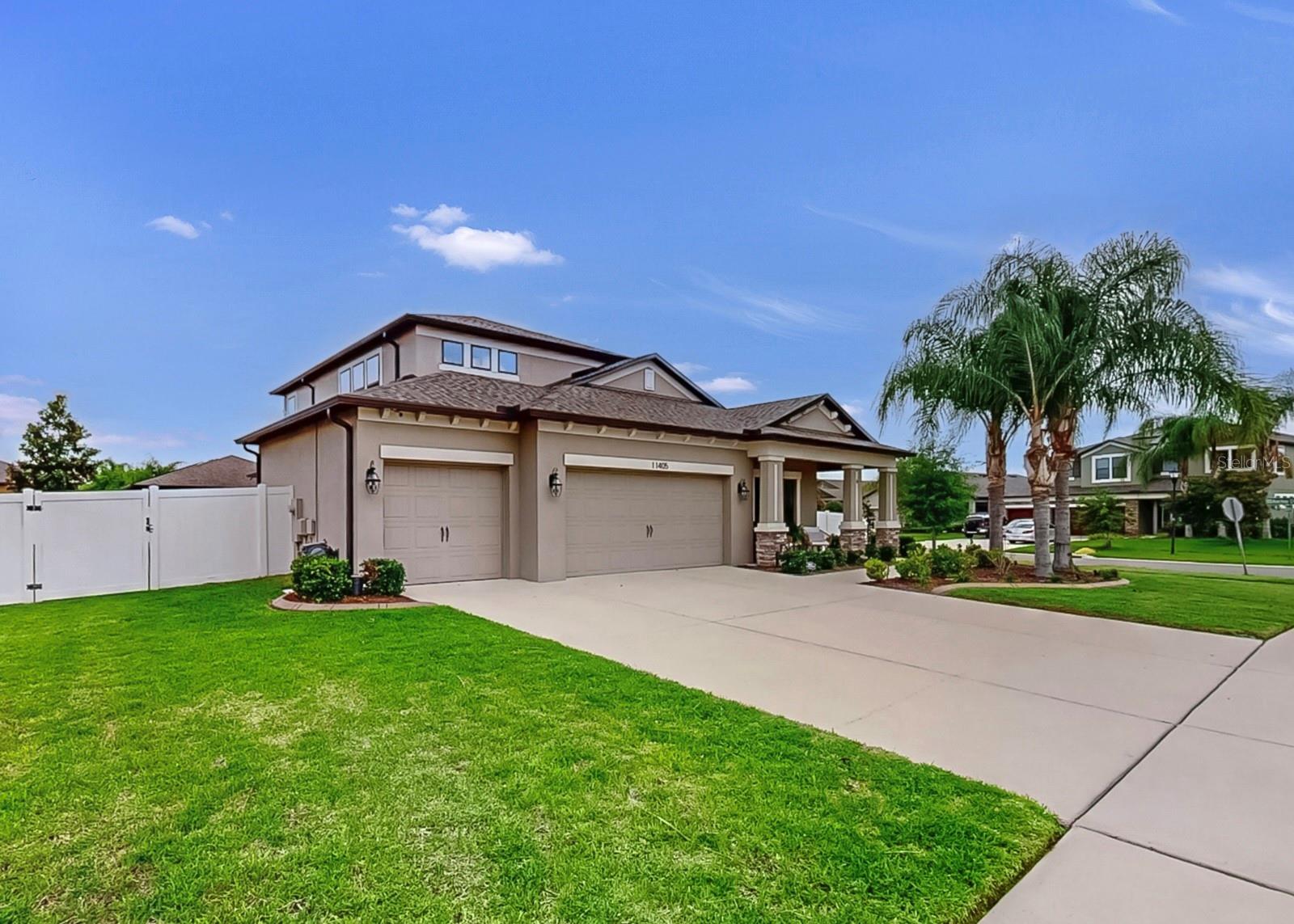 Welcome to one of the most unique & upgraded homes in South Fork Lakes Community with a Fully Upgraded NEW ROOF in 2025! Situated on the largest lot in the community and directly across from the amenity center, this M/I Picasso Bonus home offers a rare combination of space, convenience, and high-end customization that is nearly impossible to find at this price point. From the moment you enter, you will notice the difference. Soaring 10-foot tray ceilings, oversized 8-foot doors, and an open, thoughtfully designed layout create a sense of space and quality that stands apart from typical builder-grade homes. The home has been extensively upgraded throughout, including brand new luxury vinyl plank flooring with matching solid tread stairs, providing a seamless, modern look with durability built for real life throughout the entire lower level. The kitchen and main living areas flow effortlessly to the extended screened lanai, creating the perfect indoor-outdoor setup for Florida living. The lanai also features a commercial-grade stainless steel sink, making it ideal for grilling, entertaining, and easy cleanup. The kitchen features all new Samsung Bespoke Smart Appliances with interchangeable glass fronts. Smart features throughout the home for your convenience. One of the standout features of this home is the fully built-out upstairs bonus space, currently designed as a private home theater experience. Featuring elevated second-row seating, power reclining chairs, multiple display setups, smart lighting, and a dedicated snack and beverage area, this space delivers a true entertainment experience that will impress any guest. The theater setup is available as a negotiable feature, giving buyers the flexibility to move in with a fully equipped entertainment space or customize it to their own vision. Additional premium features include a rare three-car garage, upgraded finishes throughout, and a location that offers immediate access to the community pool, playground, gym, and recreational amenities just steps from your front door. This is not just another home in the neighborhood. It is a highly upgraded, move-in ready property designed for both everyday comfort and unforgettable entertaining. Homes with this combination of lot size, upgrades, and unique features rarely come available. This is a Must See Home - Schedule your showing today.