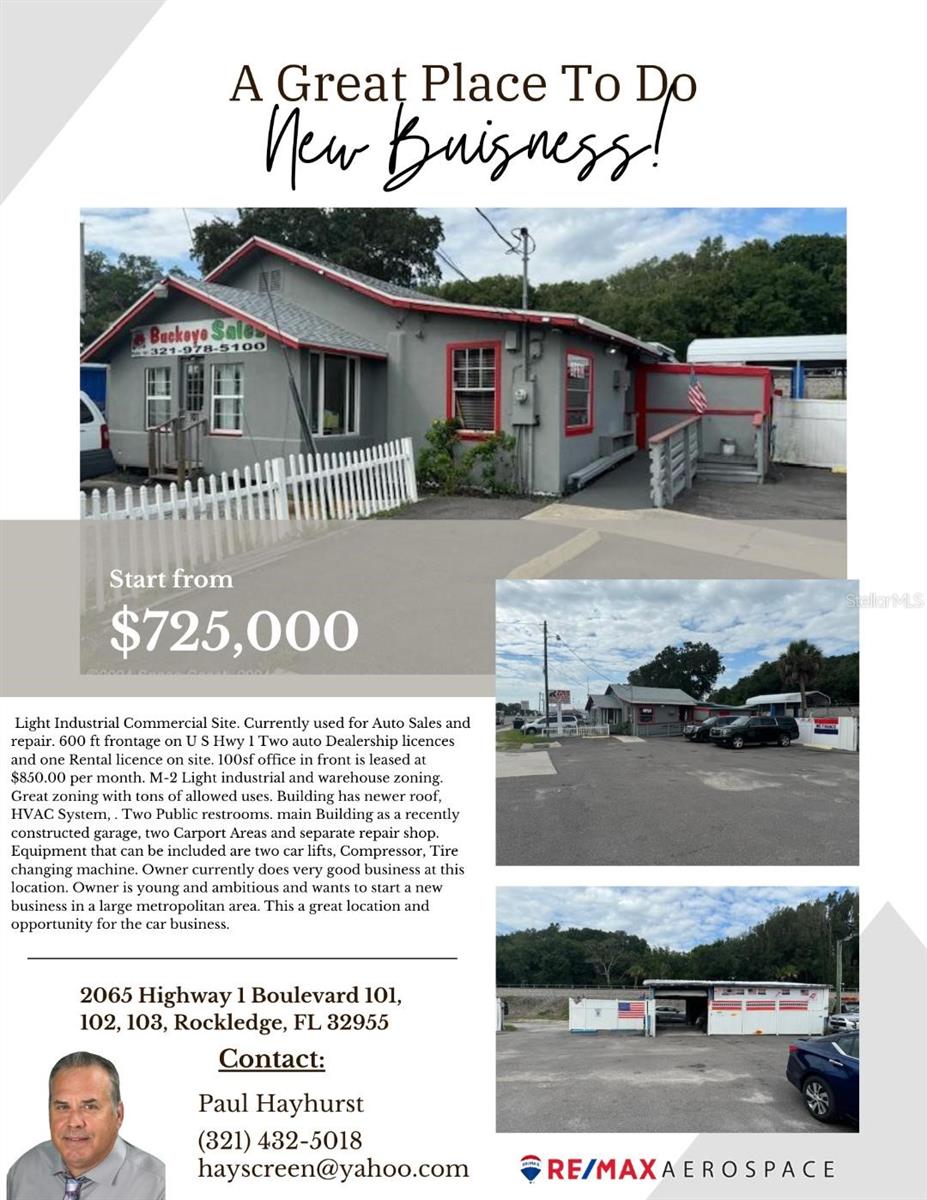 Commercial property for sale or lease. Extremely good exposure to U S Hwy 1 in Rockledge. Currently used as a Car sales lot with areas on site to repair and modify vehicles. But there are many other allowed uses at this location Owner plans to relocate his business to a different city. M-2 Light industrial and warehouse zoning. Great zoning with tons of allowed uses. Building has newer roof, HVAC System, . Two Public restrooms. There are, two Carport Areas and separate repair shop. Equipment that can be included are two car lifts, Compressor, Tire changing machine. Owner currently does very good business at this location. Owner is young and ambitious and wants to start a new business in a large metropolitan area. This a great location and opportunity for the car business.