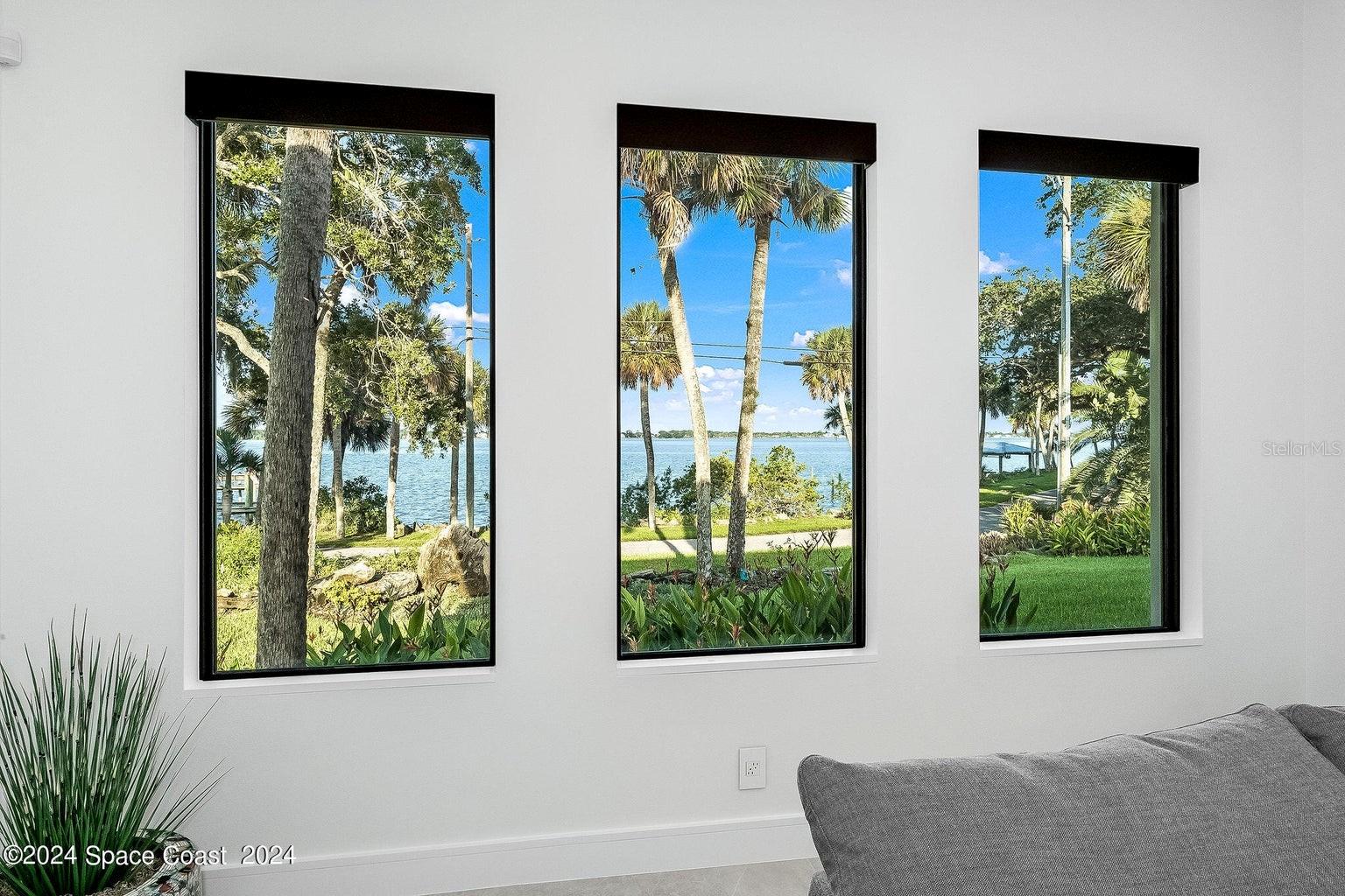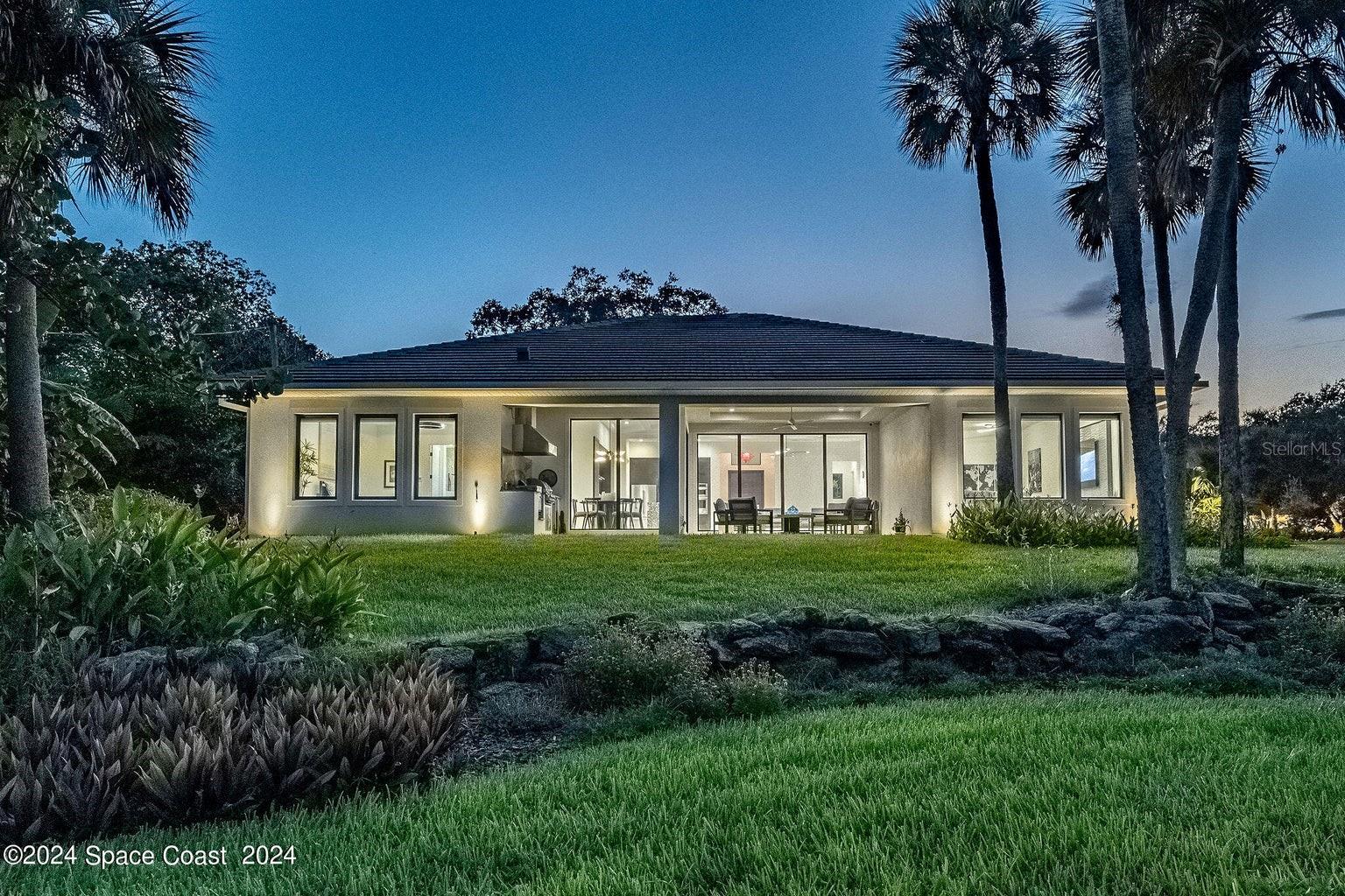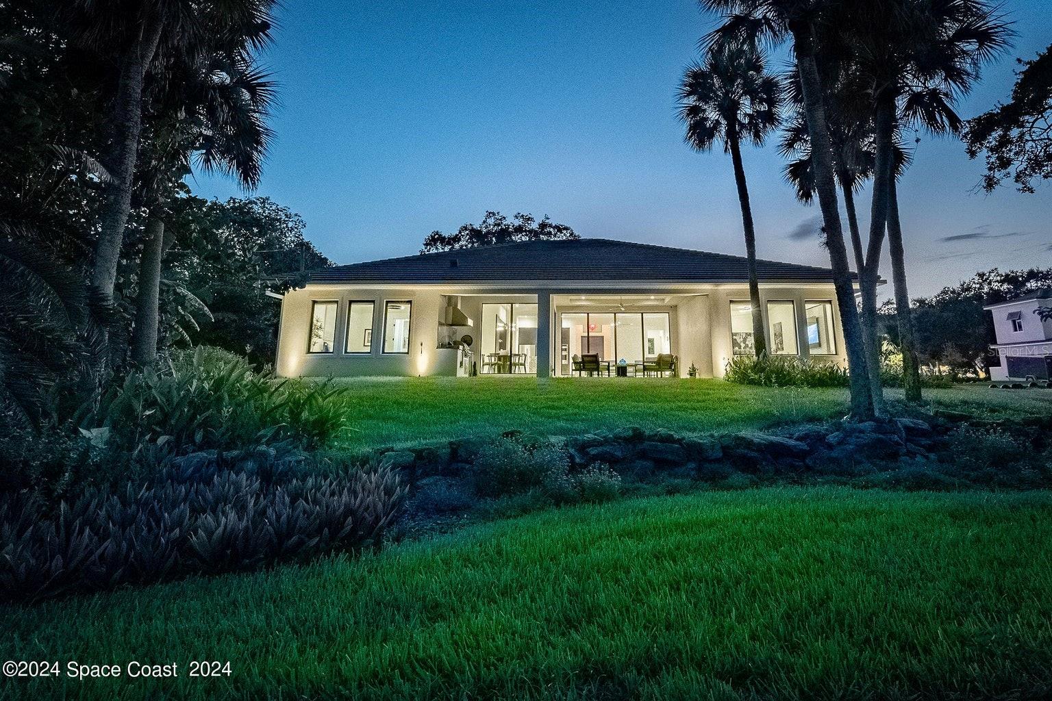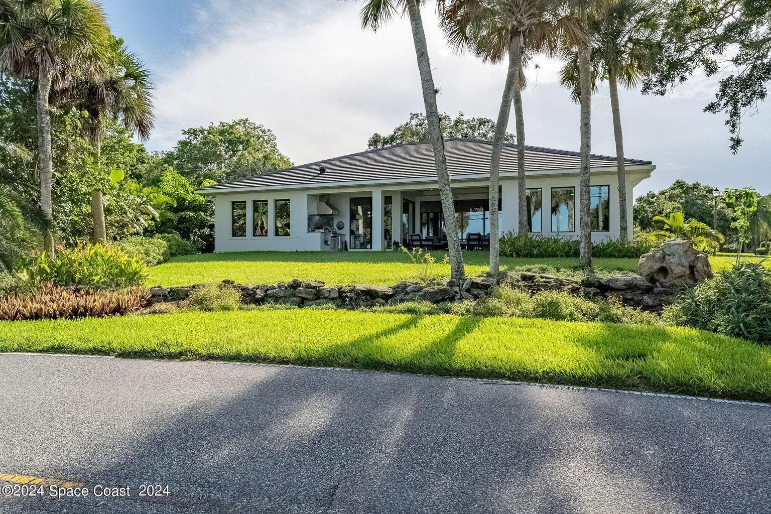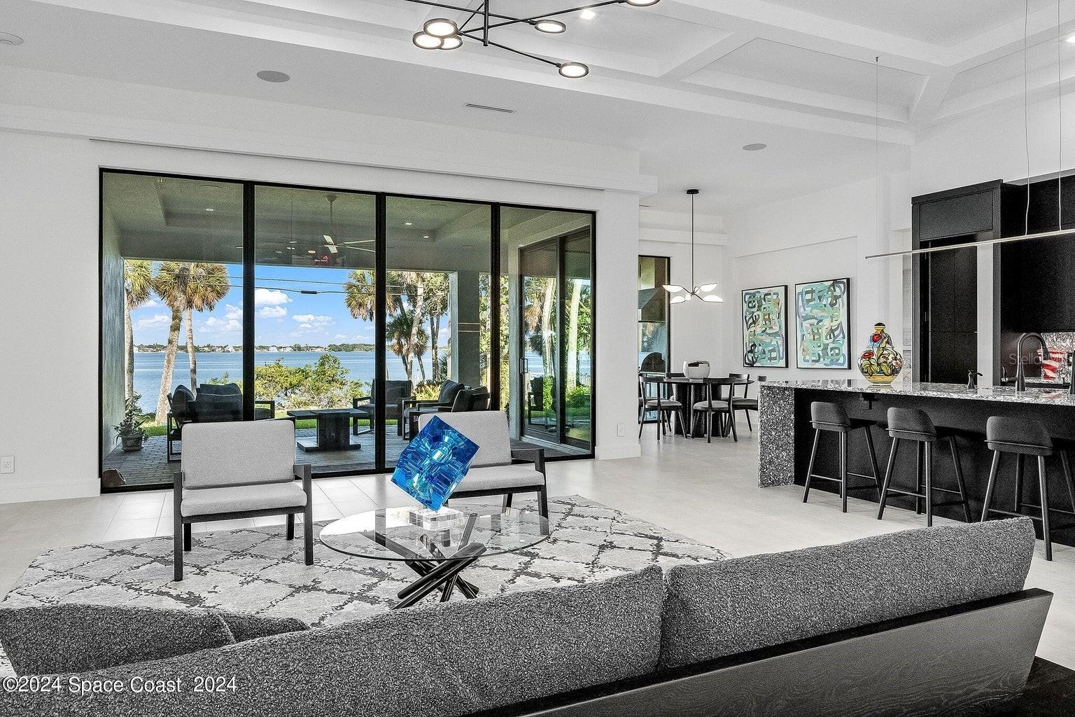 Beautiful custom-built home by Christopher Burton nestled on the Indian River, offering 4,946 total SF of refined living space. Entry features a hurricane-rated Mahogany door leading to a foyer illuminated by a hand-blown glass chandelier. Inside, Great Room boast 12FT ceilings, custom beams & an art wall w/ dimmable art lighting. Chef's kitchen includes top-tier JennAir appliances, a hidden pantry & Moen touchless faucet. Primary Suite is a luxurious retreat w/10FT ceilings, slipper tub, walk-in shower, Toto Washlet & custom Artistry closet. Entertainment at your fingertips in the Media Room w/ a 77'' OLED TV on custom backdrop. Step outside to a covered patio w/ river views & outdoor kitchen. Park your cars in the oversized 3 car garage. Advanced automation; motorized shades, Wi-Fi th/out, security sys, built-in speakers, whole-house generator. Sustainable features: Smart lawn irrigation & 50 AMP EV-ready. A Perfect blend of elegance & modern features w/ picturesque Riverfront views!