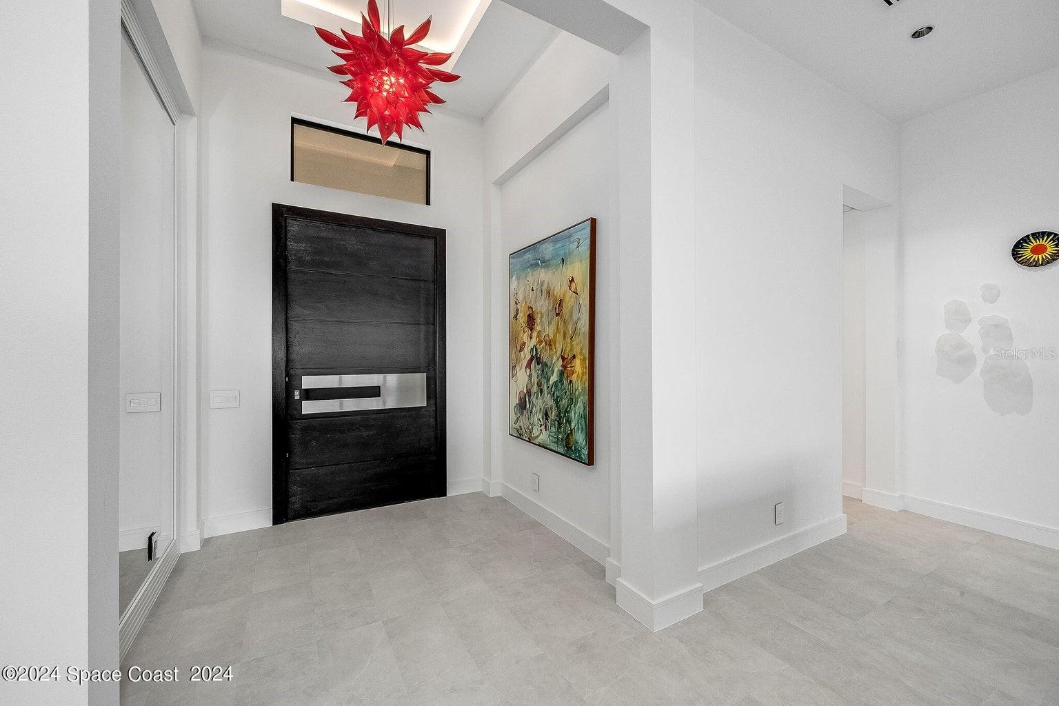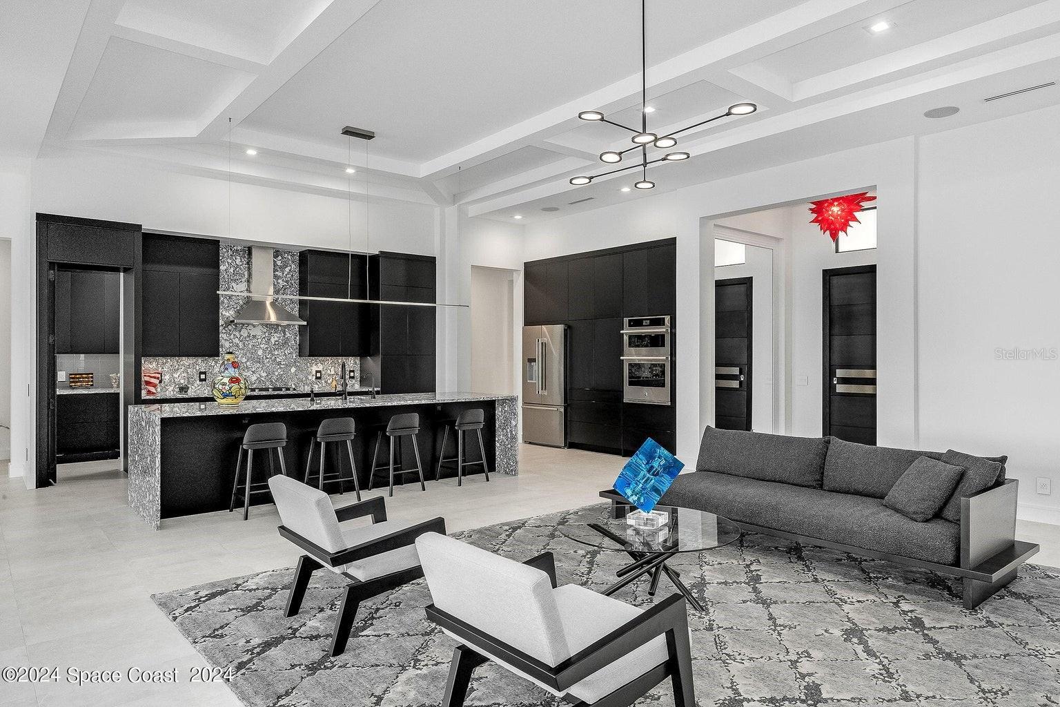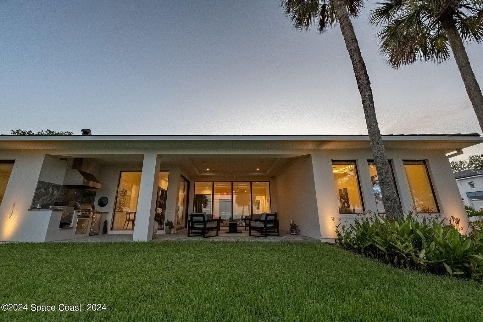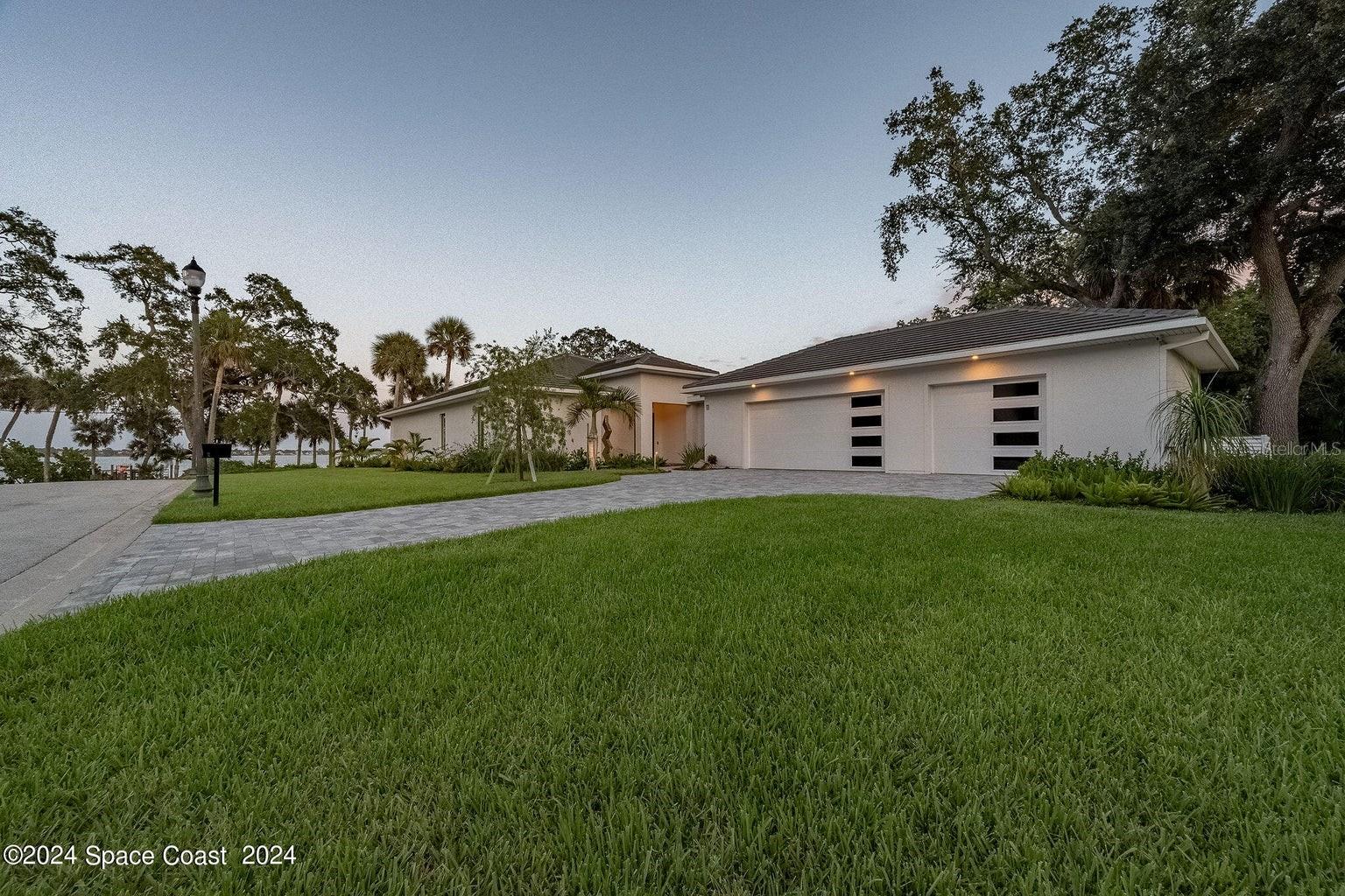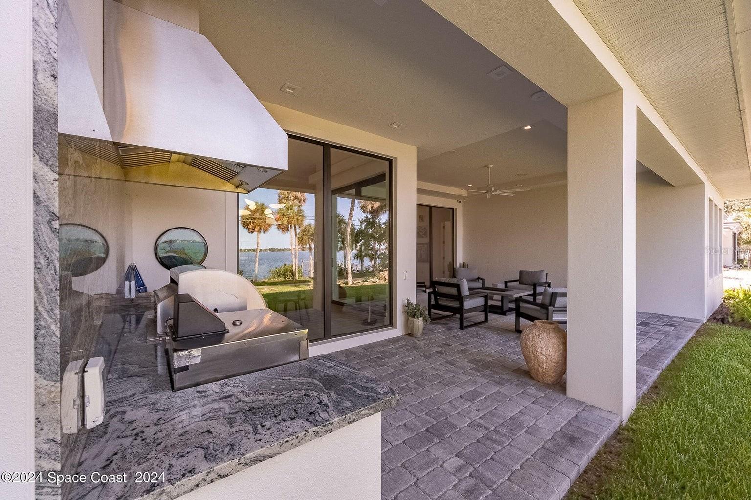 Beautiful custom-built home by Christopher Burton nestled on the Indian River, offering 4,946 total SF of refined living space. Entry features a hurricane-rated Mahogany door leading to a foyer illuminated by a hand-blown glass chandelier. Inside, Great Room boast 12FT ceilings, custom beams & an art wall w/ dimmable art lighting. Chef's kitchen includes top-tier JennAir appliances, a hidden pantry & Moen touchless faucet. Primary Suite is a luxurious retreat w/10FT ceilings, slipper tub, walk-in shower, Toto Washlet & custom Artistry closet. Entertainment at your fingertips in the Media Room w/ a 77'' OLED TV on custom backdrop. Step outside to a covered patio w/ river views & outdoor kitchen. Park your cars in the oversized 3 car garage. Advanced automation; motorized shades, Wi-Fi th/out, security sys, built-in speakers, whole-house generator. Sustainable features: Smart lawn irrigation & 50 AMP EV-ready. A Perfect blend of elegance & modern features w/ picturesque Riverfront views!