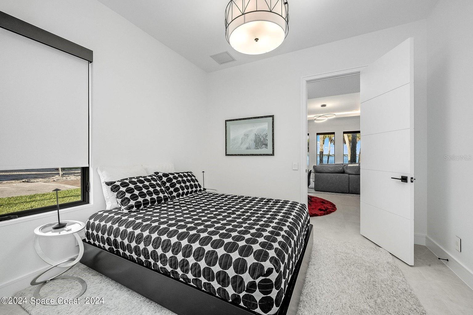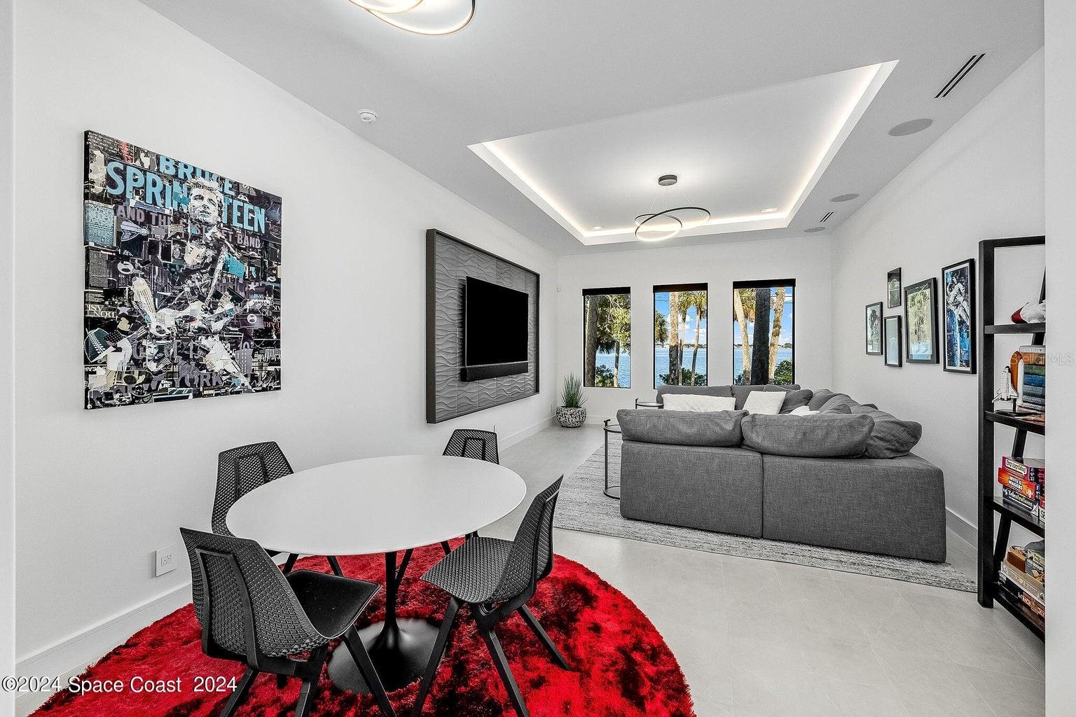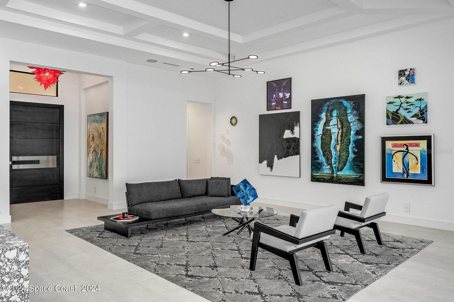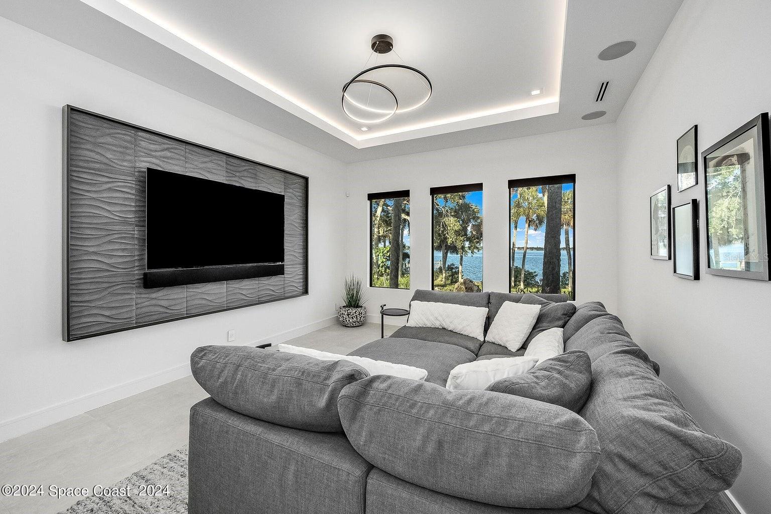Beautiful custom-built home by Christopher Burton nestled on the Indian River, offering 4,946 total SF of refined living space. Entry features a hurricane-rated Mahogany door leading to a foyer illuminated by a hand-blown glass chandelier. Inside, Great Room boast 12FT ceilings, custom beams & an art wall w/ dimmable art lighting. Chef's kitchen includes top-tier JennAir appliances, a hidden pantry & Moen touchless faucet. Primary Suite is a luxurious retreat w/10FT ceilings, slipper tub, walk-in shower, Toto Washlet & custom Artistry closet. Entertainment at your fingertips in the Media Room w/ a 77'' OLED TV on custom backdrop. Step outside to a covered patio w/ river views & outdoor kitchen. Park your cars in the oversized 3 car garage. Advanced automation; motorized shades, Wi-Fi th/out, security sys, built-in speakers, whole-house generator. Sustainable features: Smart lawn irrigation & 50 AMP EV-ready. A Perfect blend of elegance & modern features w/ picturesque Riverfront views!