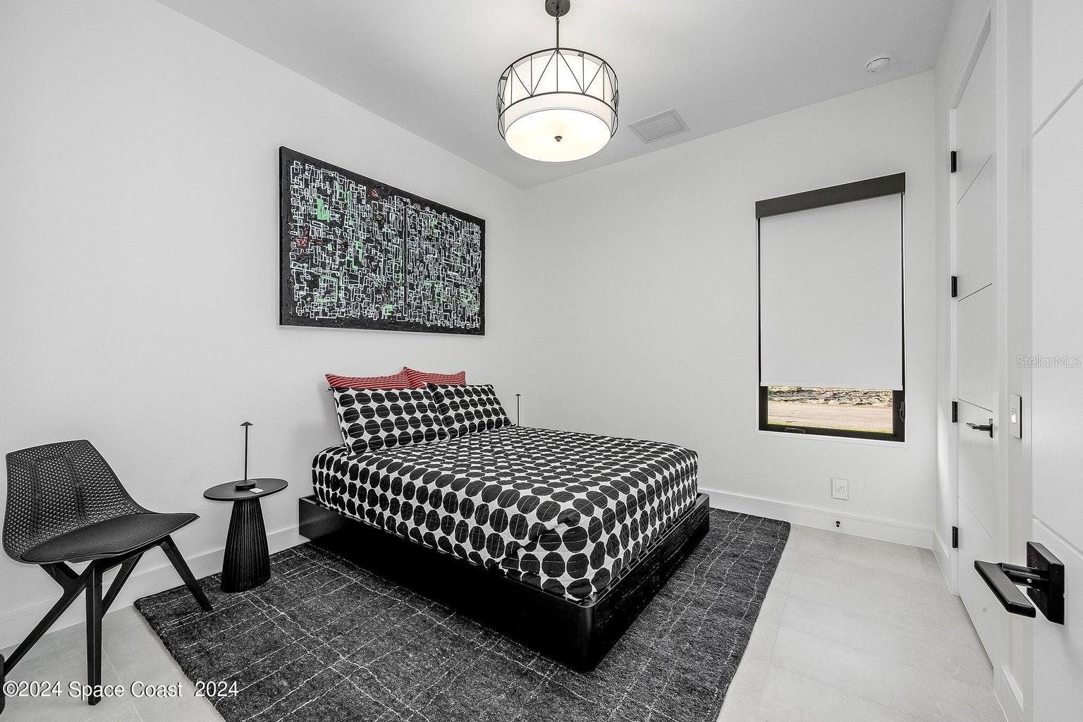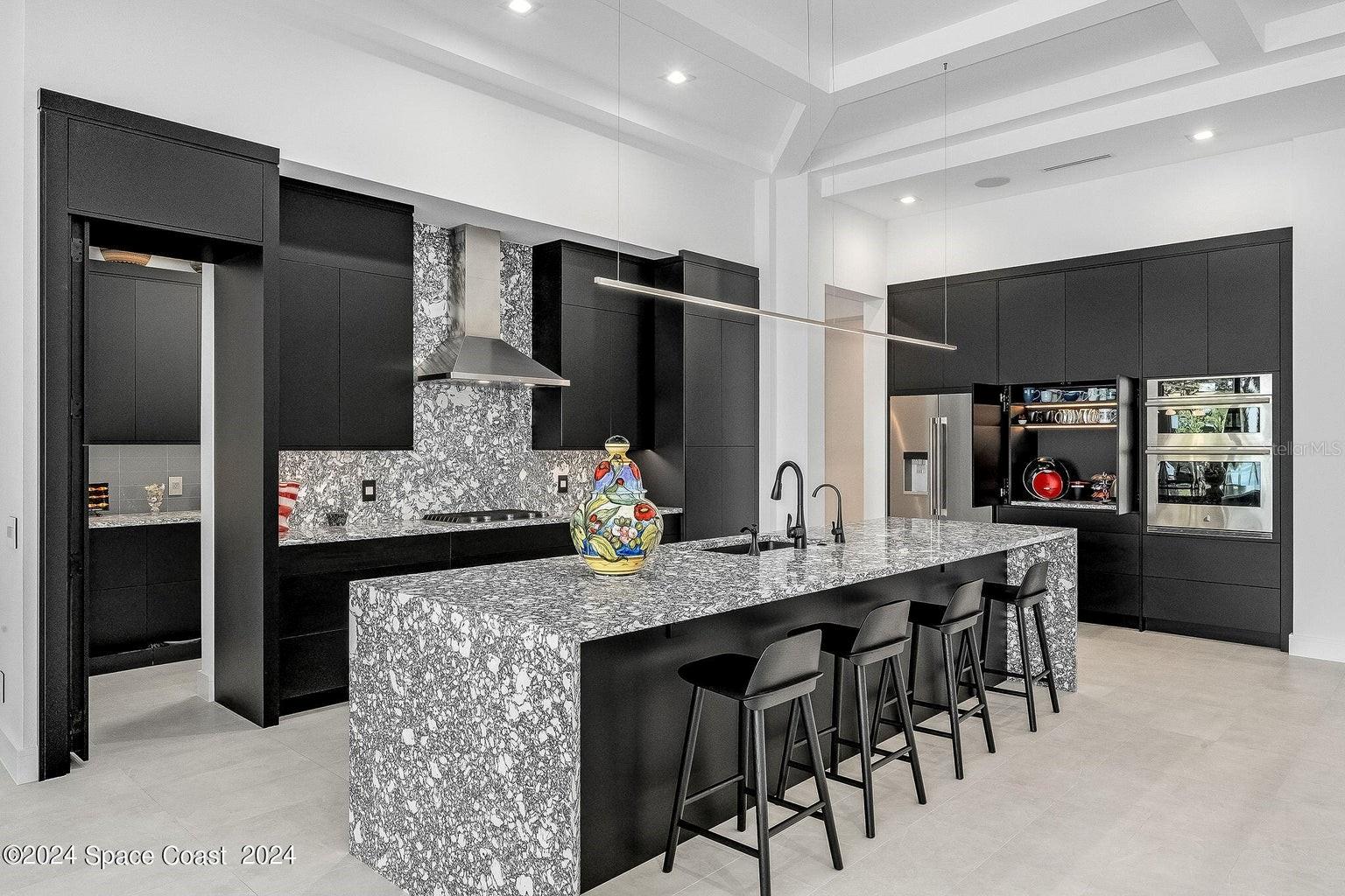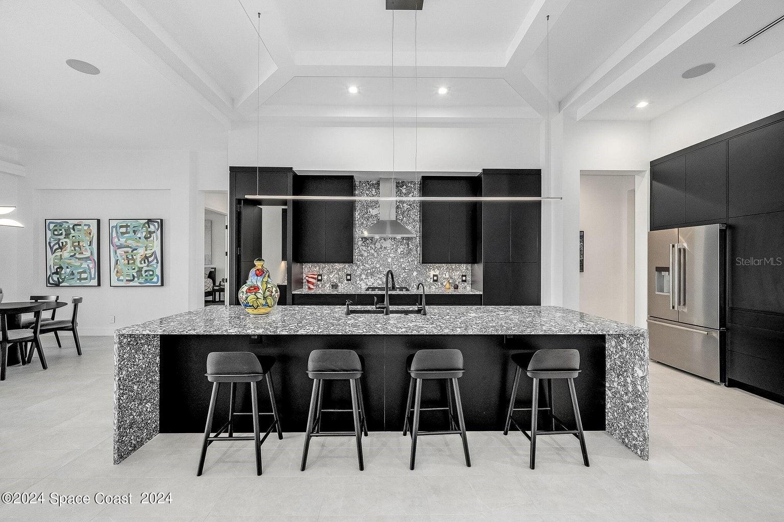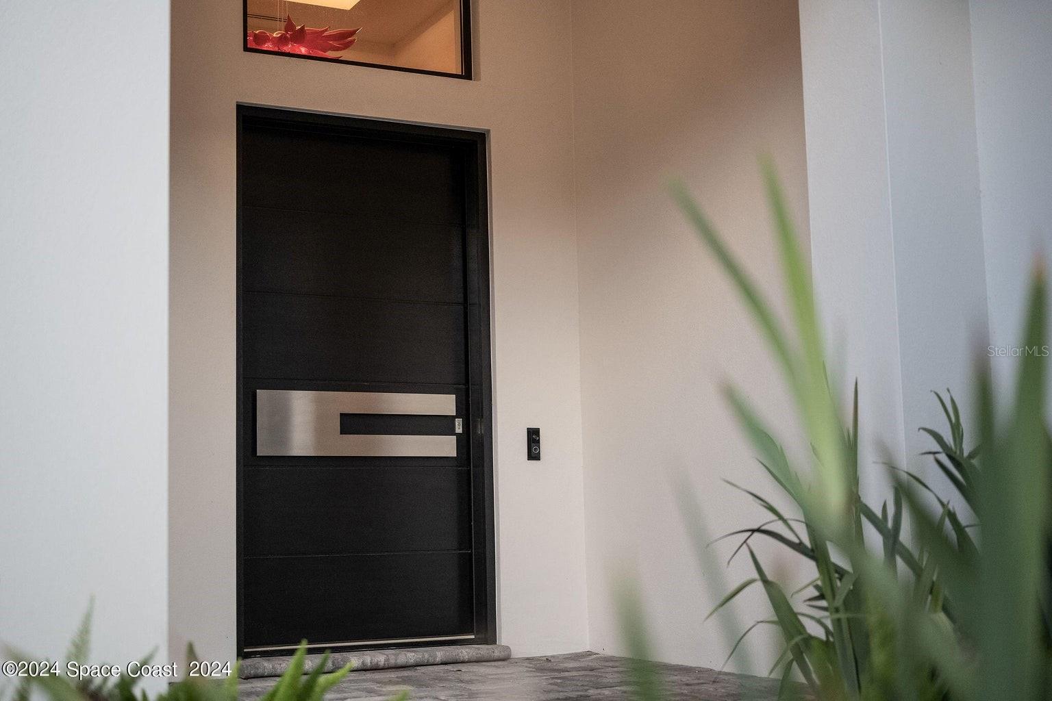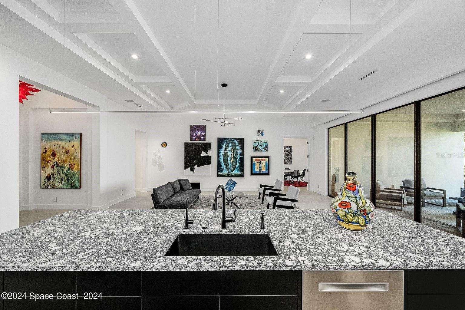 Beautiful custom-built home by Christopher Burton nestled on the Indian River, offering 4,946 total SF of refined living space. Entry features a hurricane-rated Mahogany door leading to a foyer illuminated by a hand-blown glass chandelier. Inside, Great Room boast 12FT ceilings, custom beams & an art wall w/ dimmable art lighting. Chef's kitchen includes top-tier JennAir appliances, a hidden pantry & Moen touchless faucet. Primary Suite is a luxurious retreat w/10FT ceilings, slipper tub, walk-in shower, Toto Washlet & custom Artistry closet. Entertainment at your fingertips in the Media Room w/ a 77'' OLED TV on custom backdrop. Step outside to a covered patio w/ river views & outdoor kitchen. Park your cars in the oversized 3 car garage. Advanced automation; motorized shades, Wi-Fi th/out, security sys, built-in speakers, whole-house generator. Sustainable features: Smart lawn irrigation & 50 AMP EV-ready. A Perfect blend of elegance & modern features w/ picturesque Riverfront views!