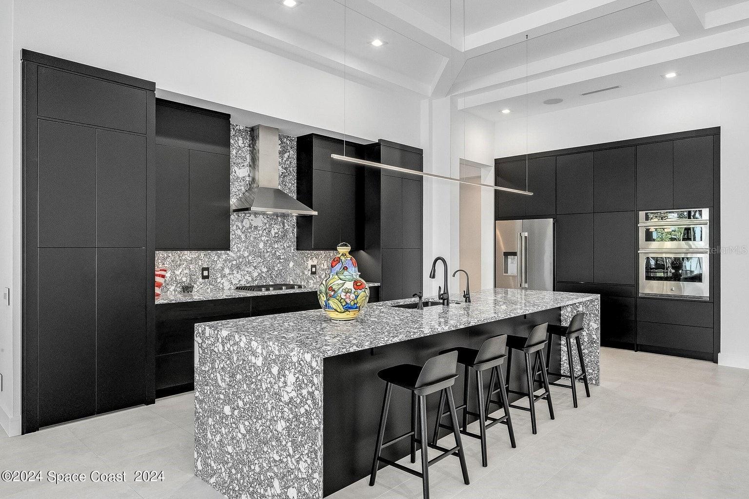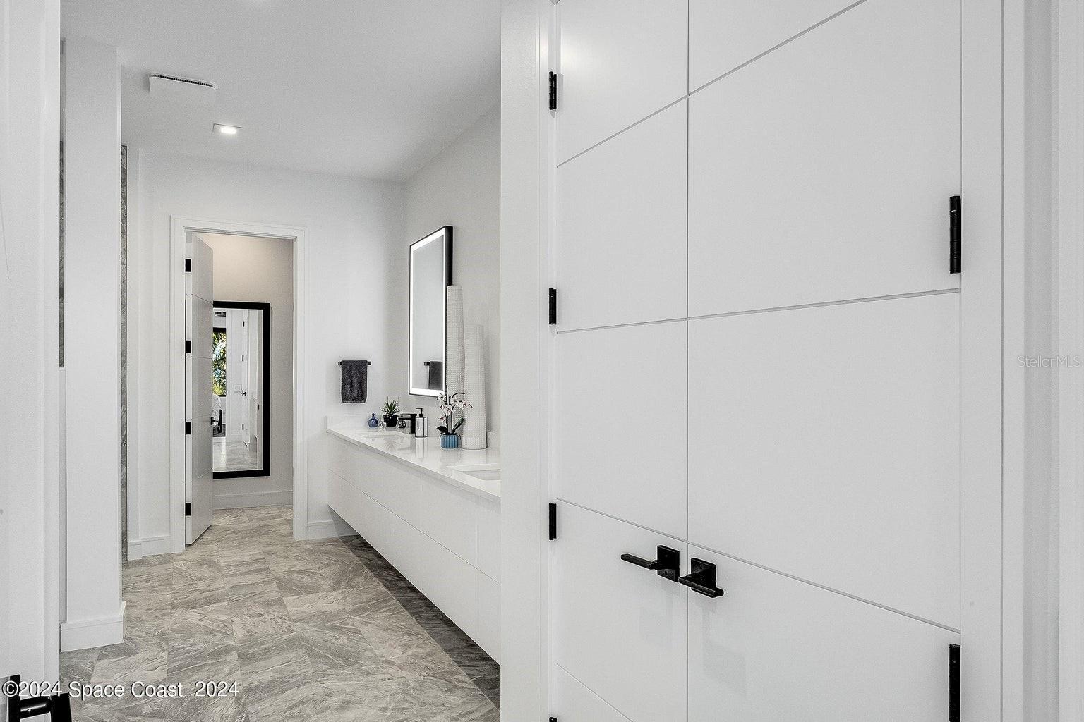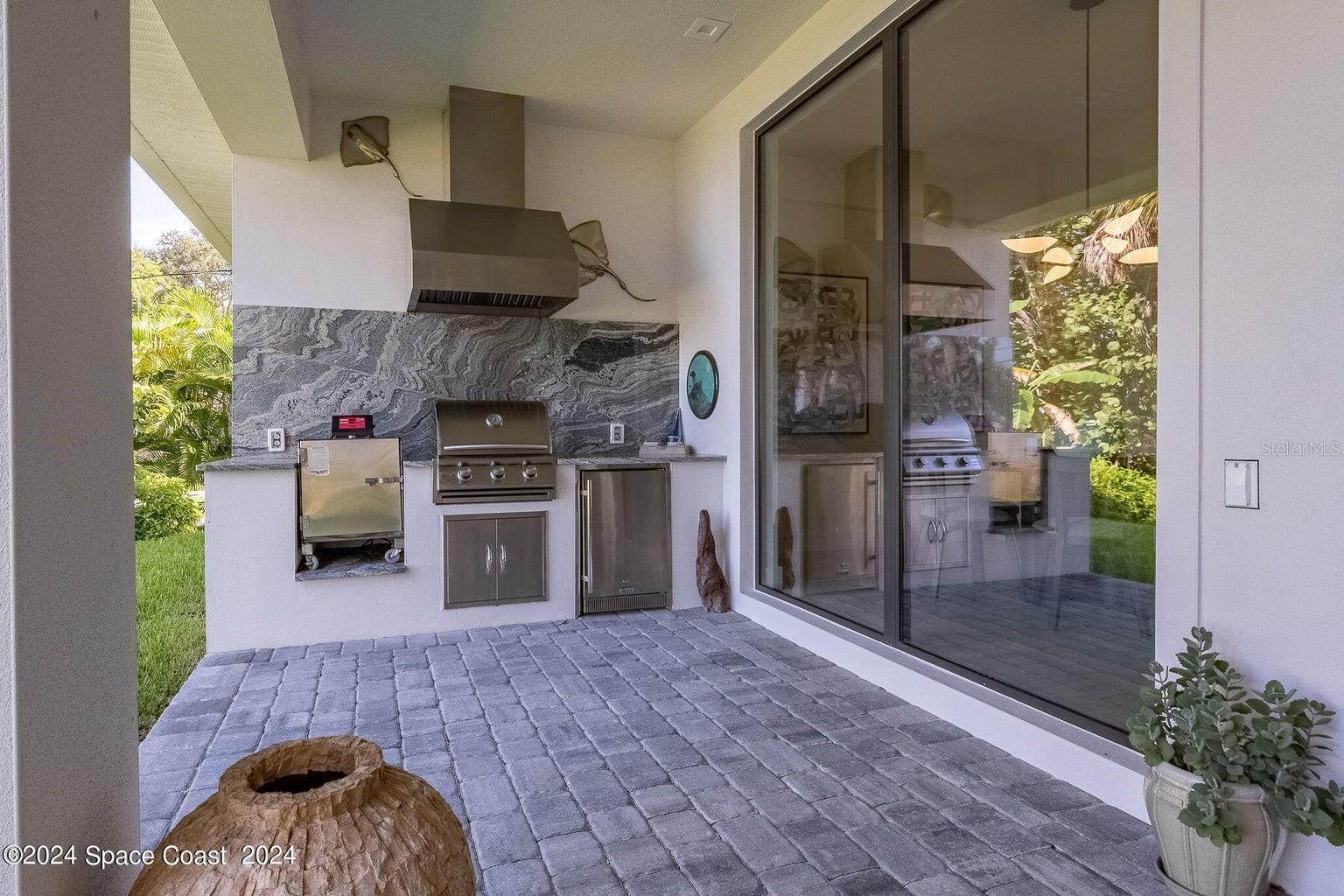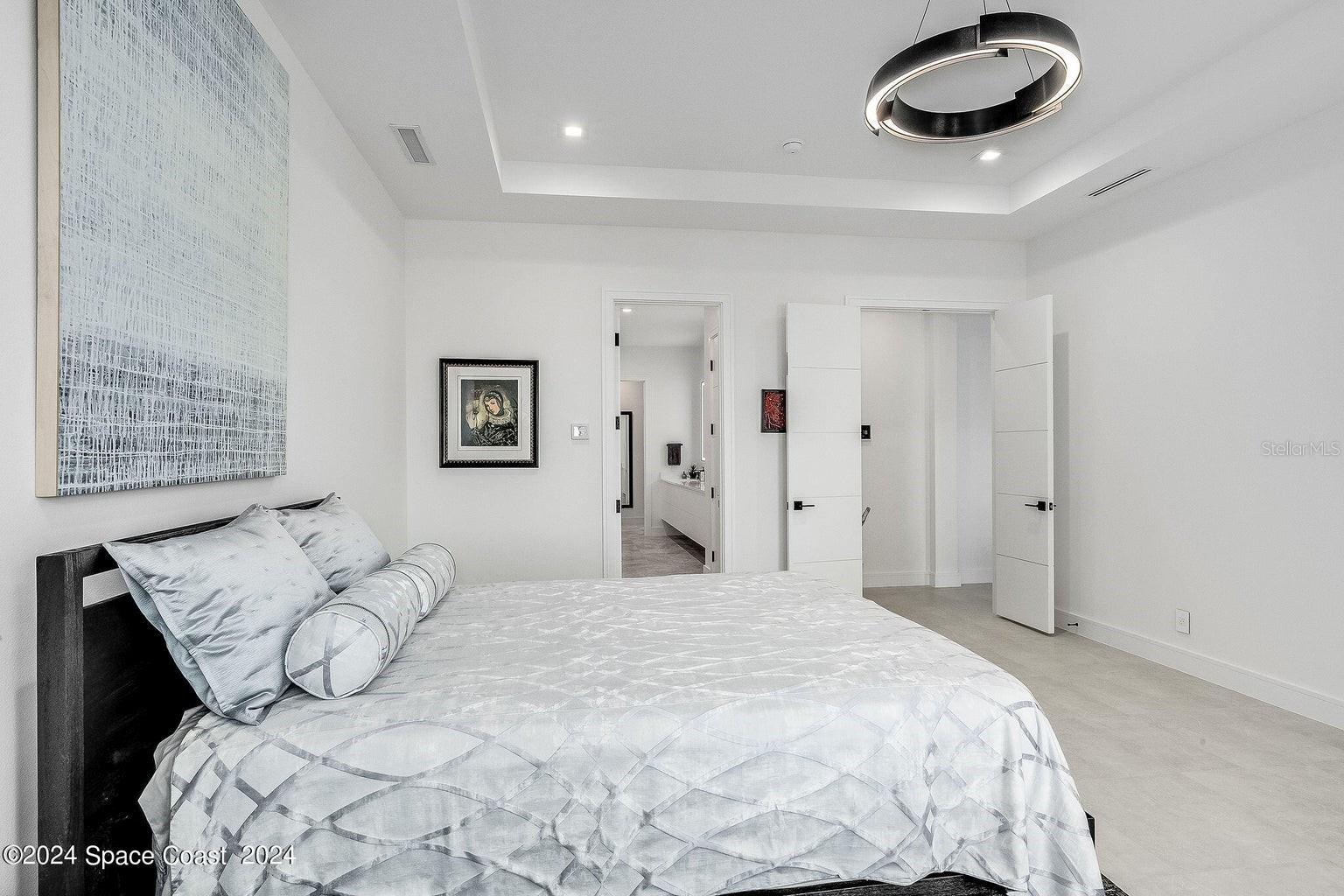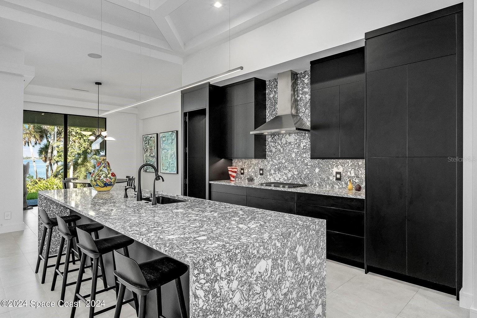 Beautiful custom-built home by Christopher Burton nestled on the Indian River, offering 4,946 total SF of refined living space. Entry features a hurricane-rated Mahogany door leading to a foyer illuminated by a hand-blown glass chandelier. Inside, Great Room boast 12FT ceilings, custom beams & an art wall w/ dimmable art lighting. Chef's kitchen includes top-tier JennAir appliances, a hidden pantry & Moen touchless faucet. Primary Suite is a luxurious retreat w/10FT ceilings, slipper tub, walk-in shower, Toto Washlet & custom Artistry closet. Entertainment at your fingertips in the Media Room w/ a 77'' OLED TV on custom backdrop. Step outside to a covered patio w/ river views & outdoor kitchen. Park your cars in the oversized 3 car garage. Advanced automation; motorized shades, Wi-Fi th/out, security sys, built-in speakers, whole-house generator. Sustainable features: Smart lawn irrigation & 50 AMP EV-ready. A Perfect blend of elegance & modern features w/ picturesque Riverfront views!