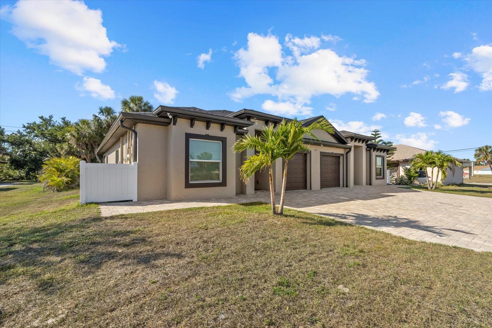 Stunning Modern Duplex in Rotonda West – Quality, Comfort & Style! Welcome to this beautifully crafted TURNKEY duplex, offering 1,313 square feet each side, with 3 bedrooms and 2 bathrooms of stylish, functional living space. Built in 2022, this home is loaded with high-end finishes and thoughtful upgrades. Inside, you’ll find luxury vinyl flooring throughout and tile in wet areas, tray ceilings, and a bright, open-concept layout. The kitchens are a true highlight, featuring granite countertops, soft-close cabinets, a pantry closet, and modern design touches that make cooking a joy. Energy efficiency is a top priority here, with spray foam insulation in the attic and hurricane impact windows and doors providing year-round comfort and peace of mind. Outside, the home sits on a beautifully landscaped lot with paver driveways, a sprinkler system, rain gutters all around the home, and solid block construction—all connected to city water and city sewer. Located just minutes from gorgeous beaches, parks, golf, dining, and shopping, this duplex is ideal for full-time living, a family investment, short term rental or a luxurious getaway. Don’t miss your chance to own this modern, turnkey property in the desirable Rotonda West community!