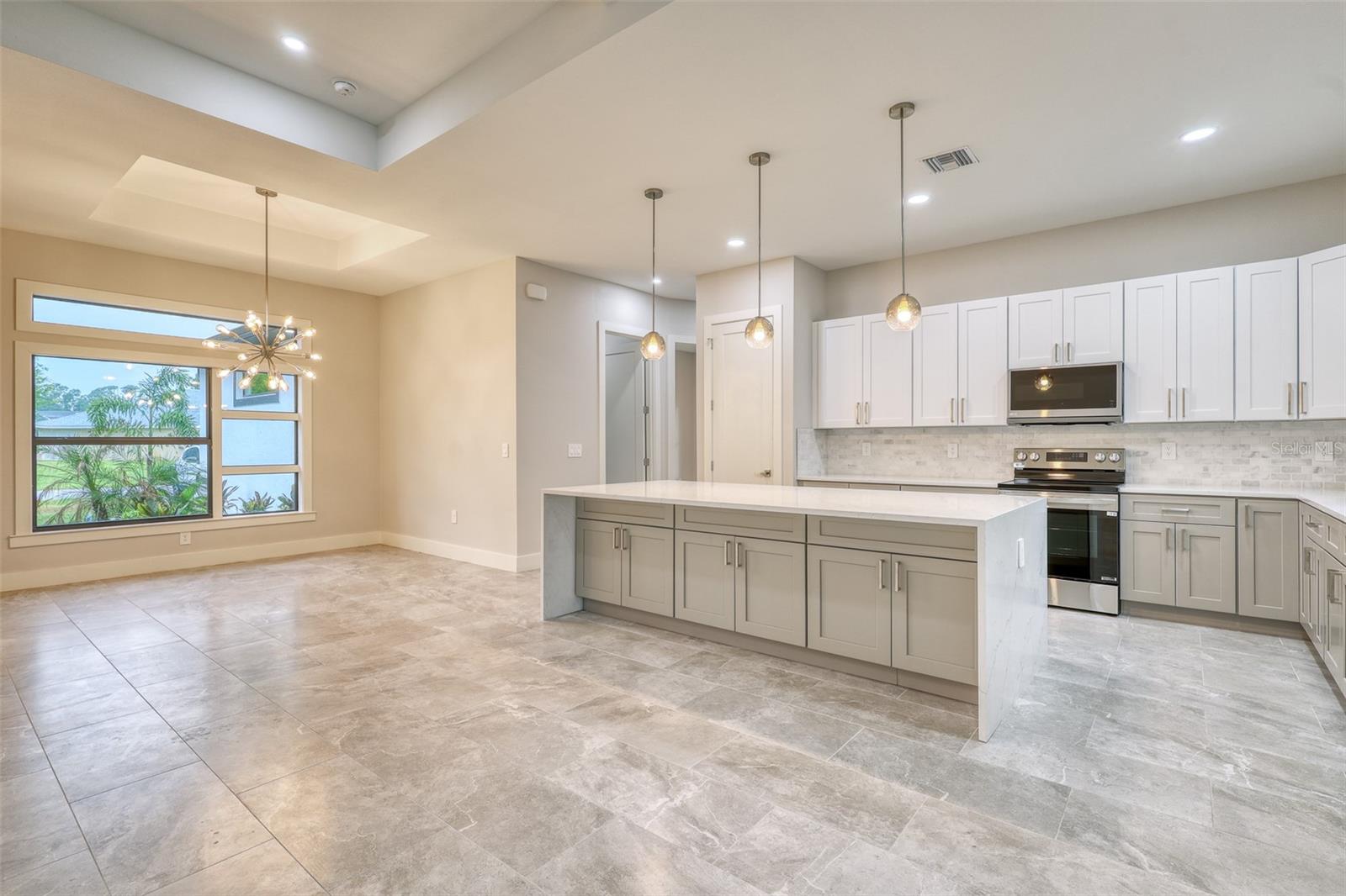Experience the allure of this freshly minted residence with 10-ft ceilings gracing each room. Embrace culinary dreams in the expansive kitchen, fully equipped with all appliances. Marvel at the exquisite tray ceilings adorning the master bedroom, living room, and dining room. Outside, your own private caged pool awaits, complete with an outdoor shower and ample space for relaxing poolside. Let the outdoors flood in through sliding doors in the living room and master bedroom. Picture yourself gathered around the 9-ft long kitchen island with a stunning waterfall quartz slab, complemented by extra cabinets underneath. Throughout the house, sleek ceramic tiles lead the way to the master bedroom oasis, featuring both a shower and a bathtub. All impact windows and doors for added security. Practical amenities abound, including a sink in the laundry room. Nestled in a peaceful neighborhood, this gem is just a stone's throw away from the enchanting Gulf beaches. Come and make this haven your own!