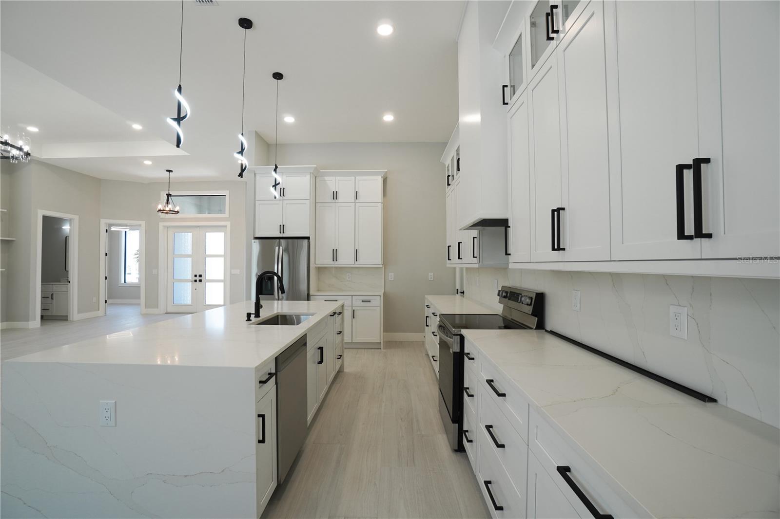 One or more photo(s) has been virtually staged. Experience the best of Florida living in this stunning, newly built luxury home. Set on a spacious half-acre lot in a quiet neighborhood. The property has beautiful landscaping, with 2,245 square feet of living space and high ceilings, the entire home feels bright, open, and grand. Inside, the floor plan includes three comfortable bedrooms and a dedicated office filled with natural light. The main living area serves as a focal point, featuring a cozy electric fireplace with custom shelving and a large sliding glass door that invites the outside in. The kitchen is a true highlight for anyone who loves to cook, offering a very large island, plenty of cabinet space, and a generous pantry. The primary suite serves as a private retreat, complete with dual walk-in closets and a luxury glass shower. For ultimate convenience, a private sliding door leads directly from the bedroom to the pool area. Outside, the screened pool is perfectly private, shielded by mature trees that create a natural green fence. Built for peace of mind, the home includes impact-rated windows and doors for added safety and quiet. Located just minutes from famous Gulf beaches, this home offers the ideal coastal lifestyle. Call today to schedule your private showing.