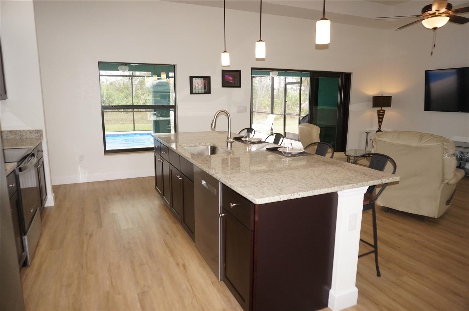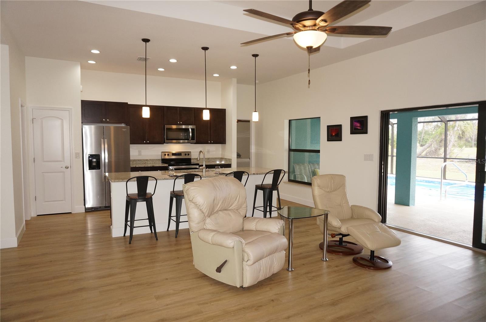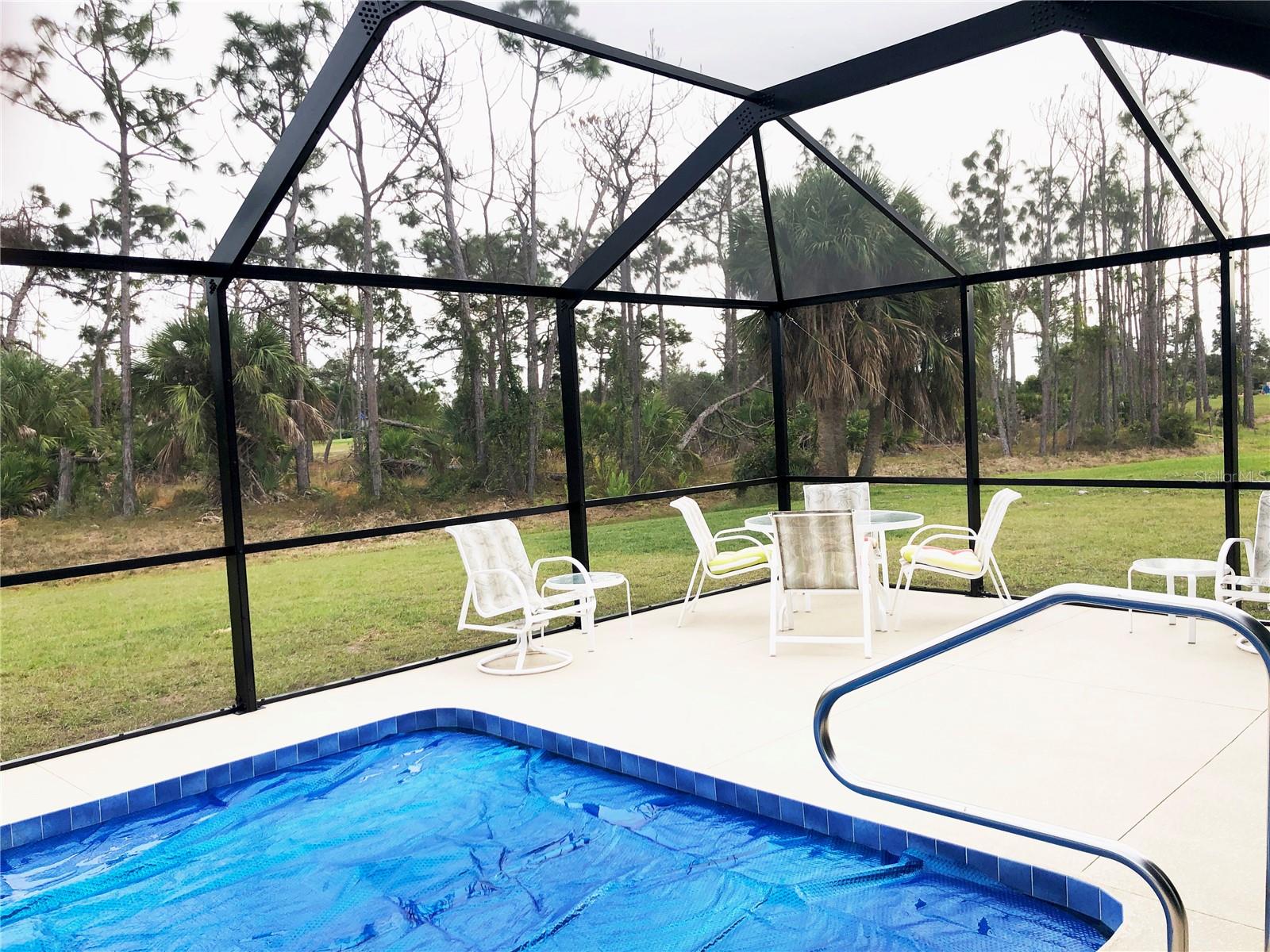 ***NEW CONSTRUCTION 2023*** 3 Bedroom, 2 Bathroom home with attached oversized 3 Car Garage located ON A GOLF COURSE in the desirable deed restricted golf community of ROTONDA WEST PINEHURST. This light and bright home offers beautiful design features throughout the home. There is an open concept and split bedroom floor plan with Great Room and Dining Area, well appointed Kitchen, Inside Laundry with Samsung top loading washer and dryer and screened Lanai. The Great Room and Dining Area offer tray ceilings and luxury vinyl plank flooring. The beautiful Kitchen features wood cabinets, granite counters, Whirlpool stainless appliances, breakfast bar that seats four, pantry closet and opens to the Great Room. The spacious Master Bedroom suite has TWO walk in closets, tray ceiling and private bathroom with wood vanity, granite counter, large walk in shower. There are two additional generous sized bedrooms and the guest bathroom has a tub/shower combo. Your living space extends via sliding glass doors in the Great Room to the screened Lanai and Pool area with large covered area, plenty of deck for sunbathing and heated 24X12 inground swimming pool. Pool cage is NEW. Fabulous GOLF COURSE VIEW and views of mature Florida trees and plants. Other features include 7 upscale ceiling fans with lights, luxury vinyl plank flooring throughout, lovely landscaping, oversized driveway, tray ceilings, neutral colors throughout. ** MANY ITEMS convey with the house. Ask your agent for the attached list of items that convey** ROTONDA WEST offers twenty-six miles of canals, plus ponds and lakes that are abundant with fish and wildlife, community attractions, Golfing, as well as several sandy beaches nearby. Boating is popular in Lemon Bay and around Boca Grande. The nearby Gulf of Mexico offers some of the best fishing in the world. This is a beautiful NEW home in a great community!