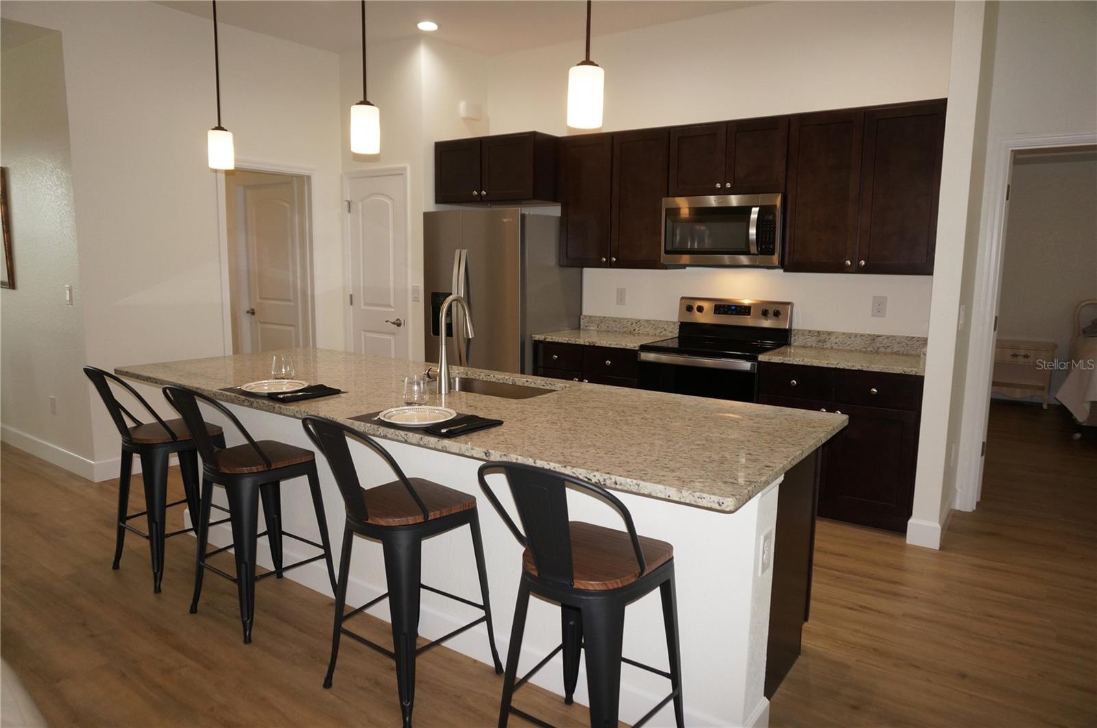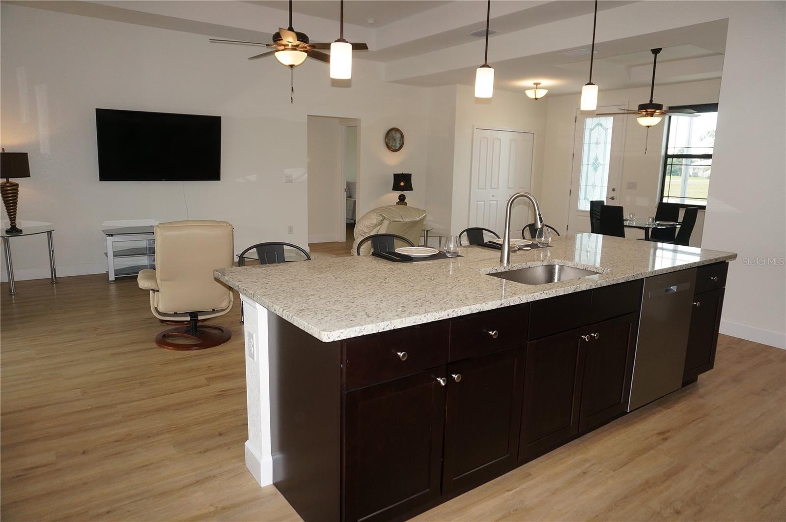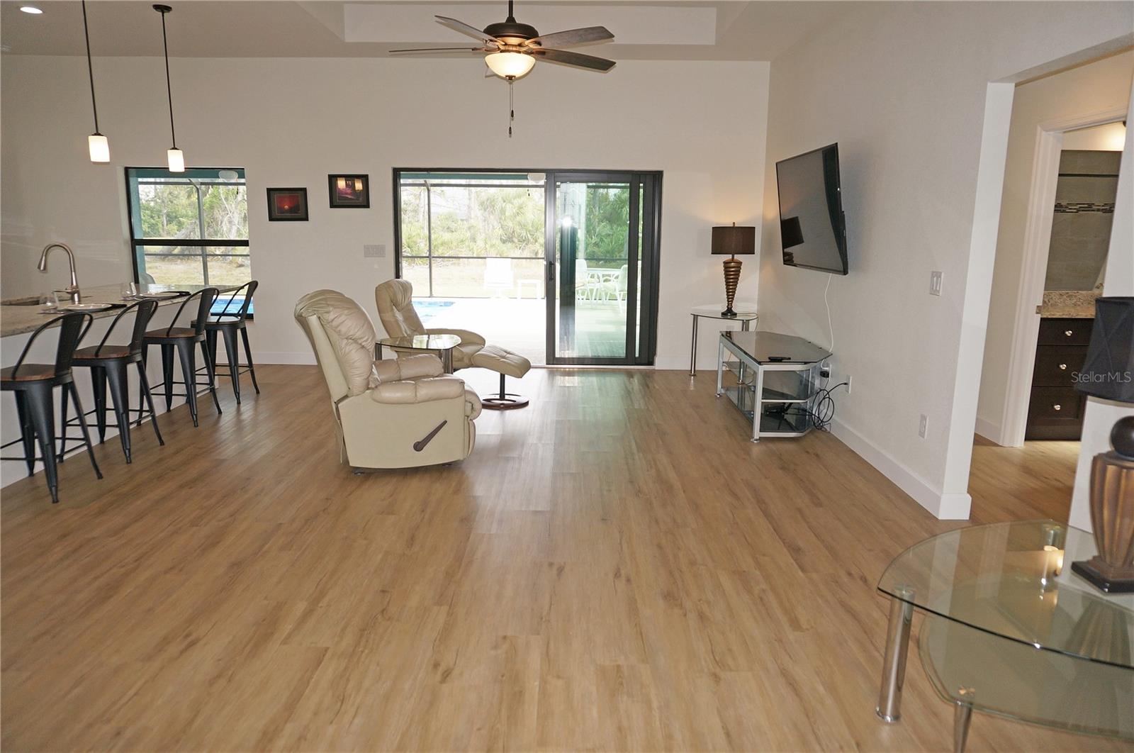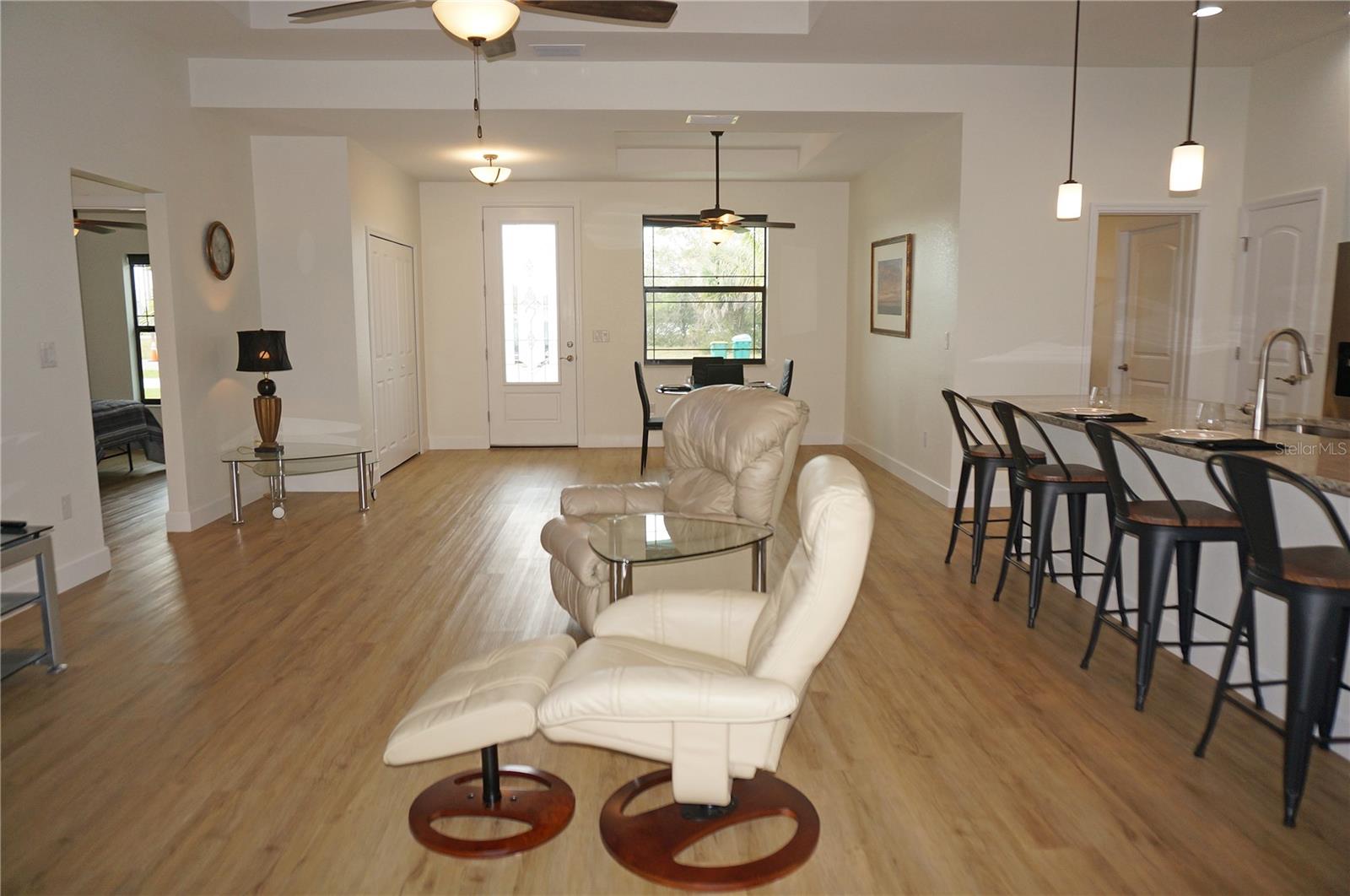 ***NEW CONSTRUCTION 2023*** 3 Bedroom, 2 Bathroom home with attached oversized 3 Car Garage located ON A GOLF COURSE in the desirable deed restricted golf community of ROTONDA WEST PINEHURST. This light and bright home offers beautiful design features throughout the home. There is an open concept and split bedroom floor plan with Great Room and Dining Area, well appointed Kitchen, Inside Laundry with Samsung top loading washer and dryer and screened Lanai. The Great Room and Dining Area offer tray ceilings and luxury vinyl plank flooring. The beautiful Kitchen features wood cabinets, granite counters, Whirlpool stainless appliances, breakfast bar that seats four, pantry closet and opens to the Great Room. The spacious Master Bedroom suite has TWO walk in closets, tray ceiling and private bathroom with wood vanity, granite counter, large walk in shower. There are two additional generous sized bedrooms and the guest bathroom has a tub/shower combo. Your living space extends via sliding glass doors in the Great Room to the screened Lanai and Pool area with large covered area, plenty of deck for sunbathing and heated 24X12 inground swimming pool. Pool cage is NEW. Fabulous GOLF COURSE VIEW and views of mature Florida trees and plants. Other features include 7 upscale ceiling fans with lights, luxury vinyl plank flooring throughout, lovely landscaping, oversized driveway, tray ceilings, neutral colors throughout. ** MANY ITEMS convey with the house. Ask your agent for the attached list of items that convey** ROTONDA WEST offers twenty-six miles of canals, plus ponds and lakes that are abundant with fish and wildlife, community attractions, Golfing, as well as several sandy beaches nearby. Boating is popular in Lemon Bay and around Boca Grande. The nearby Gulf of Mexico offers some of the best fishing in the world. This is a beautiful NEW home in a great community!