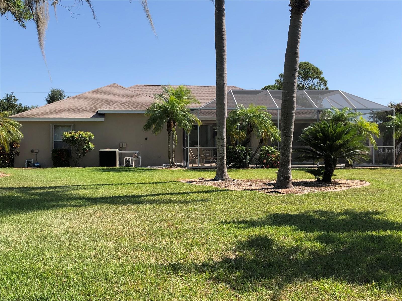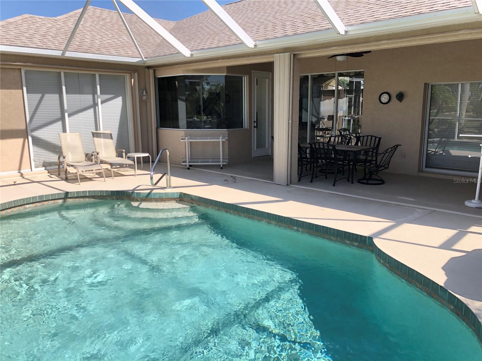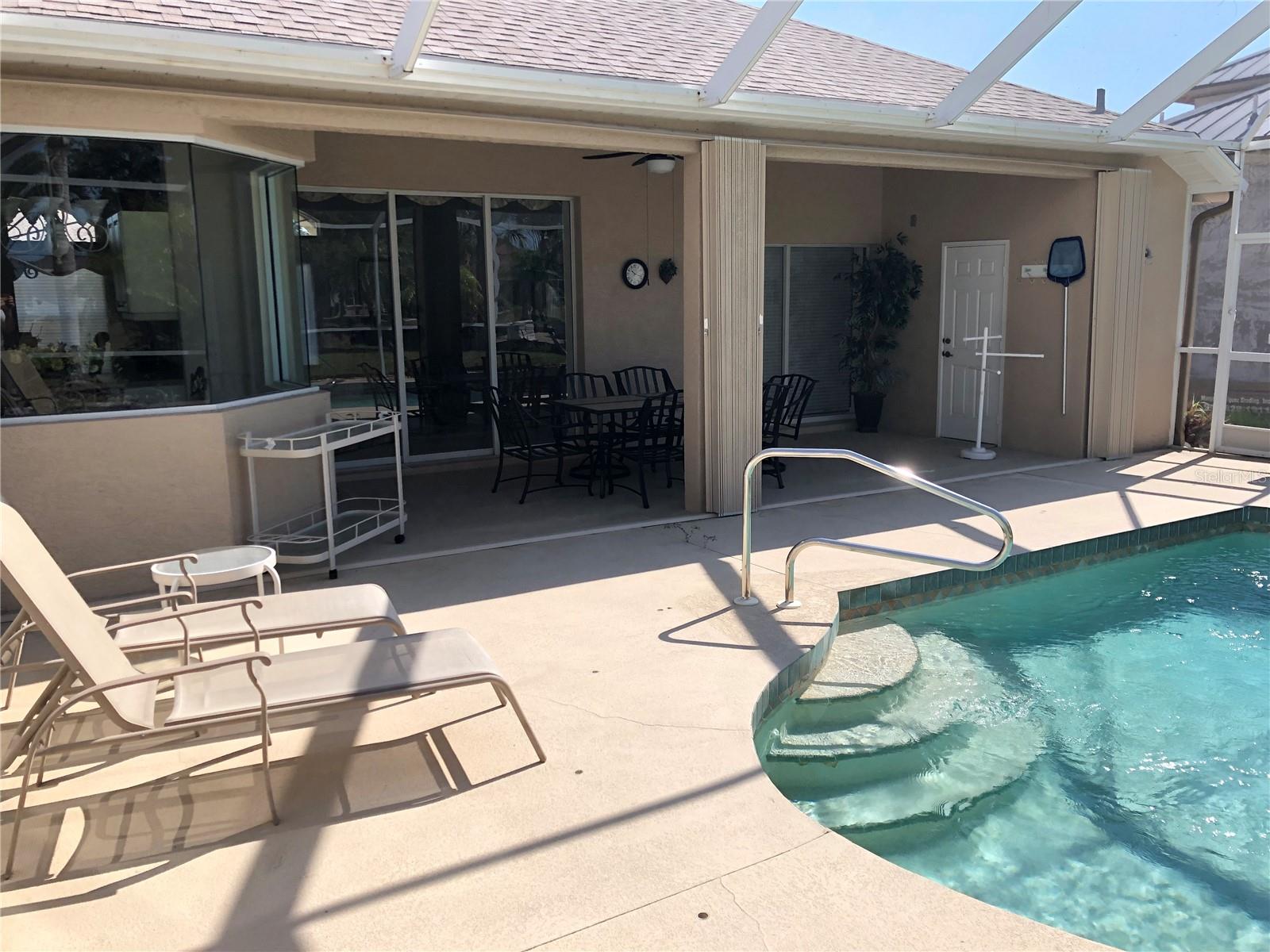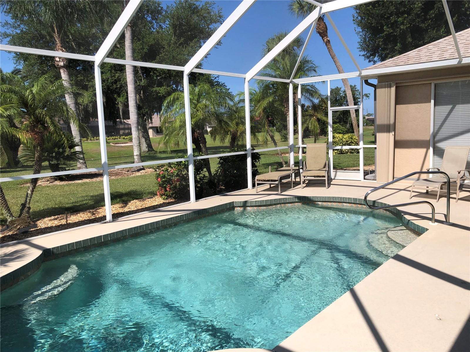 Beautiful, Luxury pool home on oversize, waterfront lot. Turnkey Furnished. Accordion storm shutters for security and storm protection. New roof 2023. Three bedrooms, 2-1/2 bath (pool bath on lanai). Heated and screened pool. Formal living room plus den. Formal dining room plus breakfast nook. Ceramic tile floors in living areas, carpet in bedrooms. Lawn irrigation system with water from canal. Kayak from your backyard. Split bedroom layout. Main bedroom with ensuite bath, separate tub and shower and enclosed lavatory. Disappearing sliders in living room for wide access to lanai. Short, easy drive to beautiful Englewood Beach. Golf courses abound. Play a round on a different course every day of the week. Spring training baseball nearby in Port Charlotte and North Port.