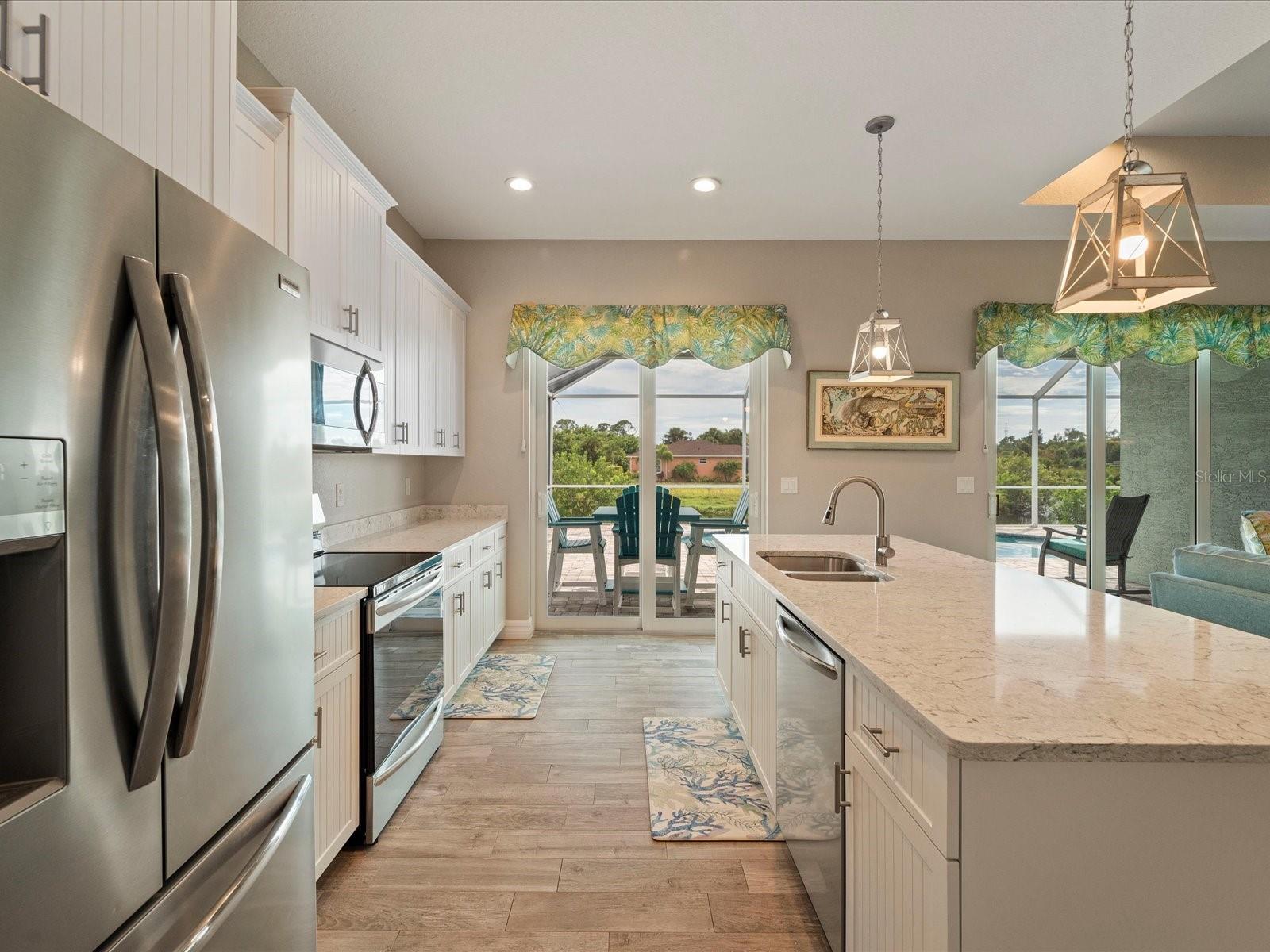 Fully furnished 3 year old pool home located on lovely lake in the Beach community of Rotonda Heights! Just bring your toothbrush to this welcoming home with an open floor plan that throughout entire house has modern, soaring 10' high ceilings with volume trays, 8' doors, millennium durable allergen-free porcelain plank flooring (a MUST in Florida with all the sand), high end Quartz countertops, cabinetry that has its own crown molding plus elegant handles on doors & drawers with 42" uppers that are stepped, fully tiled bathrooms, Stainless Steel appliances, a large, corner walk-in pantry, 5+ inch baseboards, upgraded full lighting package inclusive of ceiling fans in all bedrooms, living room & lanai! The lanai is complemented with an oversized, full home-width pool deck that has plenty of room for sunbathing and grilling for those who enjoy barbecuing poolside, along with being completely screened in for minimal pool maintenance! Kidney shaped pool with its gorgeous decorative glass accent tile and LED lighting also has sunshelf for toe-dipping, toddler play, or fur-family fun! Engineering wise, this beauty was built by a Floridian builder who knows what has to be built in Southwest Florida for longevity and durability...hip roof design for long-term discounted insurance rates, off-ridge roof venting so peaks won't blow away, and STEM WALL construction which far exceeds monolithic slabs as sand can wash away but not cement blocks! Additionally, 3-year old construction brings low-cost insurance and a peace of mind with low-maintenance home ownership. All furnishings are less than 3 years old and have barely been used since owner has been unable to find more than a few weeks of time to come down to enjoy their new build. Owner’s fought for their months old home post-hurricane Ian & insurance paid for a new roof in 2024. Promise you will not be disappointed in this gorgeous, fabulously built paradise gem located in the amazing Rotonda Heights community!