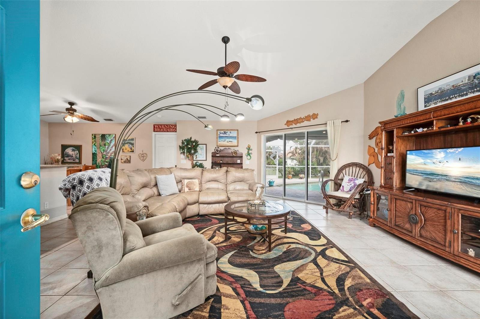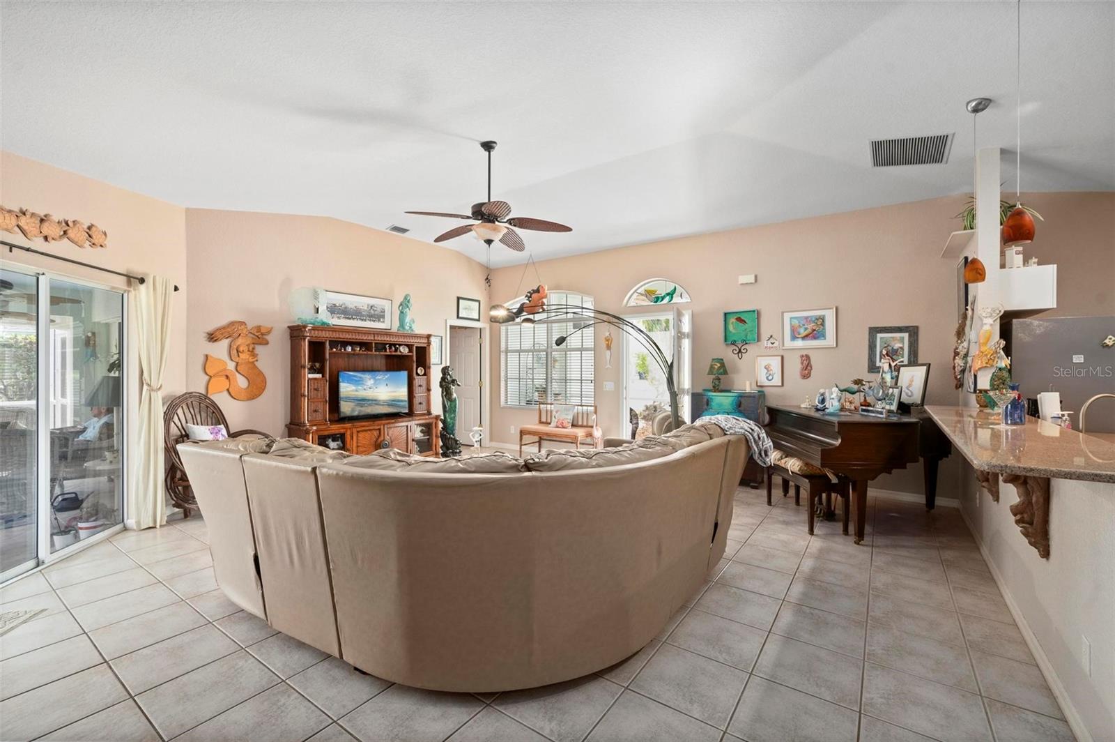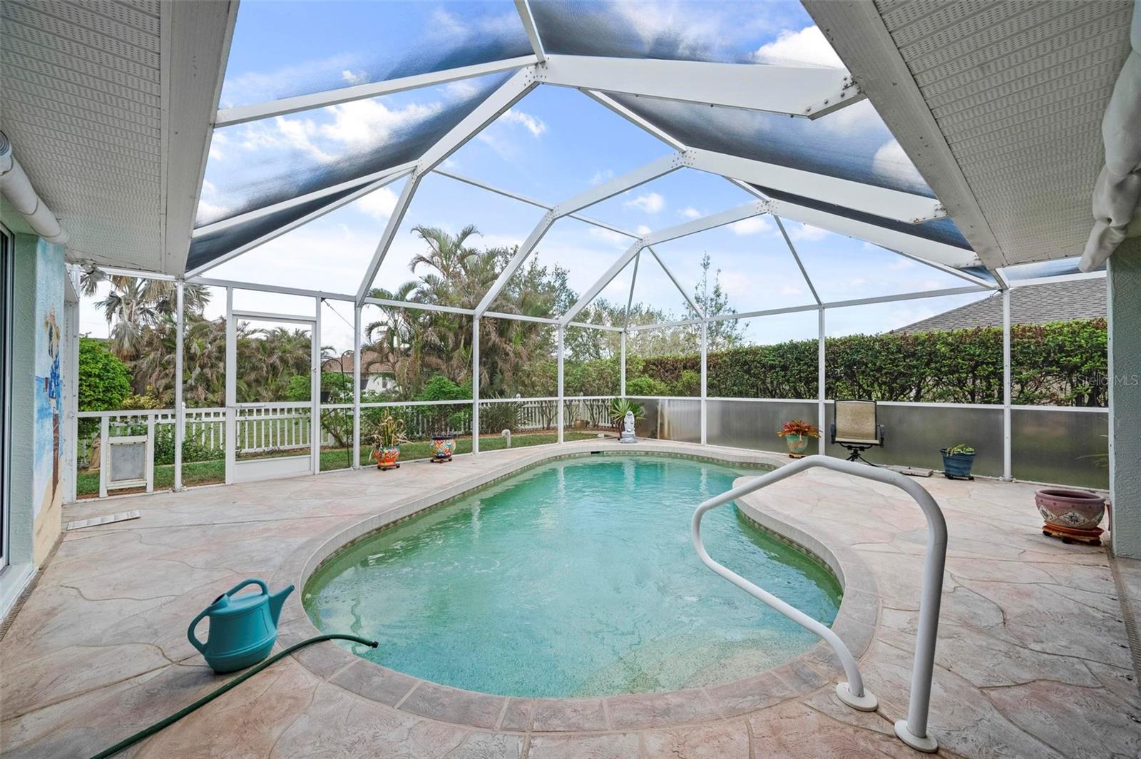 Welcome to your next chapter in the sought-after White Marsh section of Rotonda West! This 3-bedroom, 2-bathroom, 3 car garage home with 2022 Roof combines functionality and charm, offering a layout designed for comfortable living. The open floor plan features vaulted ceilings and tile flooring throughout the main living areas, while the kitchen stands out with its breakfast bar, ample counter and cabinet space, and Samsung stainless steel appliances. Natural light fills the home, creating a bright and inviting atmosphere. The thoughtful split-bedroom design ensures privacy, with a spacious master suite and two guest bedrooms, all with neutral vinyl flooring. Additional conveniences include a large laundry room with a built-in desk and GE stackable washer and dryer. Step outside to enjoy the heated pool within the screened lanai, complete with rust-free bolts. The fenced backyard overlooks a peaceful greenbelt for added privacy. Practical highlights include a circular driveway, screened front porch, outdoor storage area, and a 3-car garage with a screen to enjoy refreshing Florida breezes. Situated in Flood Zone X, this property has had no damage from recent storms. Rotonda West is the ideal setting for an active lifestyle, with close proximity to the Long Marsh Golf Club and four other premier golf courses. The community offers miles of canals, ponds, and walking trails for fishing, hiking, and nature watching. Nearby Florida beaches, shopping, dining, and Gulf of Mexico boating access are all just a short drive away. Whether you're looking for a forever home or an investment, this property is a wonderful opportunity to enjoy the best of Florida living in a deed-restricted community.