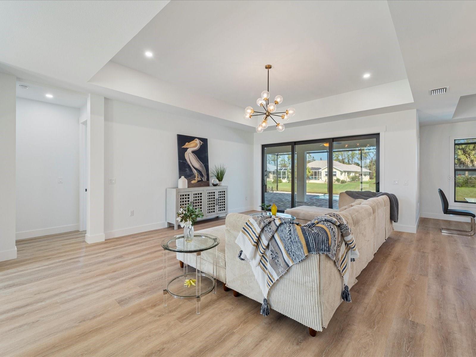 Seller says to bring all offers!!! NO FLOOD INSURANCE needed! This never lived in new home exudes quality craftsmanship, unmistakable from the moment you arrive in the solar lit, paver driveway! Sitting on a lovely freshwater canal in the highly desirable Rotonda West Community, this 4-bedroom, plus an OFFICE, 3 bathroom, exquisite home was built with no feature understated! The home boasts soaring volume ceilings and 8-foot doors throughout with the Living room having an immense tray ceiling full of recessed lighting, a 12 foot, 3-paneled sliding glass door connecting to the 29 foot covered lanai area, providing a sunlit sanctuary. Primary Suite’s luxury includes direct access to the lanai, tray ceiling, wood shelved closets, a private water closet, walk-in, tiled shower with two time saving shower heads, shower bench with a glass enclosure, dual sinks, Quartz countertops, and a high-end soaking tub surrounded in an oversized tiled oasis. Centrally located in this convenience driven designed open floorplan, the chef inspired kitchen has a walk-in pantry, waterfall granite island, high-end Stainless-steel appliances, and is the hub for entertainment. Solid wood soft close cabinetry in all areas with the Kitchen’s beautifully done with drawers for all the lowers, including the entire island, with 12” black hardware, topped in exotic granite countertops, and surrounded with tile backsplash. The home has easy to upkeep luxury vinyl plank flooring in all areas except the 3 bathrooms which are tiled, convenient Hurricane Impact Windows providing peace of mind especially when you’re out of town, Spray Foam insulation for energy efficiency. Outside you’ll find the incredible 42’ long lap pool with its oversized sundeck for little ones to splash & play, fur babies to walk through and cool off, and you to lounge in for comfortable tanning and relaxation without having to fully submerge! You’ll be wowed by the extended, full home width incredible 59-foot pool deck and its upgraded cage that was built with the 6” heavy duty framing and Clear View construction...why stare at any crossbars?! There is a full lawn, 6 zone irrigation system, underground electrical service, and paver sidewalk along one side of the home. The oversized 24’x25’ 600 square foot 2 car garage has durable epoxy flooring, a handy side yard exterior door, and Hurricane rated overhead garage doors. The home is on Public Water, Public Sewer, NO FLOOD INSURANCE IS REQUIRED, it’s 100% Hurricane protected, with this property advantageously located in a golfing community, minutes to the beach, marinas, and boat launches. At nearly 2500 square feet under air, this custom designed home is a gem waiting for you! Call today for your private tour.