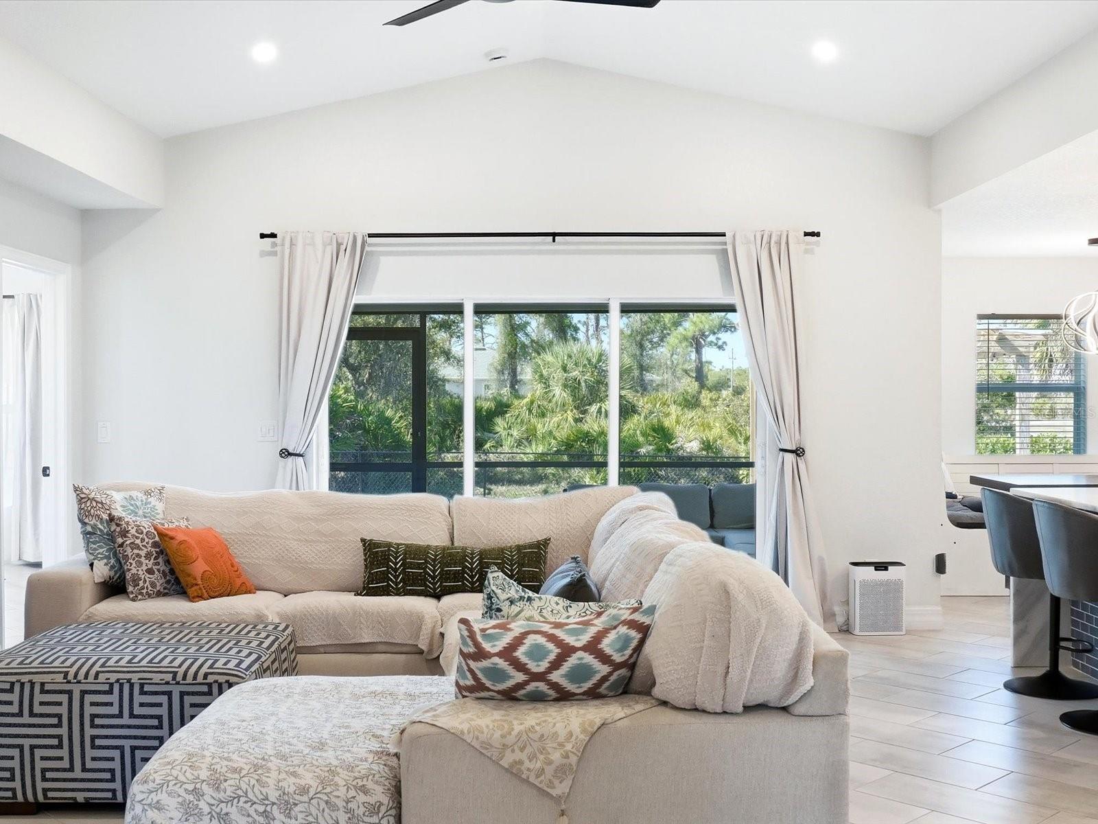 You may have seen this floor plan before—but you’ve never seen it executed with this level of additions, upgrades, and fully custom touches. Welcome to this beautifully crafted home in the highly desirable Rotonda Heights community, newly built in 2023 and thoughtfully designed for modern Florida living. Situated on a spacious corner lot, this 3-bedroom, 2-bathroom residence offers an exceptional blend of architectural detail, high-end finishes, and an ideal location close to the coast. Every upgrade was intentionally selected to enhance both everyday living and long-term value, creating a home that feels elevated, cohesive, and far from builder-standard. The exterior sets a polished first impression with a shingle roof, full gutters around the home, and a charming screened-in front porch accented with Spanish tile flooring. Recessed lighting throughout the soffits enhances curb appeal and provides elegant evening illumination. The property features upgraded landscaping with Saint Augustine grass, supported by a recently serviced five-zone irrigation system. Chain-link fencing surrounds the yard for added privacy, while a private side walkway for discreet garage bin storage keeps the exterior neat and visually uncluttered. Inside, the home opens to a bright, airy layout highlighted by cathedral ceilings and refined tray ceiling accents, including in the primary bedroom. All interior lighting throughout the home is on dimmer switches, allowing for customizable ambiance in every space. Modern fixtures and clean architectural lines elevate the overall design while maintaining a comfortable, welcoming feel.The kitchen is a true focal point, featuring a striking waterfall-edge granite countertop imported from Argentina that blends beauty with functionality. Additional upgrades include soft-close solid wood cabinetry, a pot filler, farm-style sink, and a smart refrigerator, all flowing seamlessly into the living and dining areas—ideal for entertaining or everyday living.Both bathrooms are designed with quality and comfort in mind. The primary bathroom is fully tiled, creating a spa-like retreat, while rain shower heads in both bathrooms add a touch of luxury. The primary suite offers a peaceful escape, and the additional bedrooms provide flexibility for guests, family, or a home office. Storage is thoughtfully integrated throughout the home with custom built-in shelving in all closets and built-in cabinetry in the laundry room, ensuring organization without sacrificing style. The home is also pre-wired at each exterior corner for a high-end security system, with interior outlets in place to support an advanced setup, offering peace of mind and future flexibility. Outdoor living continues in the backyard, where a pergola creates an inviting space for entertaining or relaxing, complemented by a convenient outdoor shower that enhances the Florida lifestyle. Additional highlights include a two-car garage, public water and sewer, and hurricane shutters throughout, providing durability, energy efficiency, and peace of mind. With newer construction, extensive upgrades, and true move-in-ready condition, this home stands out as a rare offering in Rotonda West. Ideally located approximately 13 minutes from Manasota Key and Englewood Beach, the property offers quick access to some of Southwest Florida’s most desirable coastline while maintaining the quiet charm of the near-by golf-course community.