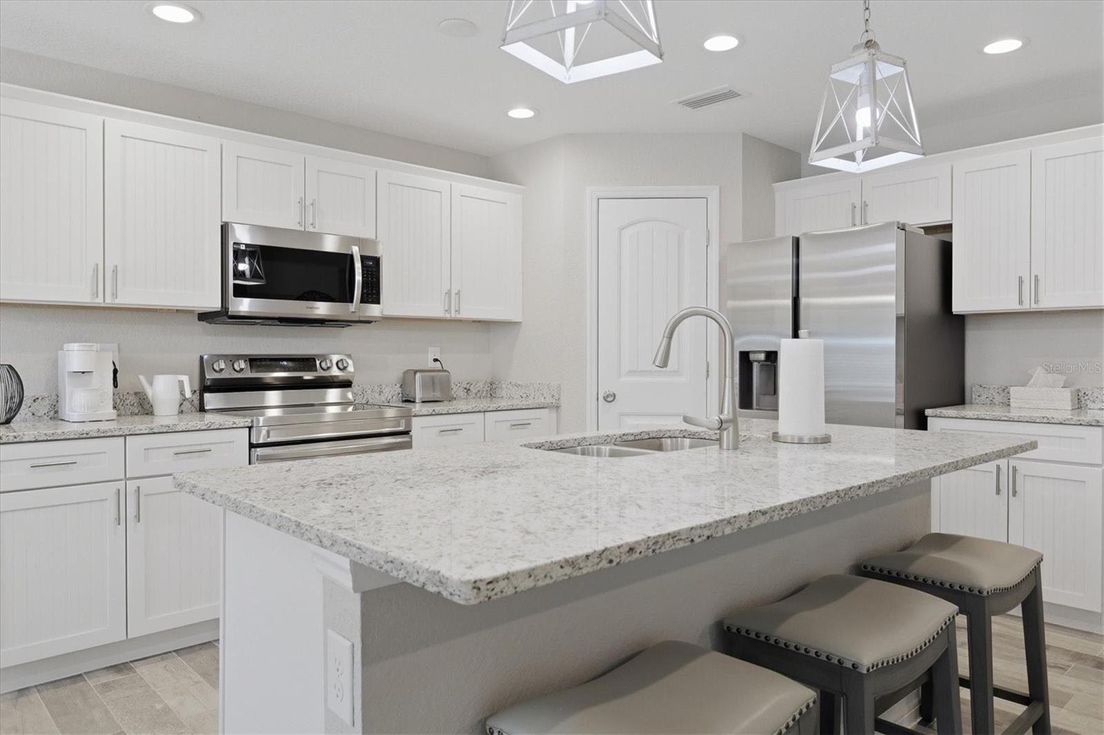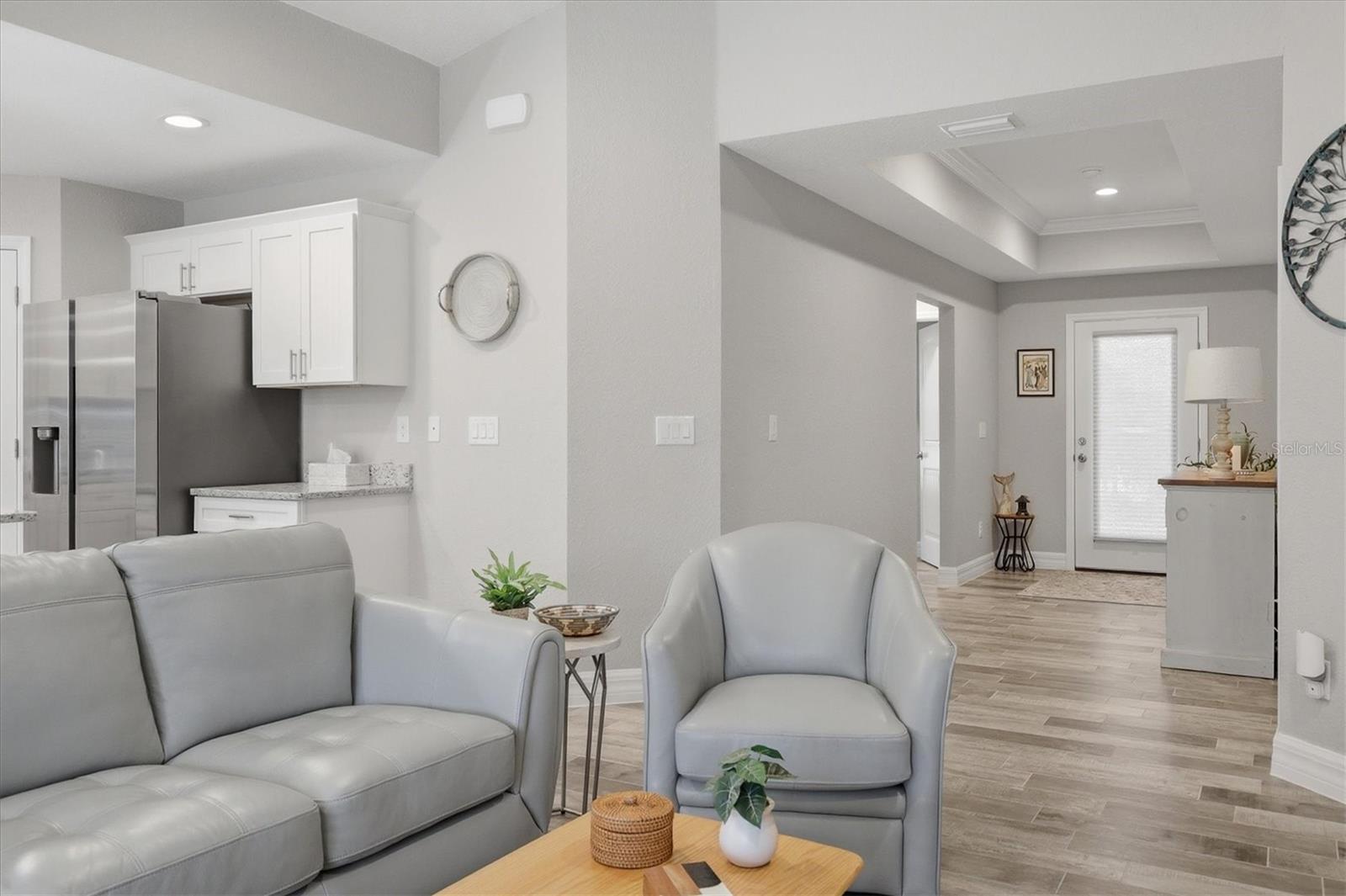 Welcome home to Rotonda Lakes at this 3/2/2 home that still looks and feels new and truly shows like a model!! As you step through the front door you'll appreciate the plank tile flooring that flows nicely throughout the home and the open foyer that has tray ceiling with crown molding, all creating a homey ambiance. Ever popular split bedroom floor plan has the guest rooms on the front right with the primary being on the left rear of the home. Light and bright open floor plan with great room, dining, and kitchen all open to each other for ease of conversation and entertaining. You'll delight in the kitchen with cottage type beaded board cabinets with granite counters including island that has double stainless sink and breakfast bar for casual dining as well as walk in pantry closet. For more formal setting the dining area is directly behind the kitchen with tray ceiling that has crown molding. Great room has sliders for ease of getting to the covered and screened lanai where you'll want to enjoy morning coffee or an evening beverage or perhaps lunch? The spacious primary bedroom is complemented also by a tray ceiling with crown molding making it that much more welcoming at the end of a long day. The en suite boasts dual sinks and gorgeous tiled walk in shower. And you'll for sure appreciate the appx. 6'x8' walk in shower. You'll find security in the accordion storm shutters for front door and sliders with panels for remainder of openings. Just want to enjoy the outdoors and nature - sit yourself down in the rockers on the front porch and enjoy away! Sought after rear Southern exposure is yours here as well. If you are inclined enjoy the walking path around the lake on Ingram Blvd and the notion that you are only about 15 minute drive to beautiful gulf beaches, golfing and more. This is TRULY A MUST SEE, call for viewing today.