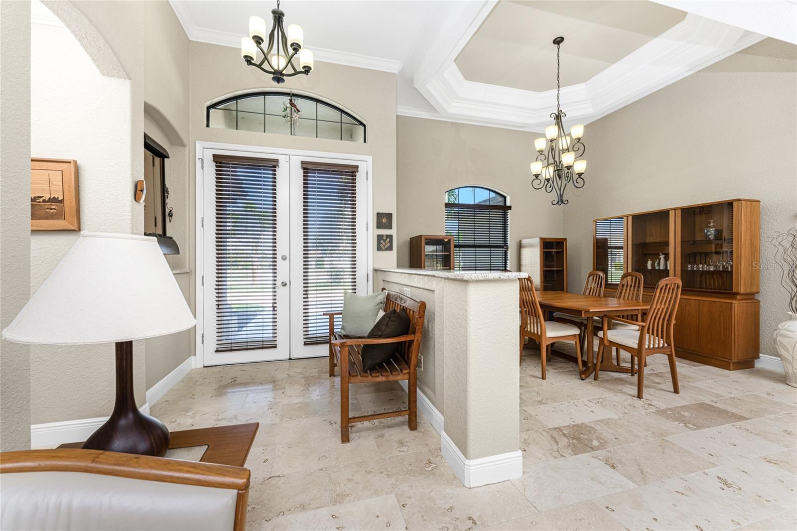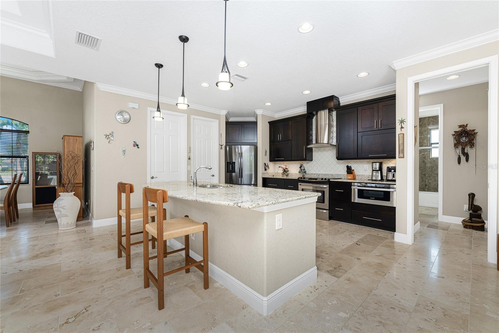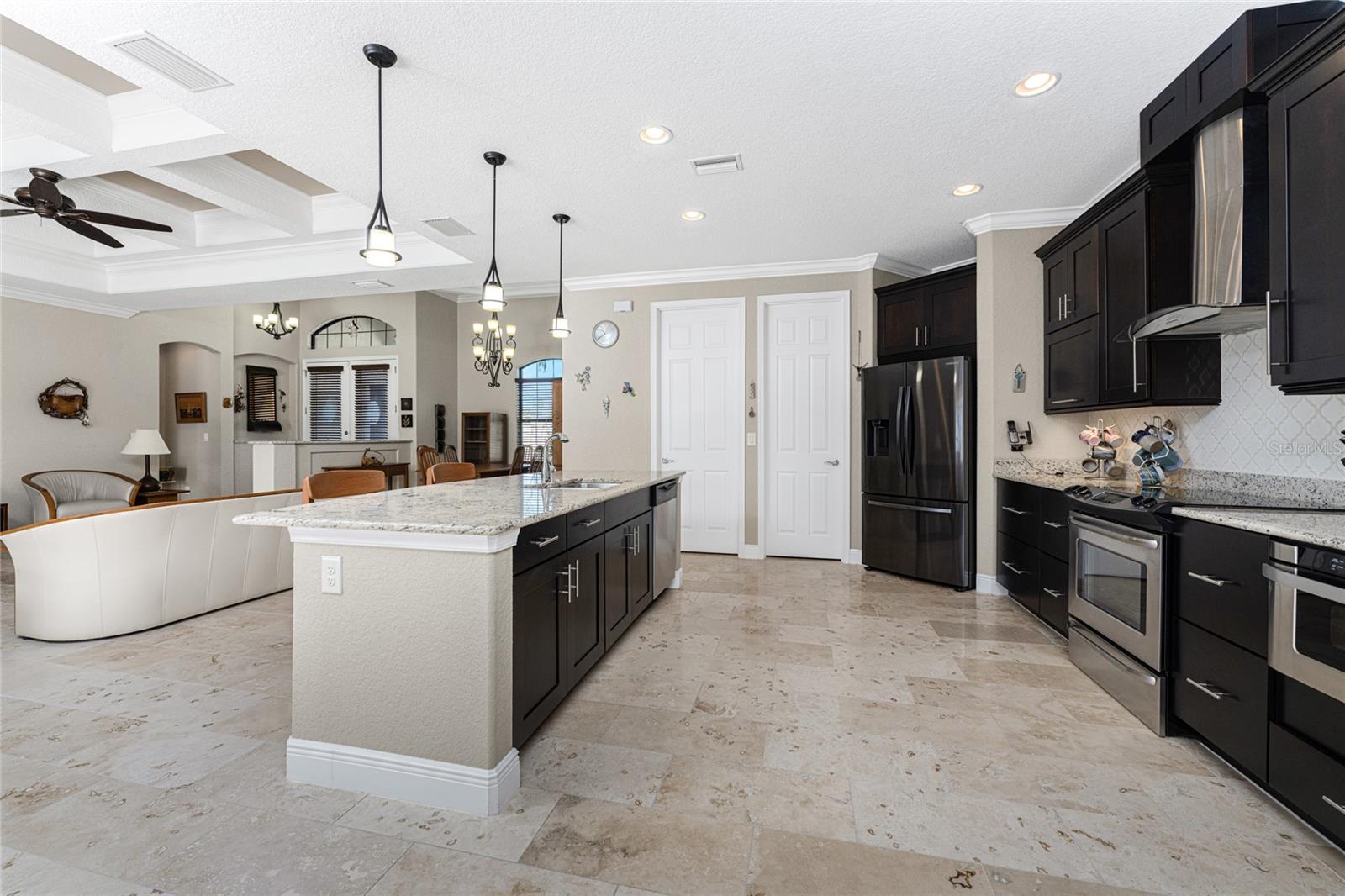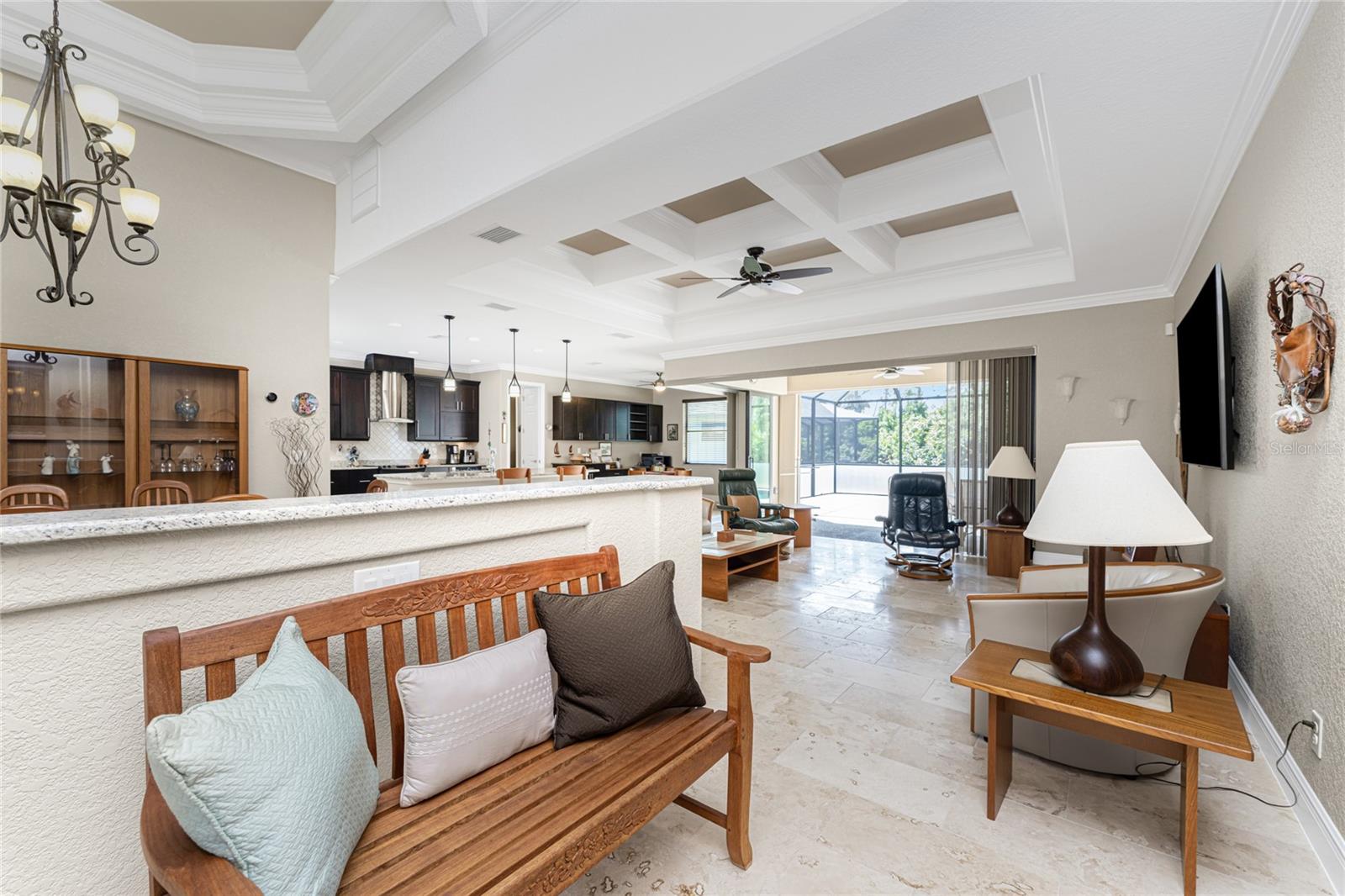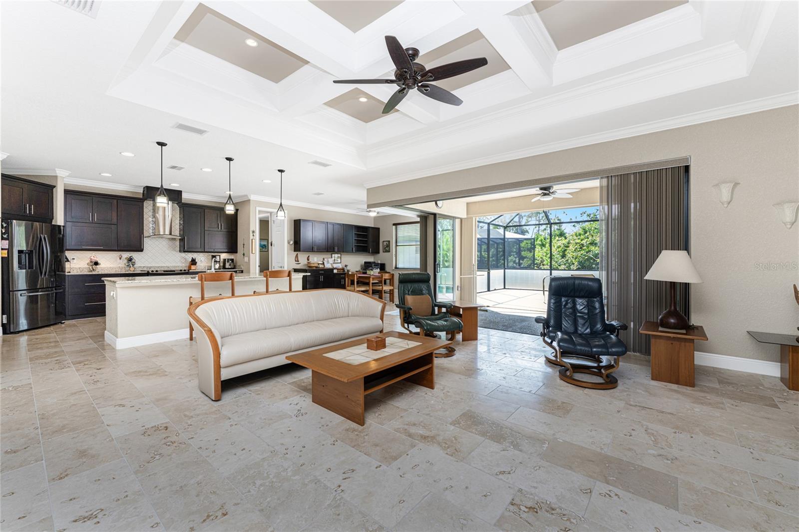 This custom built home has been meticulously maintained and is ready for YOU! Seated on an oversized, corner lot with a circular concrete stamped driveway, all you could dream of has been created with a myriad of additional quality features, details and finishes! As you walk up to the 8' high, double glass doors and step into the foyer, you know this home is going to be everything you want… and more! A spacious "great room" greets you with 12' high coffered & tray ceiling, elegant crown moulding, 8' doorways, and travertine floors throughout most of the home. With the open floor plan you can view the spacious "designer" kitchen with recessed lighting, a large island, dark wood cabinetry with under cabinet lighting, elegant tile backsplash, stunning granite countertops, quality stainless steel appliances including drawer microwave. Enjoy two dining areas--the formal dining room that boasts a 14' double tray ceiling with a stunning chandler, plus the roomy dining area open to the kitchen, with additional cabinets & counter space offering the perfect office space or buffet style dining for all of your holiday gatherings and dinner parties. All of this provides eye-catching views of your surroundings through an 8’ high glass “wall” of sliding and pocketing glass doors with a “zero corner” -- opening the house to your amazing personal retreat, including a spacious (36��� x 11’) covered lanai with a seating area. As if that were not enough, there’s an additional 39’ x 19’ screened enclosure with your private heated pool and nearby outdoor shower – your own private retreat! And there is plenty of room inside this home! With a “split” bedroom plan, the primary suite is separate with a spacious bedroom, tray ceiling with crown moulding, sliding glass pocketing doors to the lanai area, two walk-in closets and the ensuite, spa-like bathroom with separate vanities, large walk-through shower and linen closet. On the opposite side of the house, with a pocket door to ensure privacy for all, there are two additional bedrooms that have laminate flooring and sizeable closets--and the guest bathroom with a tile tub/shower combo & linen closet right outside its door. Combine this with a full 3-car oversized garage giving you plenty of storage – this is a “dream come true” home. Bedroom Closet Type: Walk-in Closet (Primary Bedroom).
