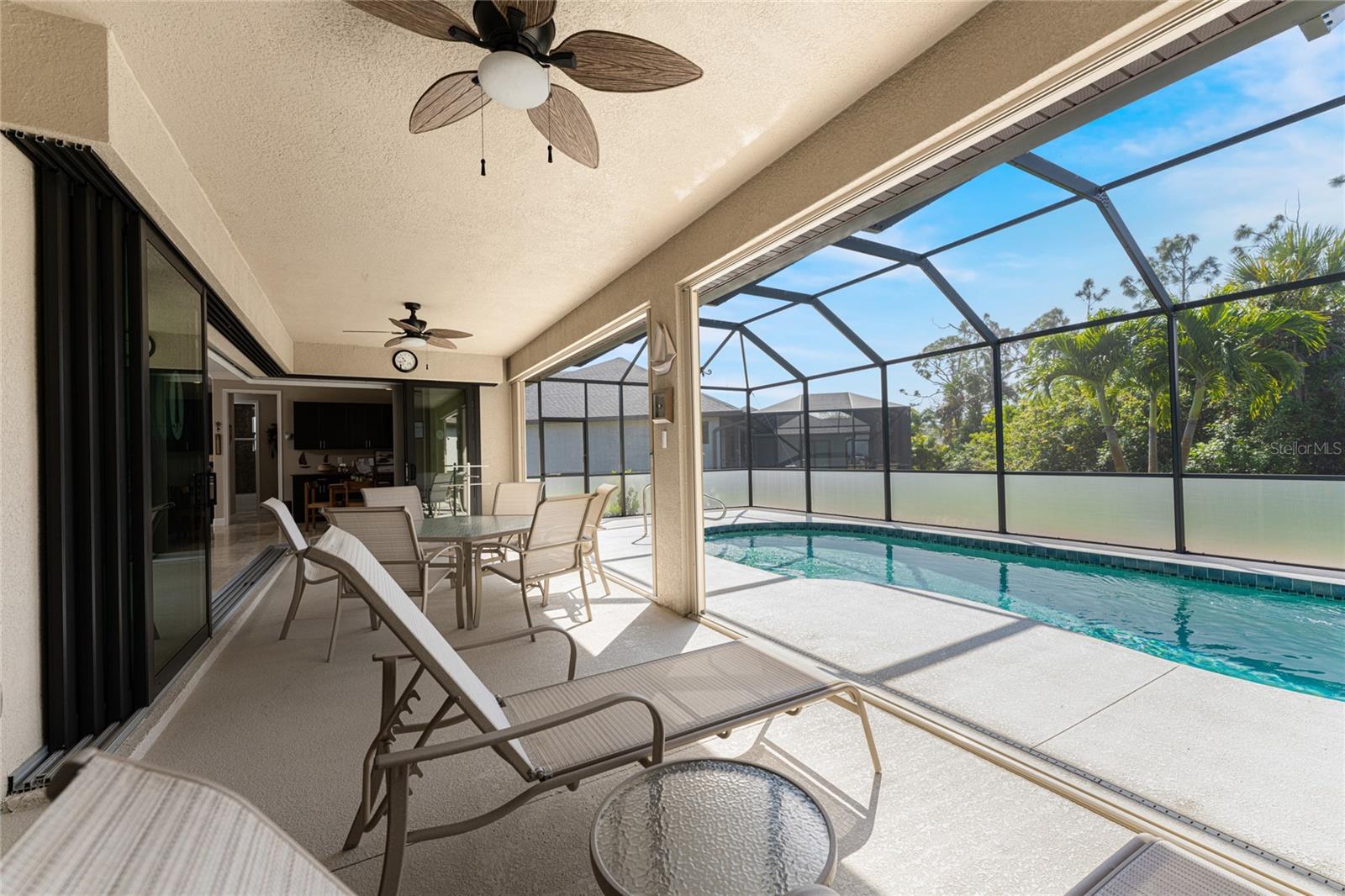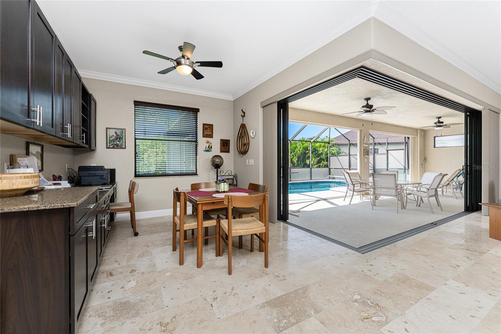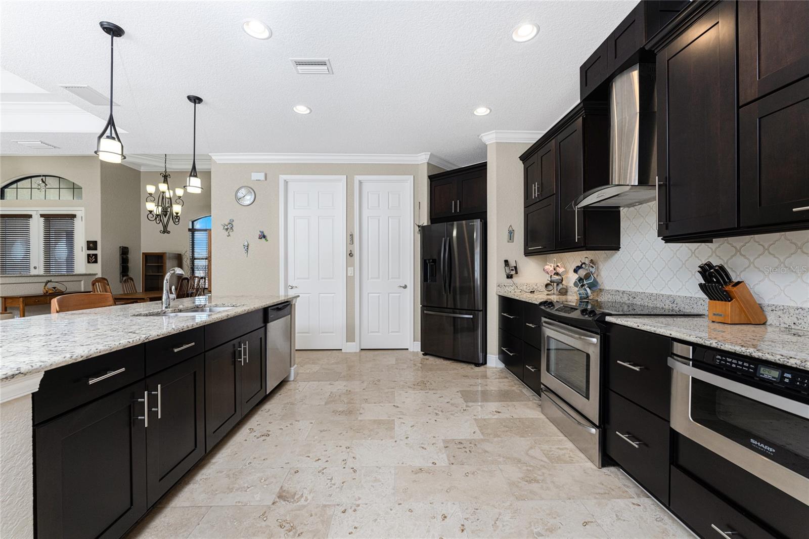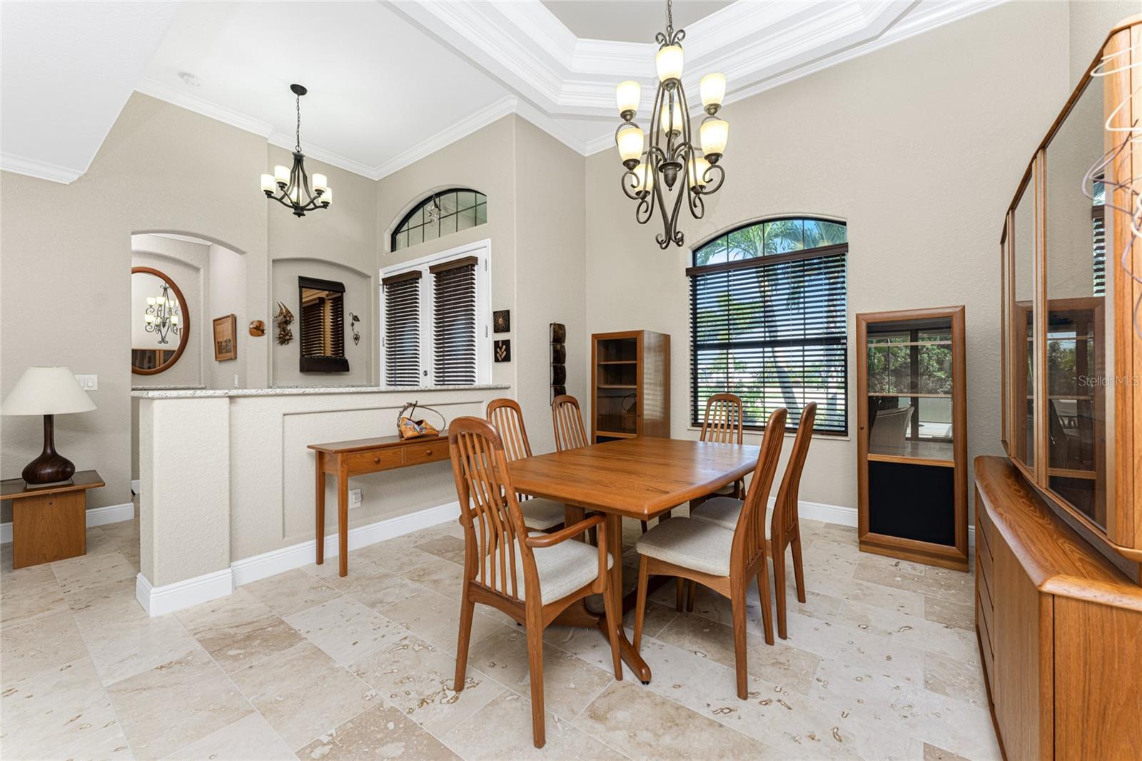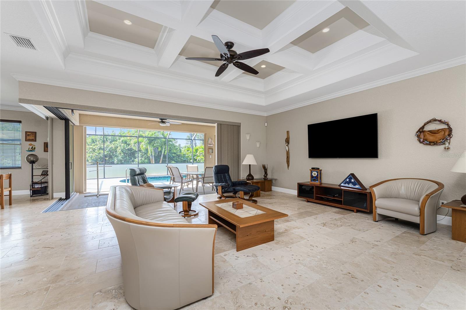 This custom built home has been meticulously maintained and is ready for YOU! Seated on an oversized, corner lot with a circular concrete stamped driveway, all you could dream of has been created with a myriad of additional quality features, details and finishes! As you walk up to the 8' high, double glass doors and step into the foyer, you know this home is going to be everything you want… and more! A spacious "great room" greets you with 12' high coffered & tray ceiling, elegant crown moulding, 8' doorways, and travertine floors throughout most of the home. With the open floor plan you can view the spacious "designer" kitchen with recessed lighting, a large island, dark wood cabinetry with under cabinet lighting, elegant tile backsplash, stunning granite countertops, quality stainless steel appliances including drawer microwave. Enjoy two dining areas--the formal dining room that boasts a 14' double tray ceiling with a stunning chandler, plus the roomy dining area open to the kitchen, with additional cabinets & counter space offering the perfect office space or buffet style dining for all of your holiday gatherings and dinner parties. All of this provides eye-catching views of your surroundings through an 8’ high glass “wall” of sliding and pocketing glass doors with a “zero corner” -- opening the house to your amazing personal retreat, including a spacious (36��� x 11’) covered lanai with a seating area. As if that were not enough, there’s an additional 39’ x 19’ screened enclosure with your private heated pool and nearby outdoor shower – your own private retreat! And there is plenty of room inside this home! With a “split” bedroom plan, the primary suite is separate with a spacious bedroom, tray ceiling with crown moulding, sliding glass pocketing doors to the lanai area, two walk-in closets and the ensuite, spa-like bathroom with separate vanities, large walk-through shower and linen closet. On the opposite side of the house, with a pocket door to ensure privacy for all, there are two additional bedrooms that have laminate flooring and sizeable closets--and the guest bathroom with a tile tub/shower combo & linen closet right outside its door. Combine this with a full 3-car oversized garage giving you plenty of storage – this is a “dream come true” home. Bedroom Closet Type: Walk-in Closet (Primary Bedroom).