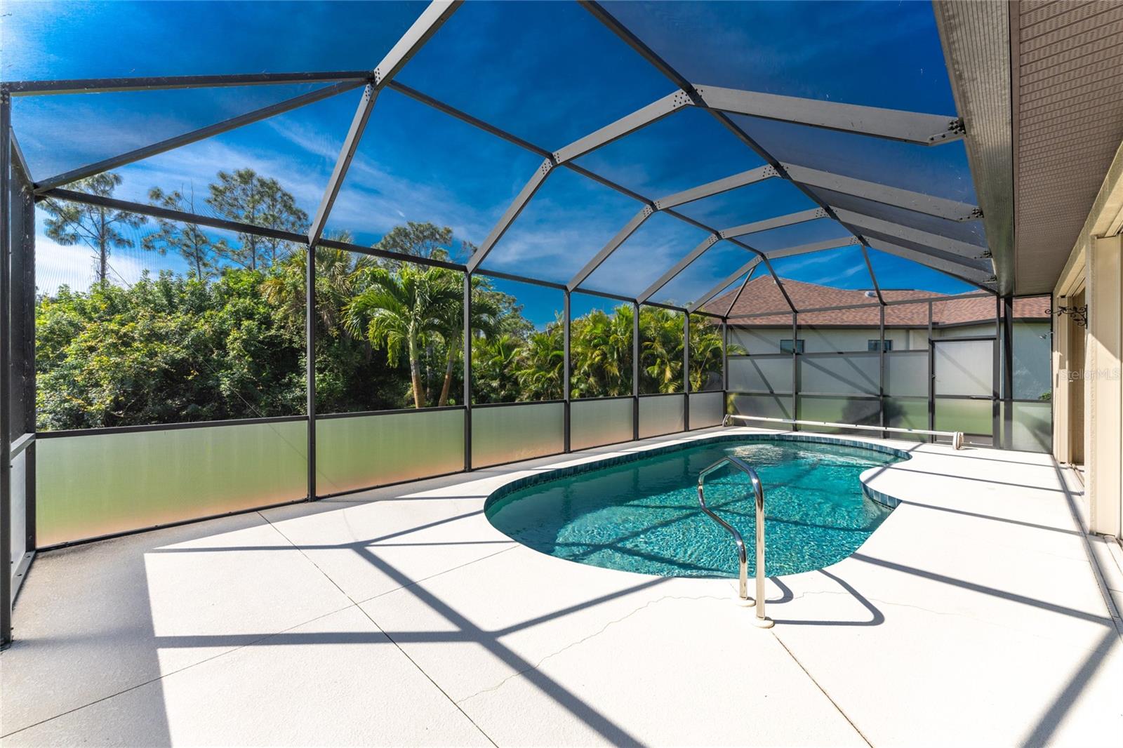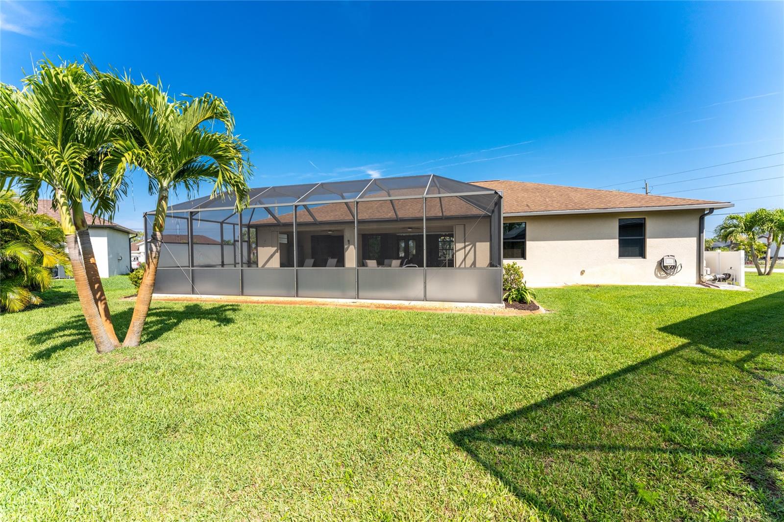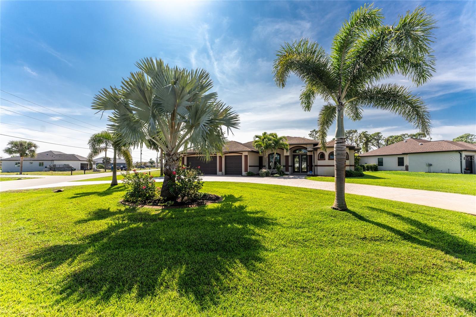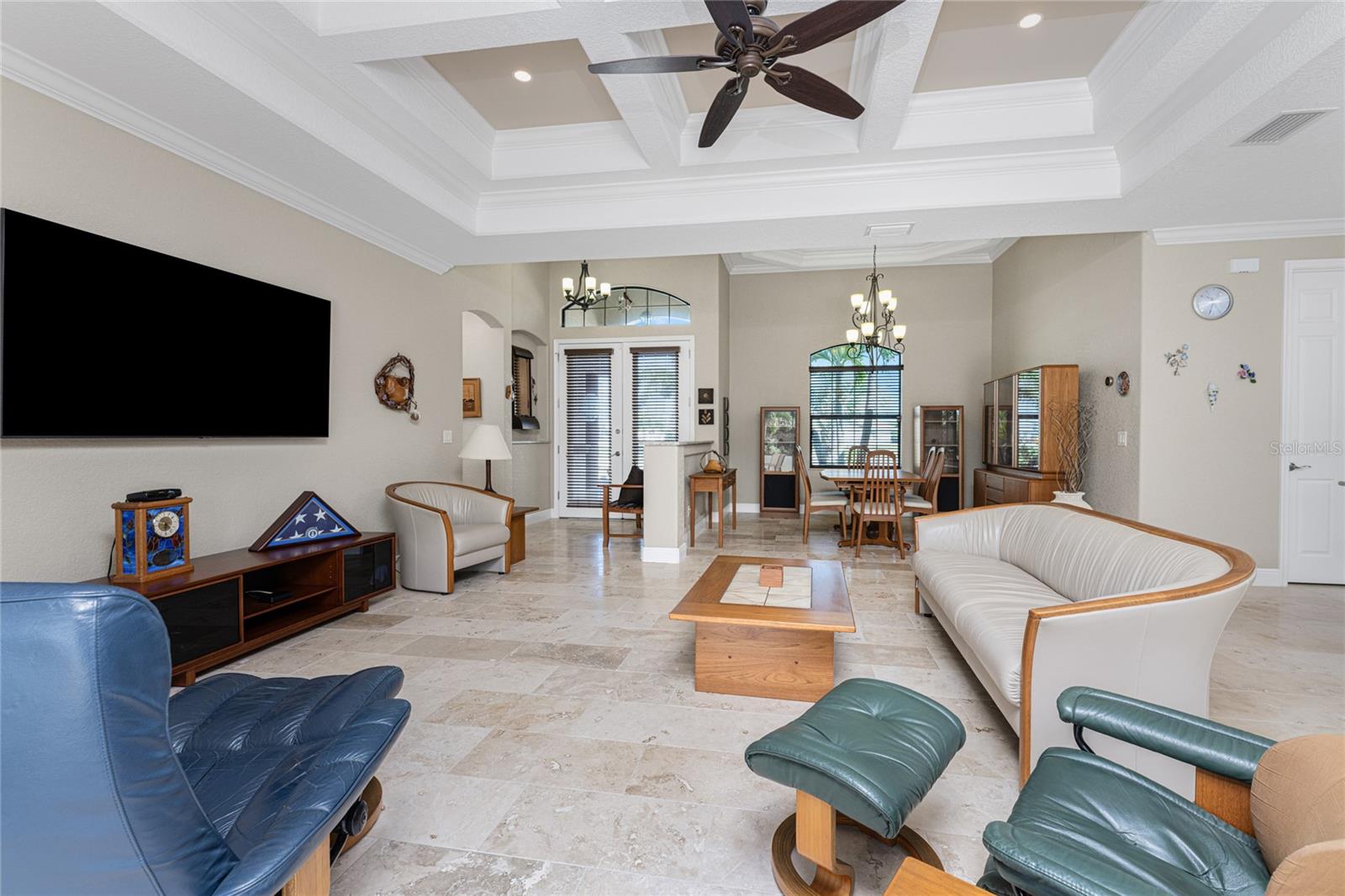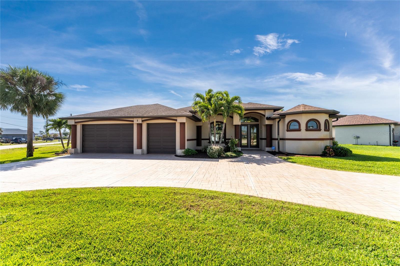 This custom built home has been meticulously maintained and is ready for YOU! Seated on an oversized, corner lot with a circular concrete stamped driveway, all you could dream of has been created with a myriad of additional quality features, details and finishes! As you walk up to the 8' high, double glass doors and step into the foyer, you know this home is going to be everything you want… and more! A spacious "great room" greets you with 12' high coffered & tray ceiling, elegant crown moulding, 8' doorways, and travertine floors throughout most of the home. With the open floor plan you can view the spacious "designer" kitchen with recessed lighting, a large island, dark wood cabinetry with under cabinet lighting, elegant tile backsplash, stunning granite countertops, quality stainless steel appliances including drawer microwave. Enjoy two dining areas--the formal dining room that boasts a 14' double tray ceiling with a stunning chandler, plus the roomy dining area open to the kitchen, with additional cabinets & counter space offering the perfect office space or buffet style dining for all of your holiday gatherings and dinner parties. All of this provides eye-catching views of your surroundings through an 8’ high glass “wall” of sliding and pocketing glass doors with a “zero corner” -- opening the house to your amazing personal retreat, including a spacious (36��� x 11’) covered lanai with a seating area. As if that were not enough, there’s an additional 39’ x 19’ screened enclosure with your private heated pool and nearby outdoor shower – your own private retreat! And there is plenty of room inside this home! With a “split” bedroom plan, the primary suite is separate with a spacious bedroom, tray ceiling with crown moulding, sliding glass pocketing doors to the lanai area, two walk-in closets and the ensuite, spa-like bathroom with separate vanities, large walk-through shower and linen closet. On the opposite side of the house, with a pocket door to ensure privacy for all, there are two additional bedrooms that have laminate flooring and sizeable closets--and the guest bathroom with a tile tub/shower combo & linen closet right outside its door. Combine this with a full 3-car oversized garage giving you plenty of storage – this is a “dream come true” home. Bedroom Closet Type: Walk-in Closet (Primary Bedroom).
