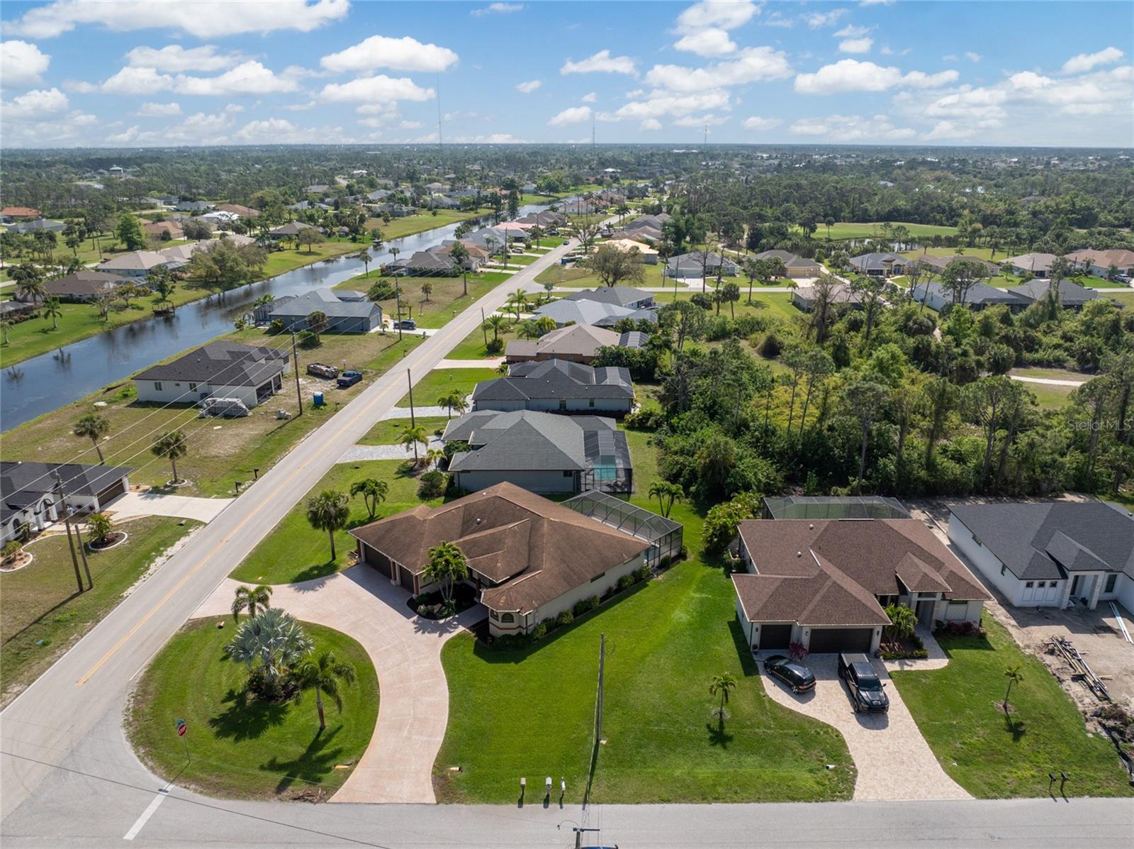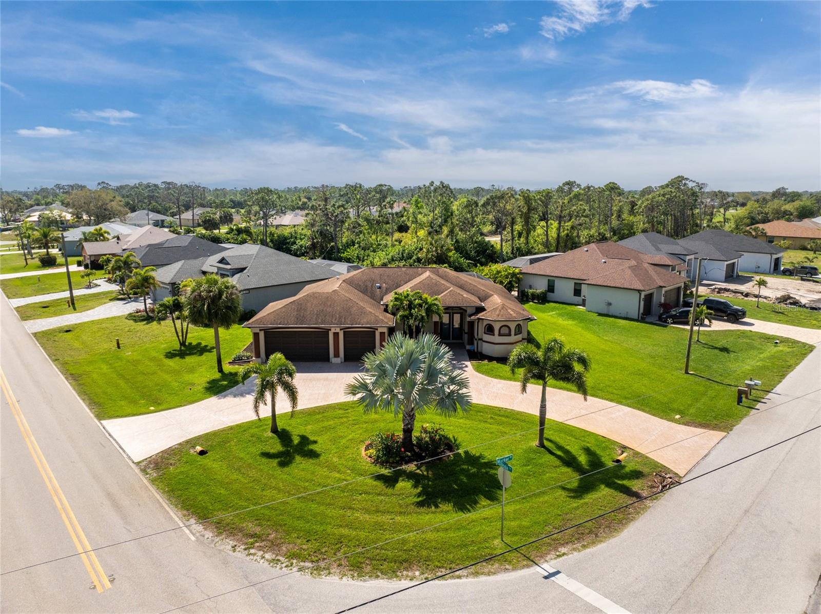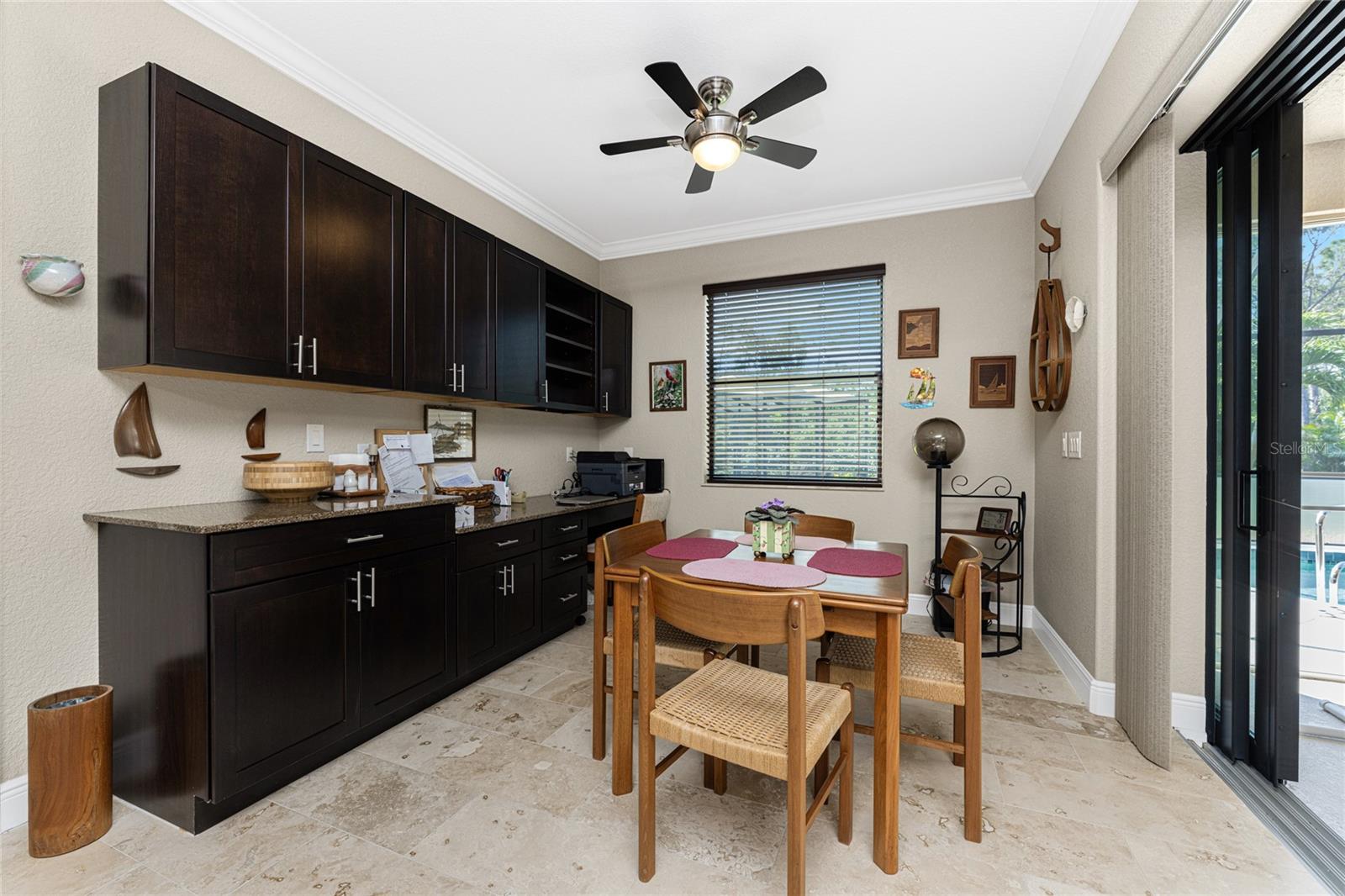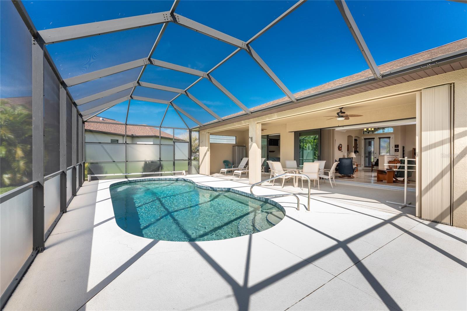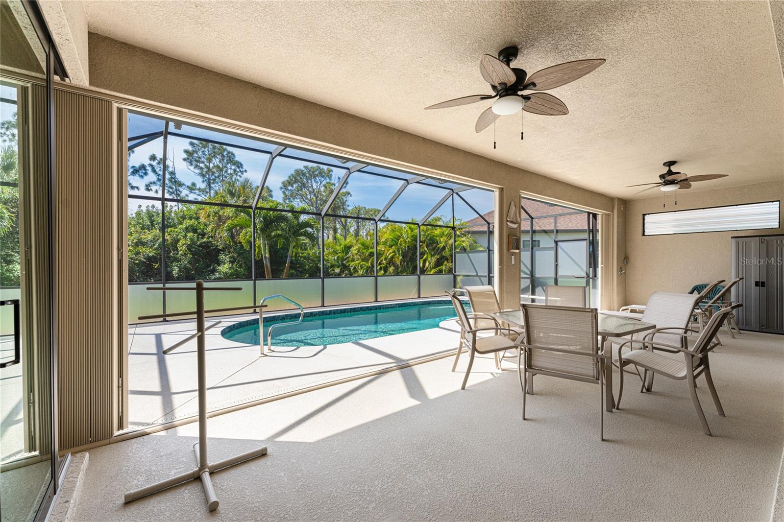 This custom built home has been meticulously maintained and is ready for YOU! Seated on an oversized, corner lot with a circular concrete stamped driveway, all you could dream of has been created with a myriad of additional quality features, details and finishes! As you walk up to the 8' high, double glass doors and step into the foyer, you know this home is going to be everything you want… and more! A spacious "great room" greets you with 12' high coffered & tray ceiling, elegant crown moulding, 8' doorways, and travertine floors throughout most of the home. With the open floor plan you can view the spacious "designer" kitchen with recessed lighting, a large island, dark wood cabinetry with under cabinet lighting, elegant tile backsplash, stunning granite countertops, quality stainless steel appliances including drawer microwave. Enjoy two dining areas--the formal dining room that boasts a 14' double tray ceiling with a stunning chandler, plus the roomy dining area open to the kitchen, with additional cabinets & counter space offering the perfect office space or buffet style dining for all of your holiday gatherings and dinner parties. All of this provides eye-catching views of your surroundings through an 8’ high glass “wall” of sliding and pocketing glass doors with a “zero corner” -- opening the house to your amazing personal retreat, including a spacious (36��� x 11’) covered lanai with a seating area. As if that were not enough, there’s an additional 39’ x 19’ screened enclosure with your private heated pool and nearby outdoor shower – your own private retreat! And there is plenty of room inside this home! With a “split” bedroom plan, the primary suite is separate with a spacious bedroom, tray ceiling with crown moulding, sliding glass pocketing doors to the lanai area, two walk-in closets and the ensuite, spa-like bathroom with separate vanities, large walk-through shower and linen closet. On the opposite side of the house, with a pocket door to ensure privacy for all, there are two additional bedrooms that have laminate flooring and sizeable closets--and the guest bathroom with a tile tub/shower combo & linen closet right outside its door. Combine this with a full 3-car oversized garage giving you plenty of storage – this is a “dream come true” home. Bedroom Closet Type: Walk-in Closet (Primary Bedroom).