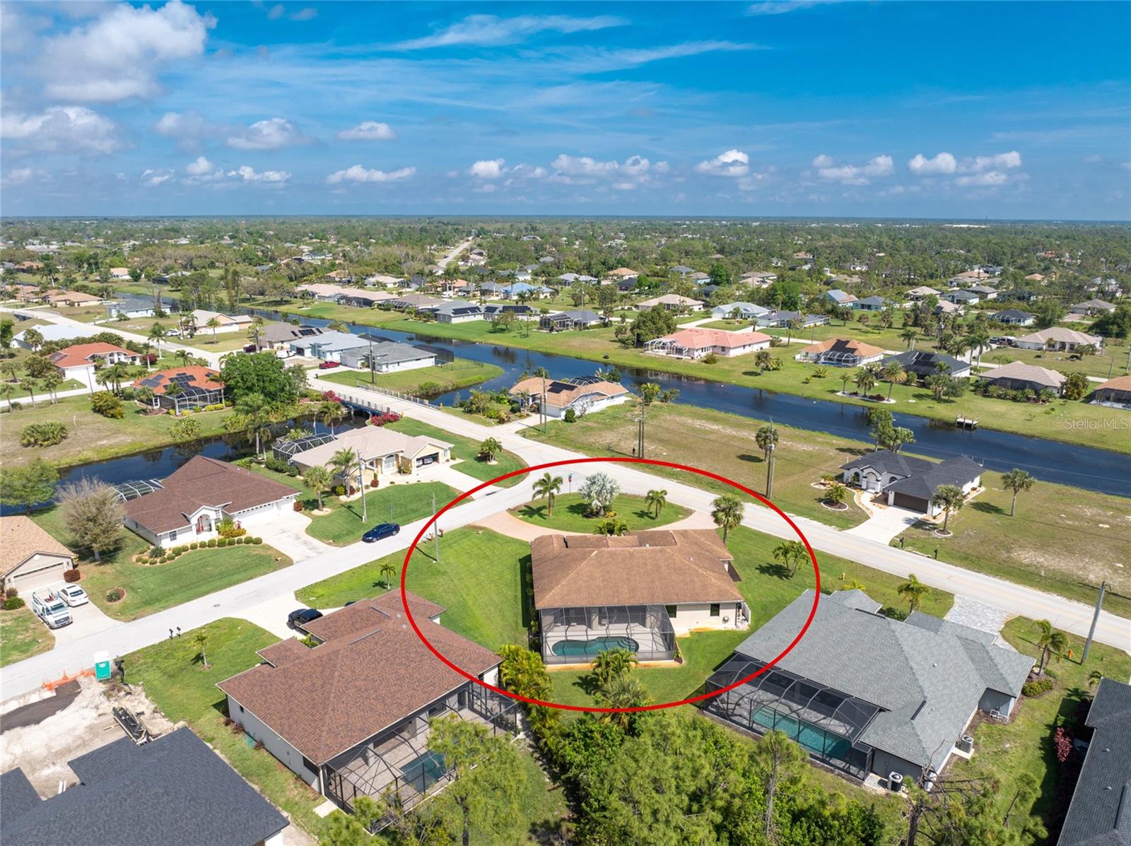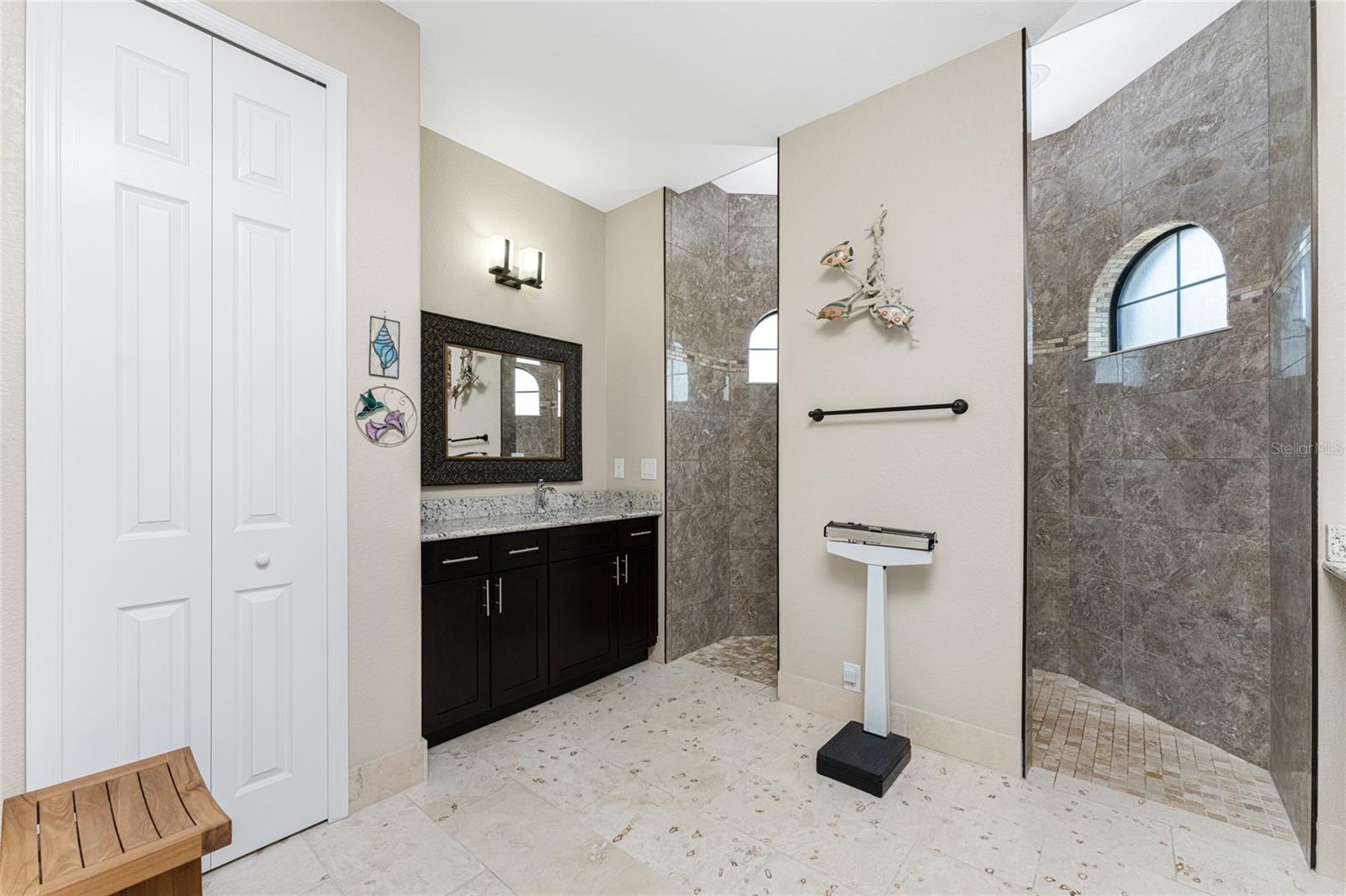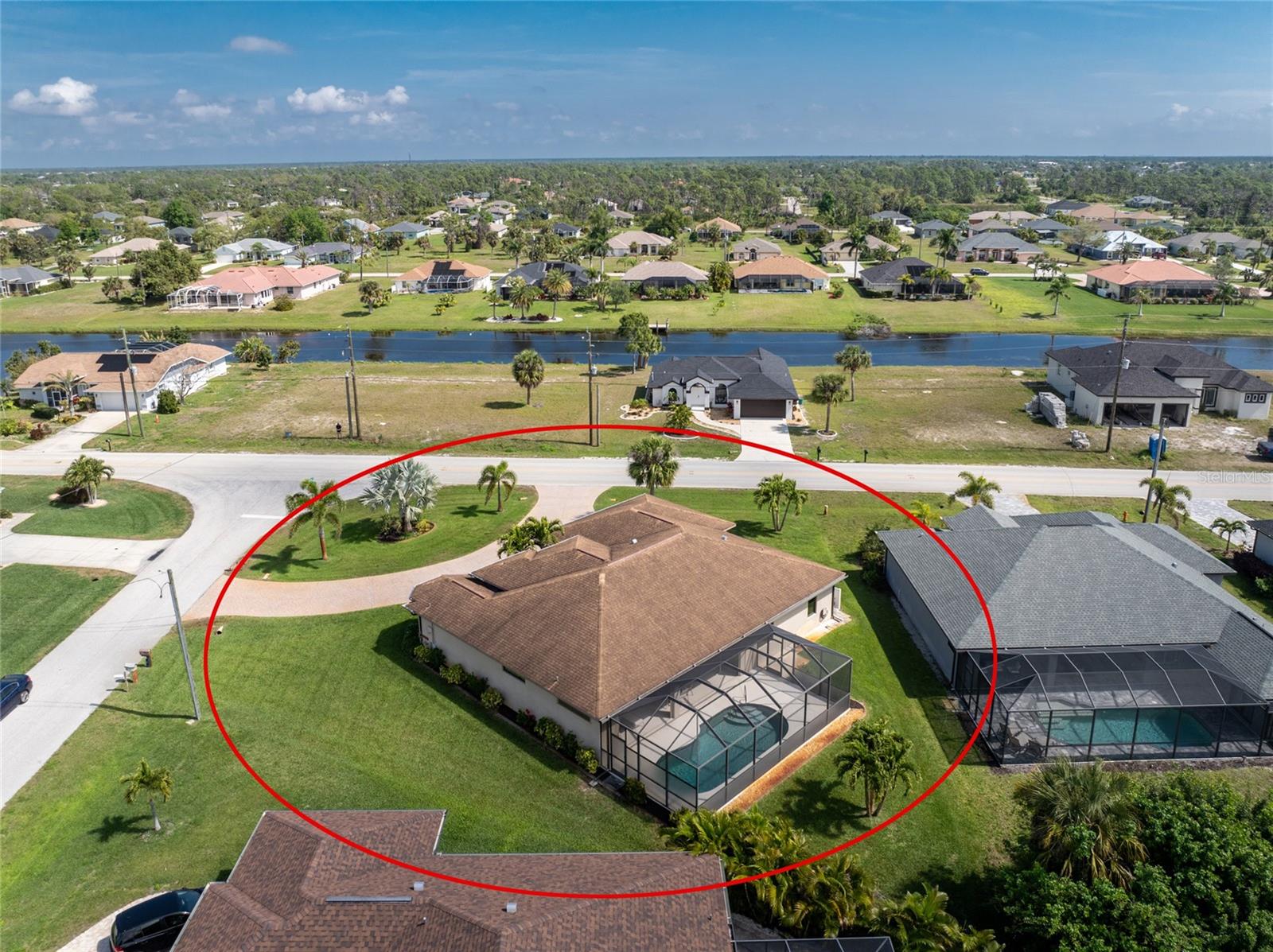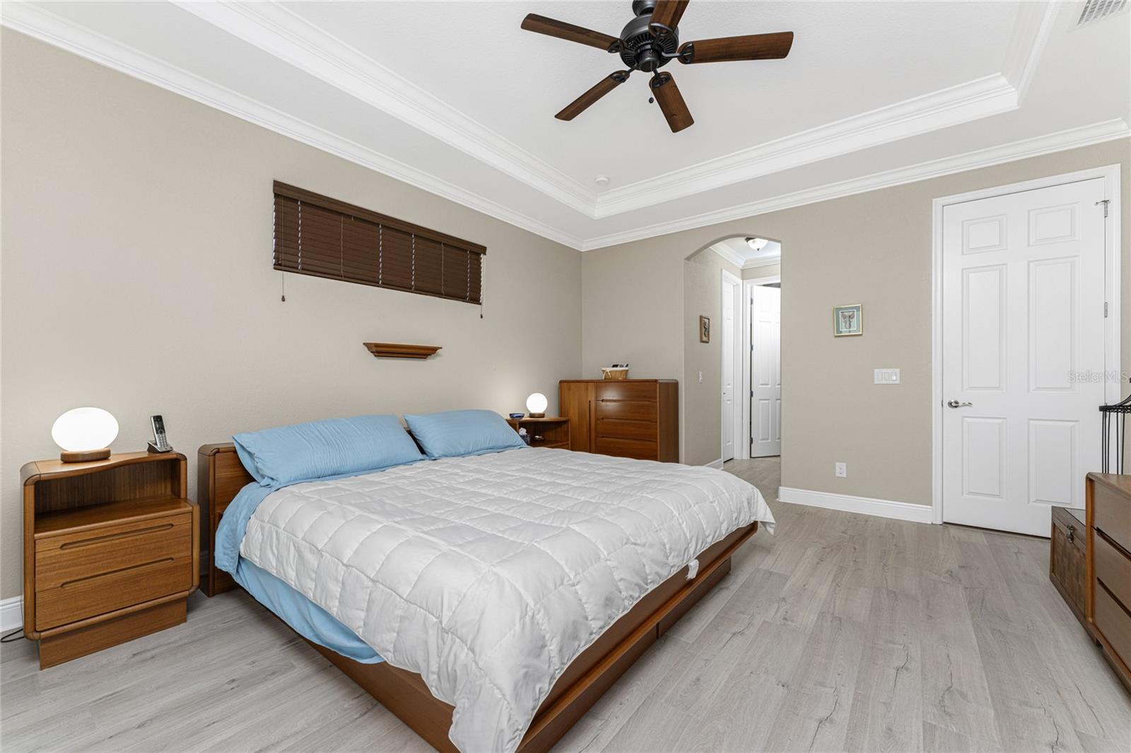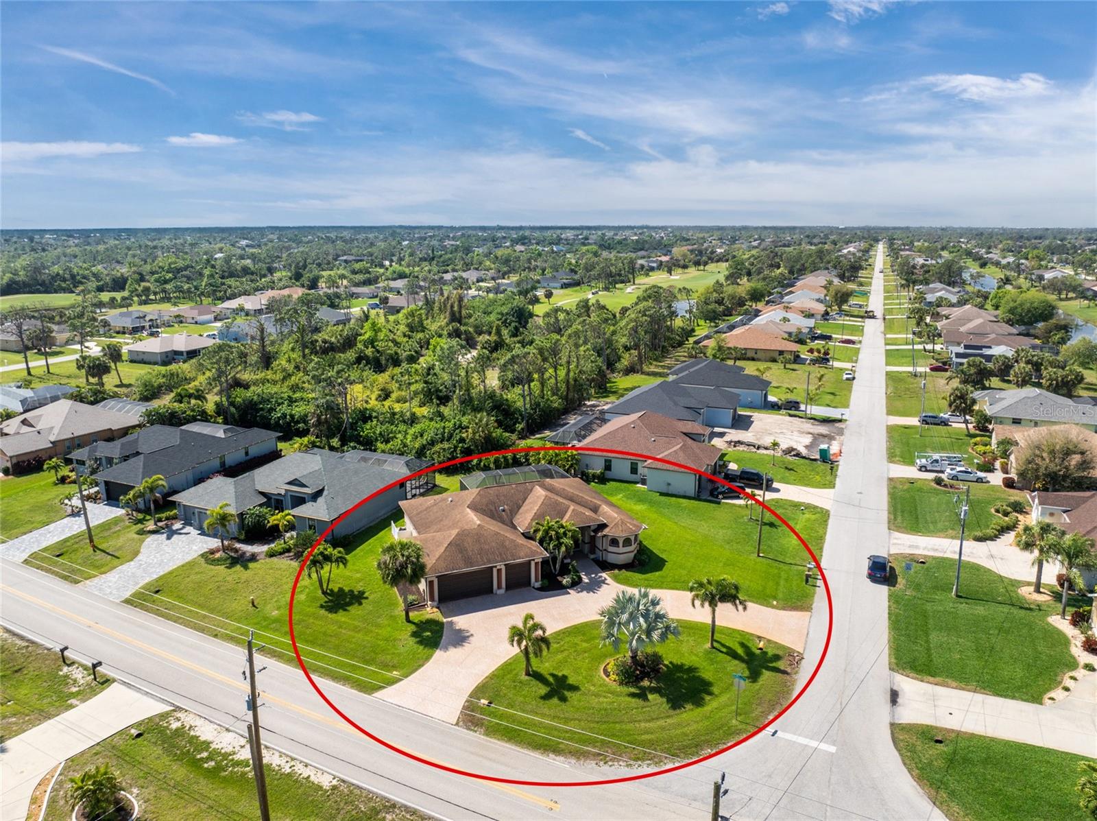 This custom built home has been meticulously maintained and is ready for YOU! Seated on an oversized, corner lot with a circular concrete stamped driveway, all you could dream of has been created with a myriad of additional quality features, details and finishes! As you walk up to the 8' high, double glass doors and step into the foyer, you know this home is going to be everything you want… and more! A spacious "great room" greets you with 12' high coffered & tray ceiling, elegant crown moulding, 8' doorways, and travertine floors throughout most of the home. With the open floor plan you can view the spacious "designer" kitchen with recessed lighting, a large island, dark wood cabinetry with under cabinet lighting, elegant tile backsplash, stunning granite countertops, quality stainless steel appliances including drawer microwave. Enjoy two dining areas--the formal dining room that boasts a 14' double tray ceiling with a stunning chandler, plus the roomy dining area open to the kitchen, with additional cabinets & counter space offering the perfect office space or buffet style dining for all of your holiday gatherings and dinner parties. All of this provides eye-catching views of your surroundings through an 8’ high glass “wall” of sliding and pocketing glass doors with a “zero corner” -- opening the house to your amazing personal retreat, including a spacious (36��� x 11’) covered lanai with a seating area. As if that were not enough, there’s an additional 39’ x 19’ screened enclosure with your private heated pool and nearby outdoor shower – your own private retreat! And there is plenty of room inside this home! With a “split” bedroom plan, the primary suite is separate with a spacious bedroom, tray ceiling with crown moulding, sliding glass pocketing doors to the lanai area, two walk-in closets and the ensuite, spa-like bathroom with separate vanities, large walk-through shower and linen closet. On the opposite side of the house, with a pocket door to ensure privacy for all, there are two additional bedrooms that have laminate flooring and sizeable closets--and the guest bathroom with a tile tub/shower combo & linen closet right outside its door. Combine this with a full 3-car oversized garage giving you plenty of storage – this is a “dream come true” home. Bedroom Closet Type: Walk-in Closet (Primary Bedroom).