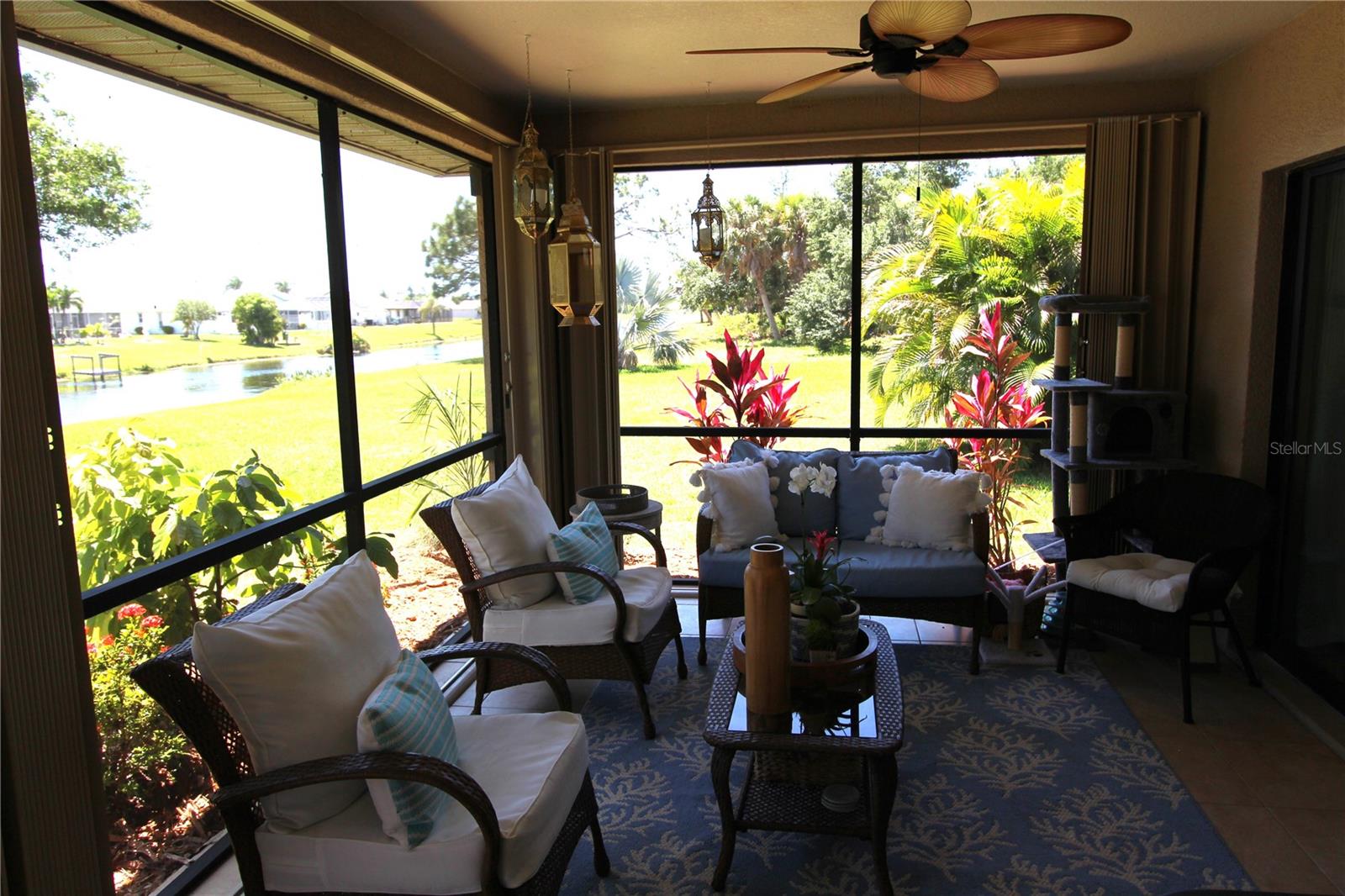 REDUCED PRICED TO SELL! ALL OF THE RIGHT INGREDIENTS PLUS WATER VIEWS combined to make this roomy 2-Bedroom, 2-Bath condominium an exceptional find! Located in the Gulf Course Community of Rotonda West, just minutes from Boca Grande and Englewood Beaches, this tastefully furnished home features an open floor plan with large Livingroom/Dining area, inviting double French doors to nice size den/office, a light and bright kitchen with granite counter tops, solid wood cabinets, and a breakfast bar to entertain family and friends. The Primary Bedroom enjoys a Walk-In Closet and En-Suite Bathroom with Double-Sink Vanity and Tub-Shower combination. The 2nd bedroom features a walk-In closet. The Guest Bathroom includes a single vanity and walk-in Shower. The enclosed rear porch offers beautiful views of the community dock and canal; the 1-car garage adds extra storage for your beach chairs and bike and there is a large extra storage room off the lanai. This home is being sold partially furnished. The 2 beds, a large mirror in the front bedroom, TV and personal items do not convey. Enjoy this community’s Florida lifestyle offering many recreational opportunities such as Golfing, Boating, Fishing, Tennis, Hiking trails and just minutes to our area’s beaches.