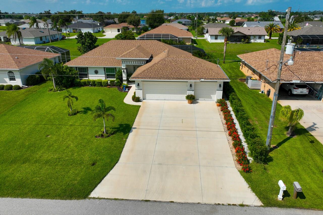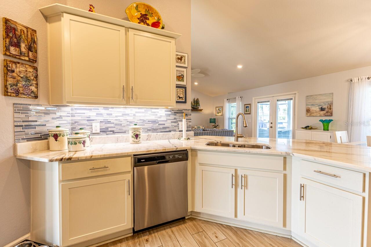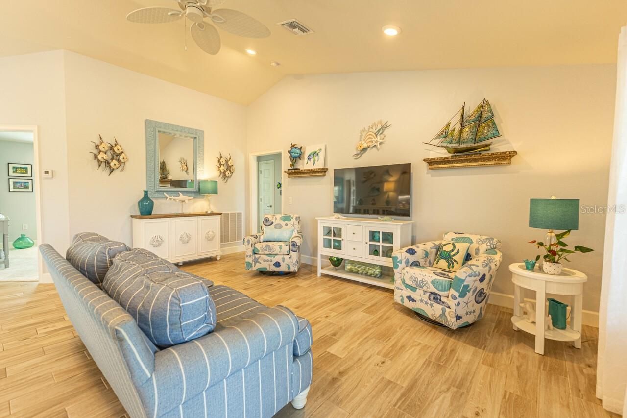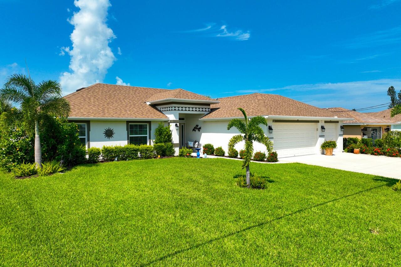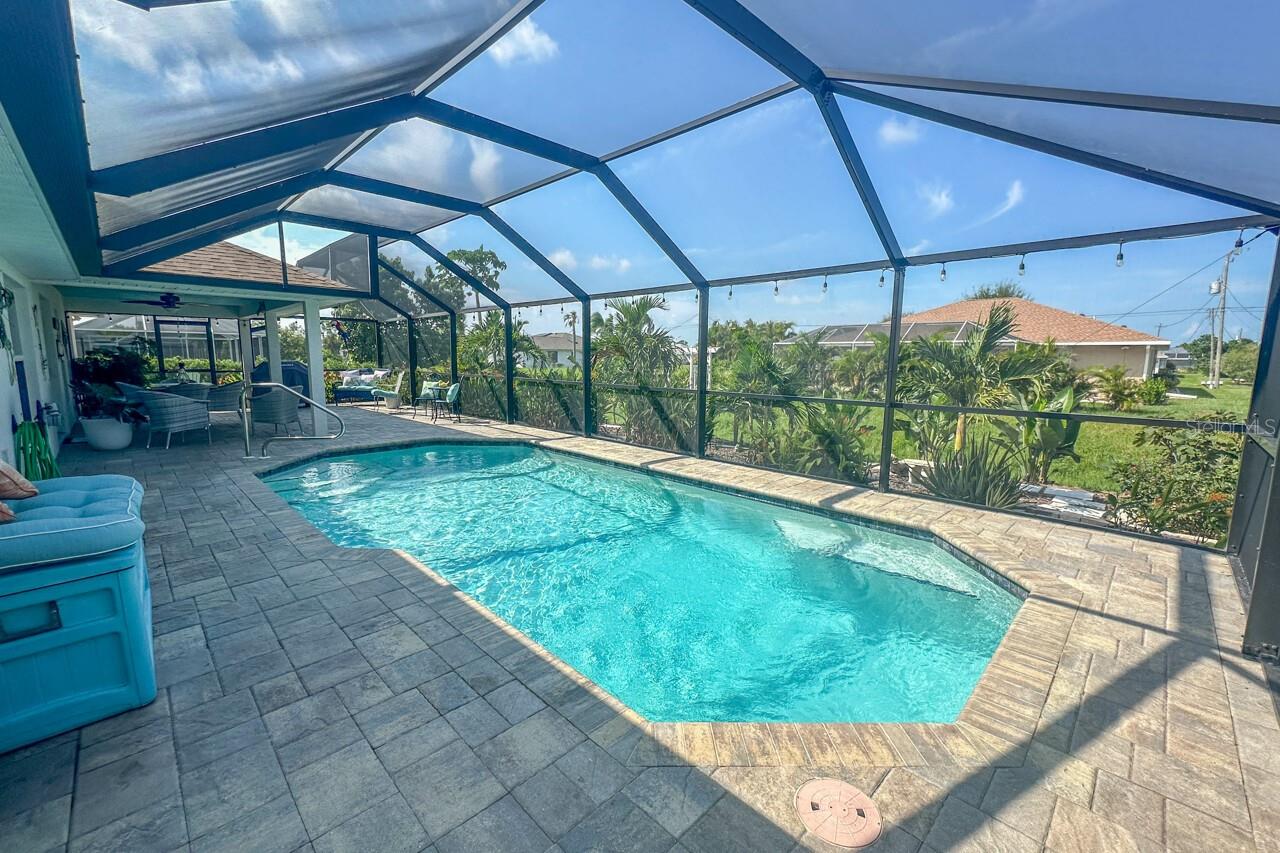 This well-maintained home features four bedrooms, a three-car garage, and a saltwater pool, along with numerous amenities. The interior boasts recent updates, including new marble countertops in the kitchen and bathrooms. The kitchen offers an open layout, stainless steel appliances, white shaker cabinets, under cabinet lighting and a glass tile backsplash. The flooring is a mix of wood-look tile planks and plush carpeting in the bedrooms. A split floor plan with cathedral ceilings and ample natural light enhances the home's open feel. Custom drapes, blinds, updated fans, and light fixtures are present throughout. The master bathroom includes dual vanities, a modern glass shower, and marble countertops. Outside, there is a large, heated pool with an extensive screened deck and an additional paved area for entertainment. The landscaping features fruit trees, exotic plants, and palm trees, with walkways, irrigation, and landscape lighting. The home also has storm shutters and a generator-ready electrical hookup.