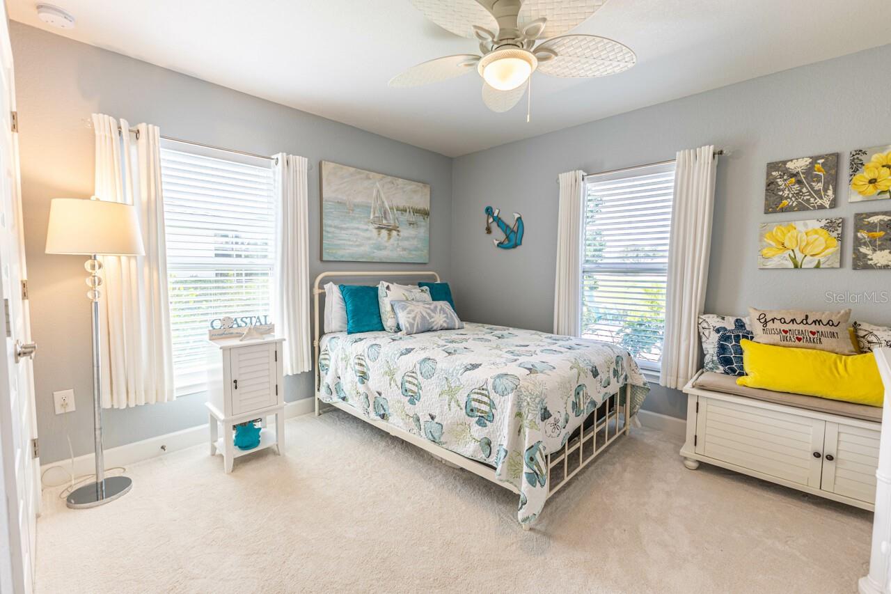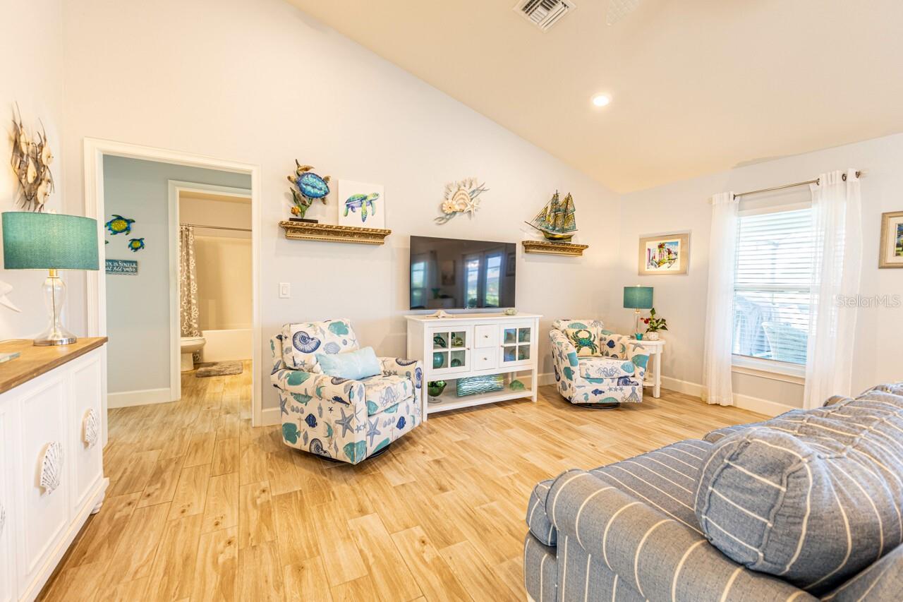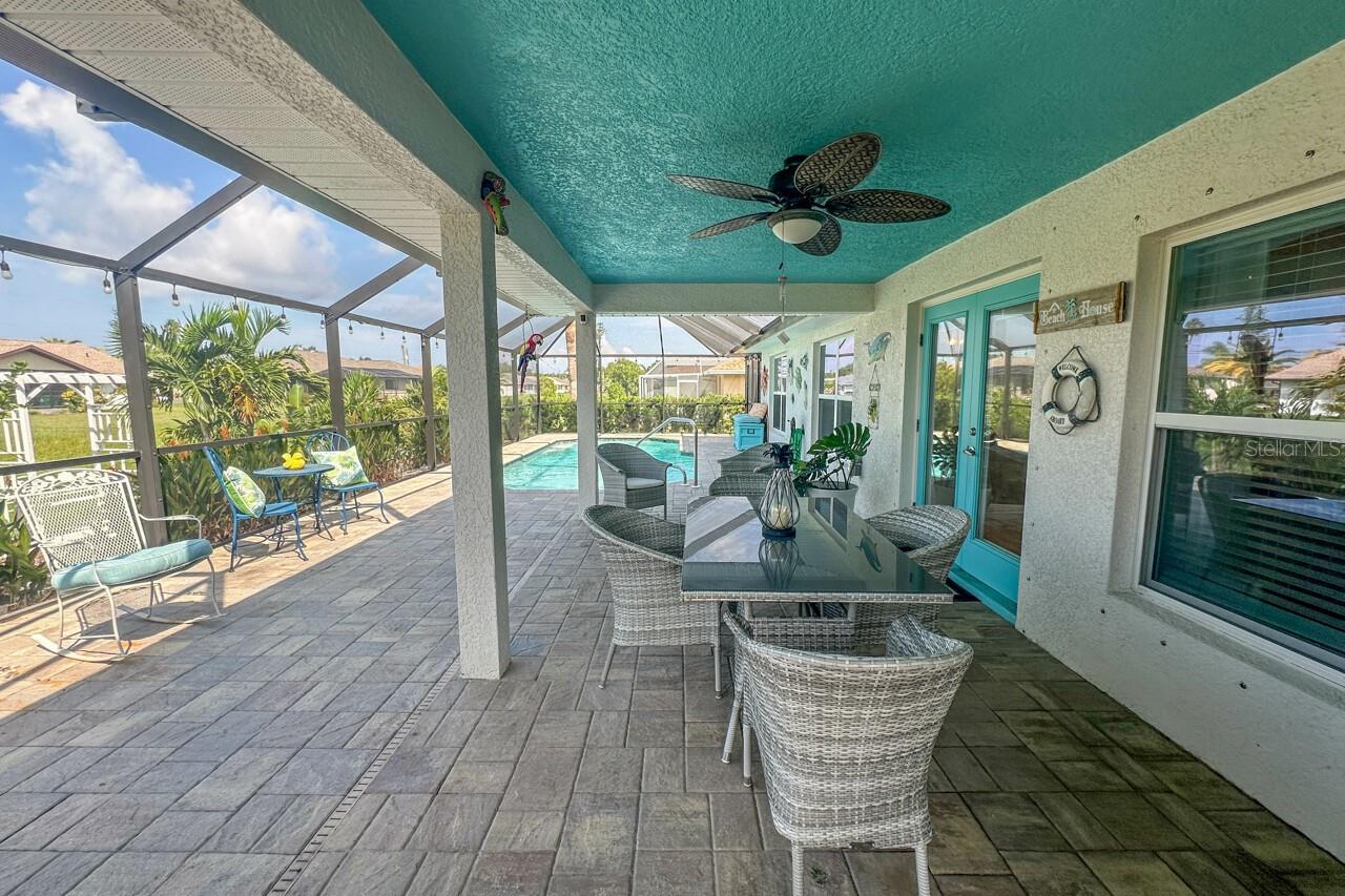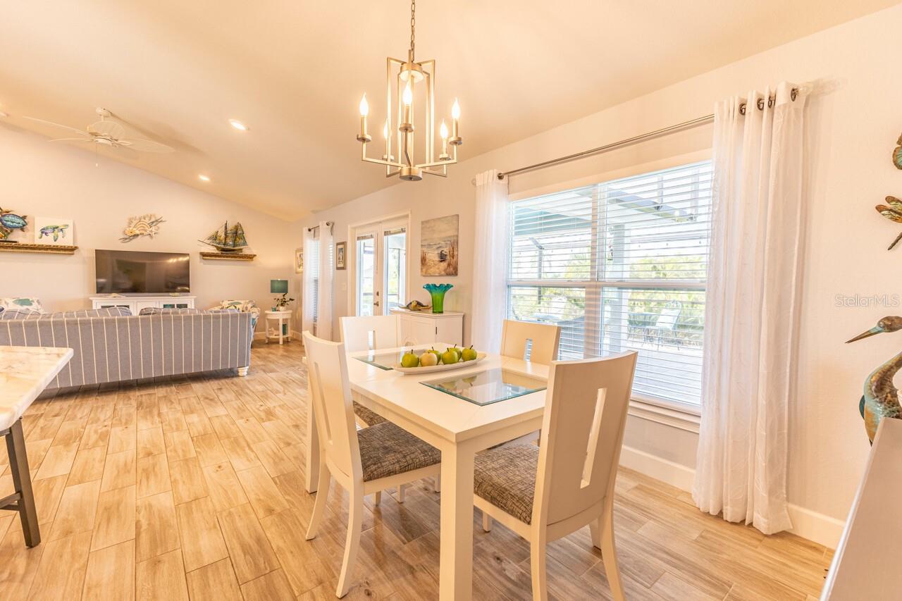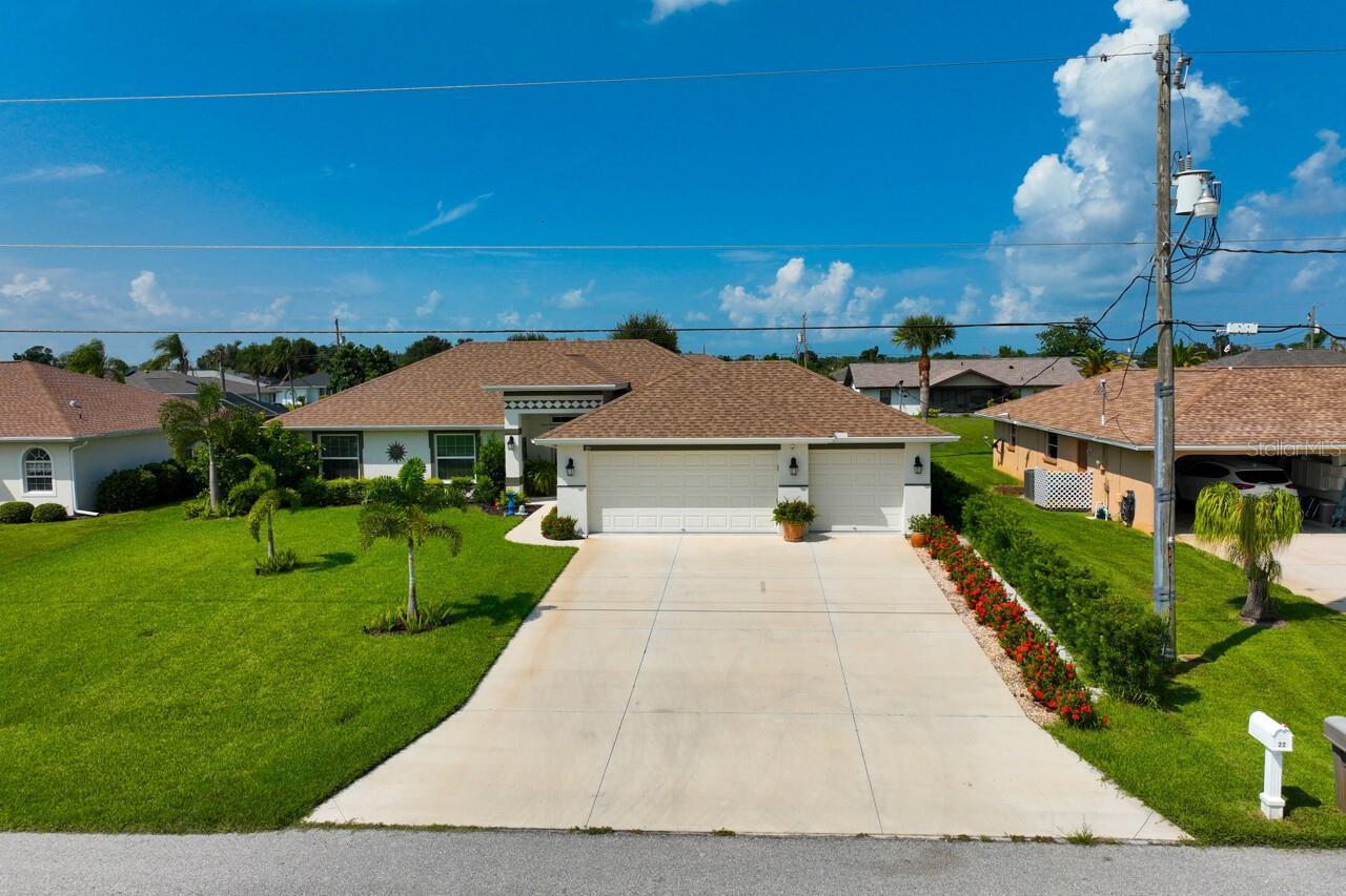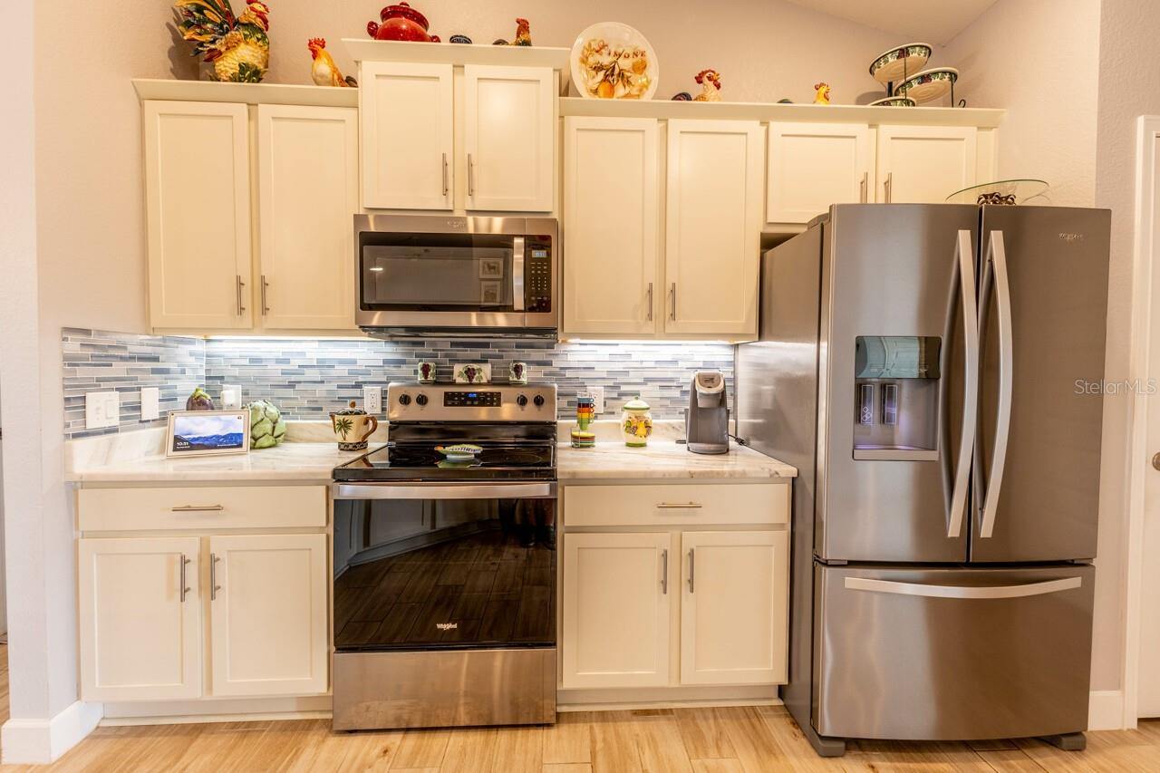 This well-maintained home features four bedrooms, a three-car garage, and a saltwater pool, along with numerous amenities. The interior boasts recent updates, including new marble countertops in the kitchen and bathrooms. The kitchen offers an open layout, stainless steel appliances, white shaker cabinets, under cabinet lighting and a glass tile backsplash. The flooring is a mix of wood-look tile planks and plush carpeting in the bedrooms. A split floor plan with cathedral ceilings and ample natural light enhances the home's open feel. Custom drapes, blinds, updated fans, and light fixtures are present throughout. The master bathroom includes dual vanities, a modern glass shower, and marble countertops. Outside, there is a large, heated pool with an extensive screened deck and an additional paved area for entertainment. The landscaping features fruit trees, exotic plants, and palm trees, with walkways, irrigation, and landscape lighting. The home also has storm shutters and a generator-ready electrical hookup.