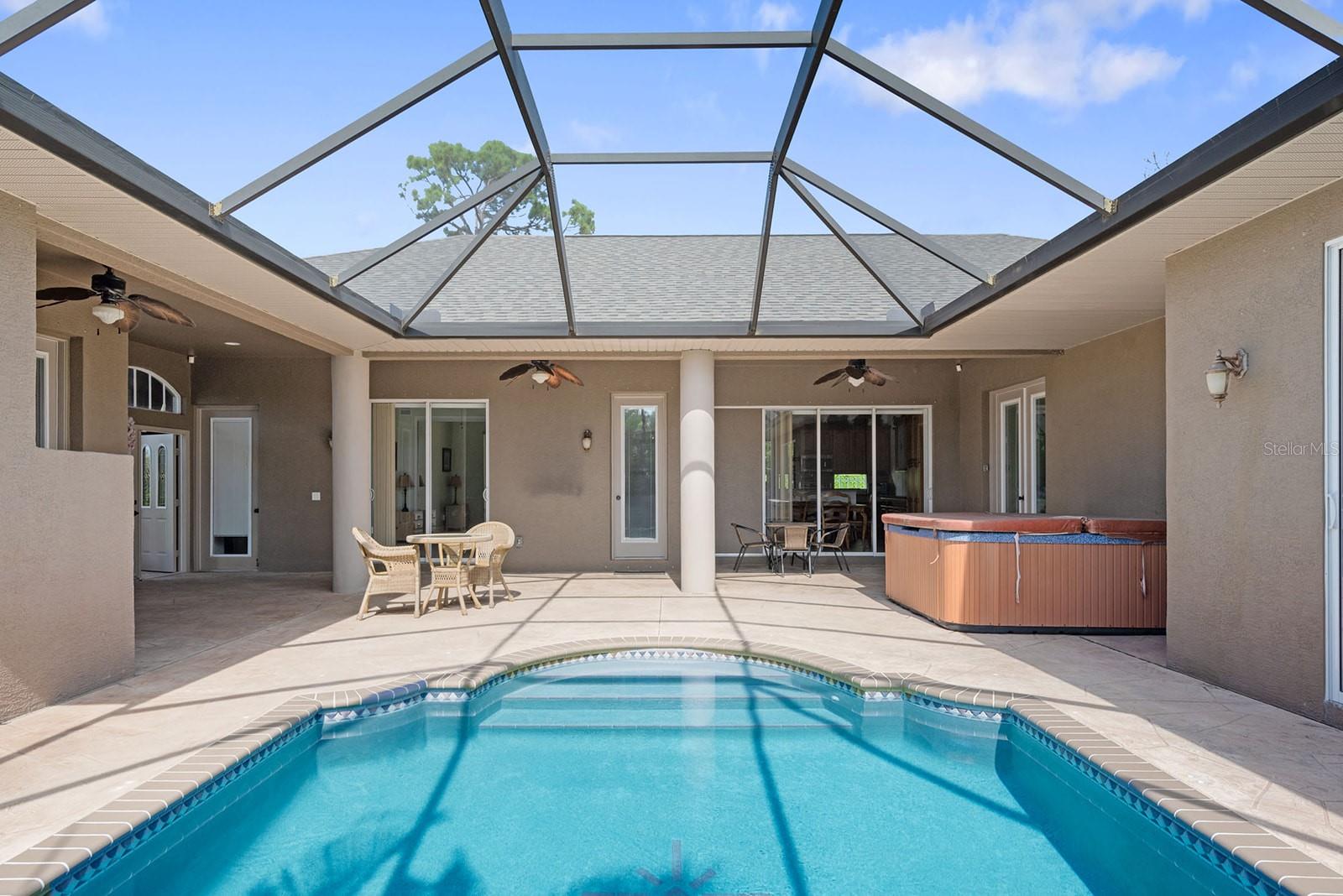 This COURT YARD POOL features new 2023 ROOFS, newer HVACS, hurricane shutters and a new ALUMINUM SCREEN CAGE! Beautifully crafted and set on an OVERSIZED LOT this home boasts a variety of exceptional features on one of the nicest looking streets in Rotonda West. A screened entryway leads you into a charming courtyard, where you'll find a spacious pool and lanai area complete with an outdoor summer kitchen including sink, stovetop and space for a small fridge. The SEPARATE 317 SQUARE FOOT (ADU) GUEST SUITE includes a large walk-in closet and a full bath, providing privacy and comfort – perfect for an IN-LAW SUITE, pool house or rental with shared pool access. The MAIN HOUSE, boasts over 1,800 square feet where you can enjoy elegant living and dining rooms, a third bathroom with easy access to the pool, and multiple sliders in almost every room that open to the courtyard—perfect for embracing the Florida weather and indoor/outdoor living. The kitchen is a chef’s dream, with granite countertops, a breakfast bar and nook, stainless steel appliances including an extended arm pot filler faucet over the oven range and gorgeous hardwood cabinets. The master suite offers a massive walk-in closet with spa like ensuite, garden tub, separate walk-in shower, granite countertops, and dual sinks. This home is a must-see for those seeking luxury and relaxation! A BONUS ROOM was made out of the previous interior laundry room for additional sleeping space or could make for a great office, walk-in pantry/storage room or easily converted back. Currently the washer/dryer are hooked up in the oversized two car garage. Rotonda West is a LOW HOA community with multiple parks, sidewalks, golf courses and more to explore along with being conveniently located just miles from restaurants, shopping, Boca Grande, Manasota Key and multiple gulf beaches.