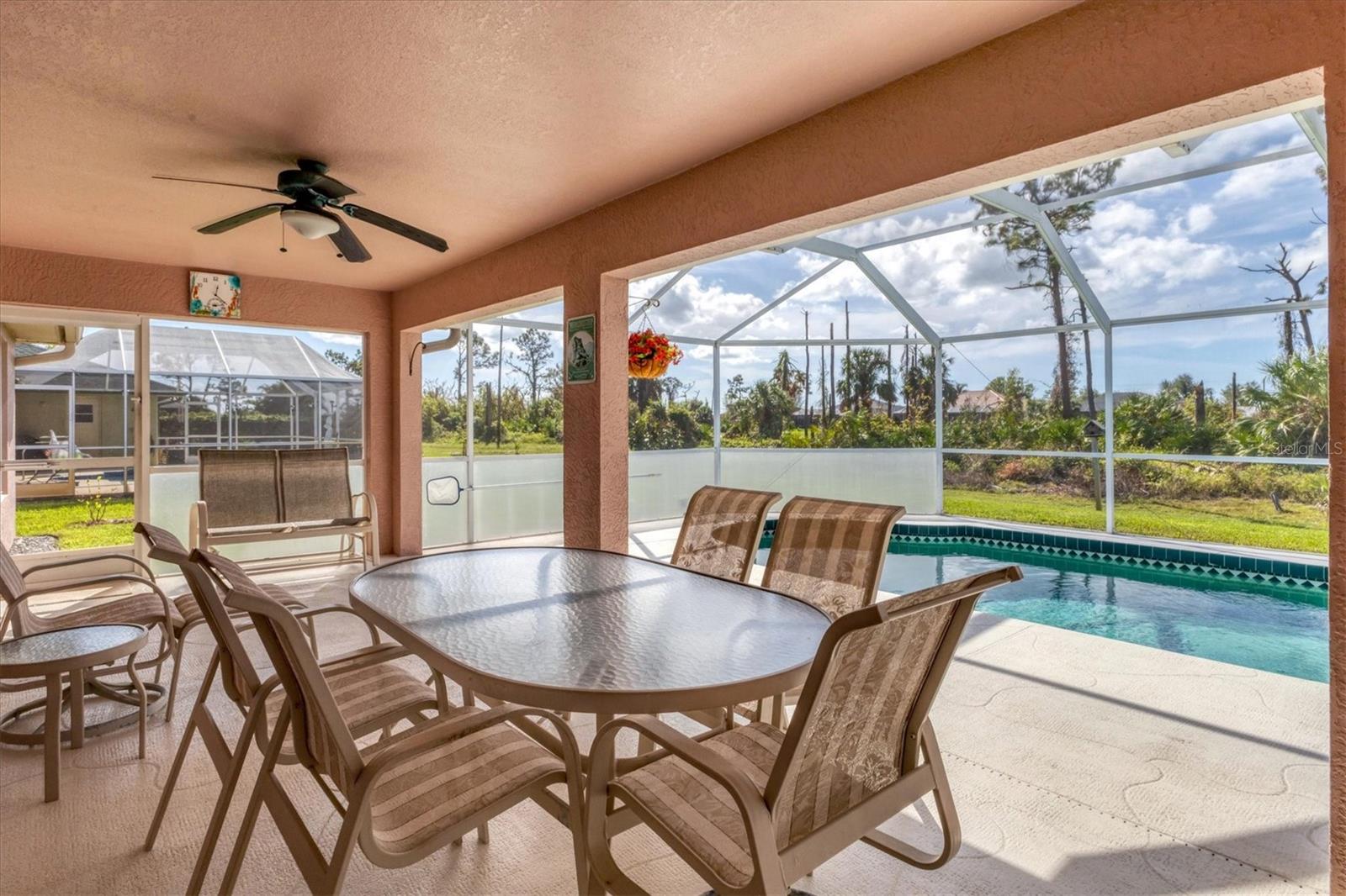 Welcome to 3 Pinehurst Ct, an exquisite 3-bedroom, 2-bath split-plan heated pool home, offering 2,000 square feet of beautifully FURNISHED, move-in-ready comfort in the highly desirable Rotonda West community. Located in an X FLOOD ZONE. This stunning property, perfect as a primary residence or a turn-key rental, combines modern luxury with the ultimate Florida lifestyle. Step into a bright and open floor plan featuring an enormous granite kitchen island with barstool seating—a true entertainer’s dream. The well-equipped kitchen also boasts a large chef’s pantry, ideal for the cook in the household. For added convenience, an indoor laundry room with washer, dryer, and ample storage space keeps everything organized and within easy reach. The expansive primary suite is your private retreat, complete with a luxurious en-suite bath featuring a soaking tub, separate walk-in shower, and abundant closet space. Two additional bedrooms, thoughtfully separated from the primary, offer privacy and comfort for guests or family members. Outdoors, the spacious screened lanai is designed for indoor-outdoor Florida living, with plenty of room for BBQs, sunbathing, and swimming in the inviting pool. Enjoy private backyard views of the Pinemore Golf Course, one of five beautiful courses within the Rotonda West community. Recent updates include a NEW METAL ROOF (2023), NEW POOL PUMP (2023), POOL HEATER (2019), lanai screens (2023), new irrigation pump (2025) plus COMPLETE HURRICANE PROTECTION with updated windows, doors, and shutters and whole house alarm system. New lawn mower and trimmer also included for an added bonus! This home is a rare find—an elegant, fully furnished property with every detail covered, ready to enjoy from day one. Don’t miss out on this incredible opportunity in Rotonda West!