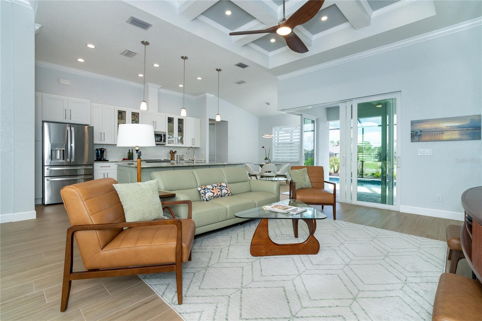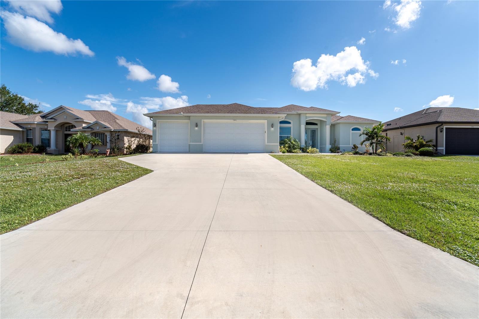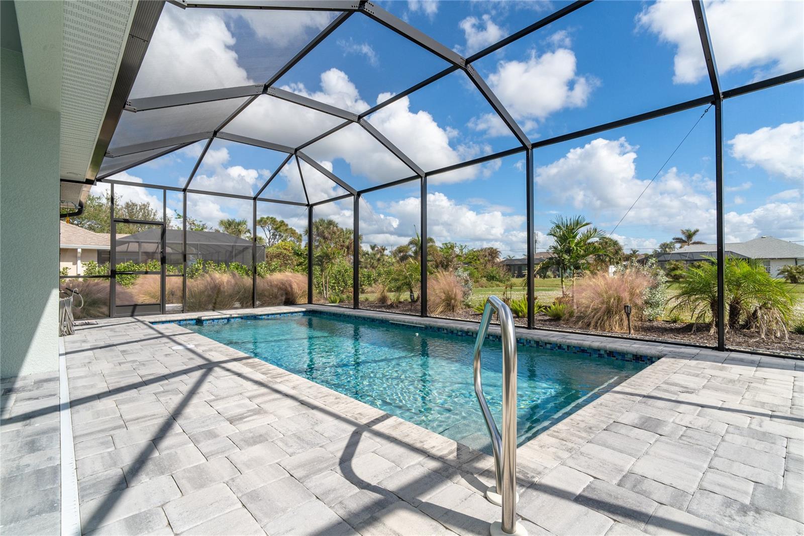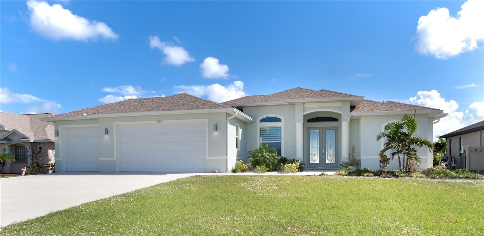 BETTER THAN NEW! Why wait to build when you can move right into this stunning, 2-year-old custom-built contemporary pool home in the highly sought-after golfing community of Rotonda West on prestigious Rotonda Blvd North? This home, located on an oversized 80’ x 200’ (.37 acre) homesite in the preferred X flood zone, boasts a thoughtfully designed open-concept floor plan with multiple builder and owner upgrades throughout. From the moment you step through the barrier-free glass double doorway into the soaring vestibule, you’ll be captivated by the bright and open split floor plan, which separates the primary suite from bedrooms 2 and 3, ensuring privacy on opposite sides of the main living area. The home’s contemporary design features elegant details like soaring ceilings with double crown molding, custom high-efficiency lighting and fans, a coffered ceiling with extra lighting, 8’ doors, pocket doors, 90-degree sliders, 5 ¼” base trim, and sleek wood plank porcelain tile flooring throughout. The chef’s kitchen is equipped with high-end G.E. Profile stainless steel appliances, self-closing cabinetry with in-cabinet Shelf Genie slide-out shelves, and a spacious island (50” D x 9’9.5” L) with seating and storage on both sides. Beautiful level 3 Quartzite countertops and a custom tile backsplash elevate the space, making it a true culinary haven. The primary suite bathroom offers a luxurious experience with an oversized “car wash” shower featuring matching benches, porcelain tile, decorative tile accents, and a sealed stone floor, as well as a separate soaking tub. Double-pane insulated impact glass windows and doors provide effortless hurricane protection throughout. Additional highlights include a spacious 3-car garage with custom epoxy and Polyaspartic floor coating, a new roof (installed Feb 2023) with an upgraded water-resistant barrier, and a beautifully designed custom pool. The 11’x25’ heated saltwater pool includes durable Pebble tec coating, decorative and reflective tile, an arched waterfall, a 1.8 variable speed pump, and a large 18’x37’ pool cage with adjoining paver patio and walkway. Outdoor features such as the Custom Curbing, stonework, custom landscaping, and lighting further enhance the property’s curb appeal. Pride of ownership is evident in every corner of this home. Schedule your private showing today and experience the charm and quality of this exceptional property!