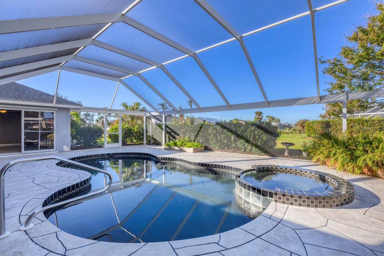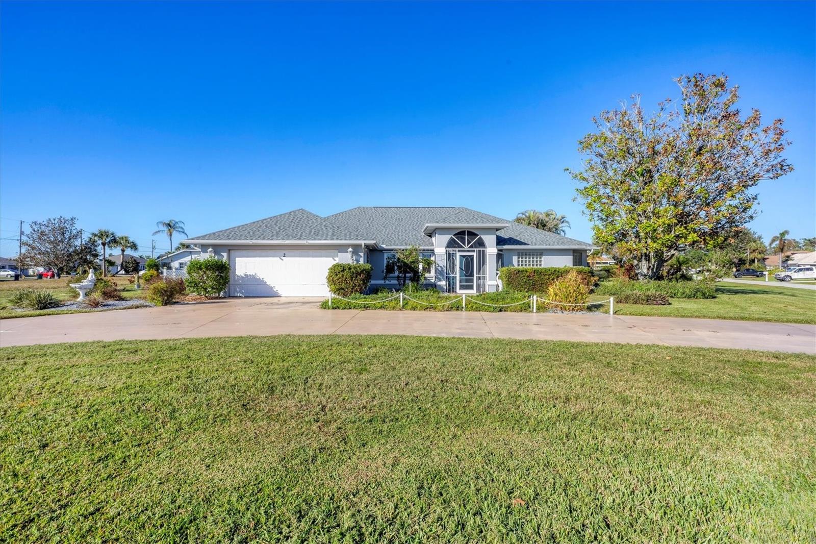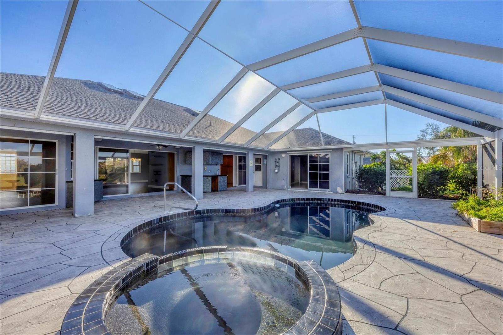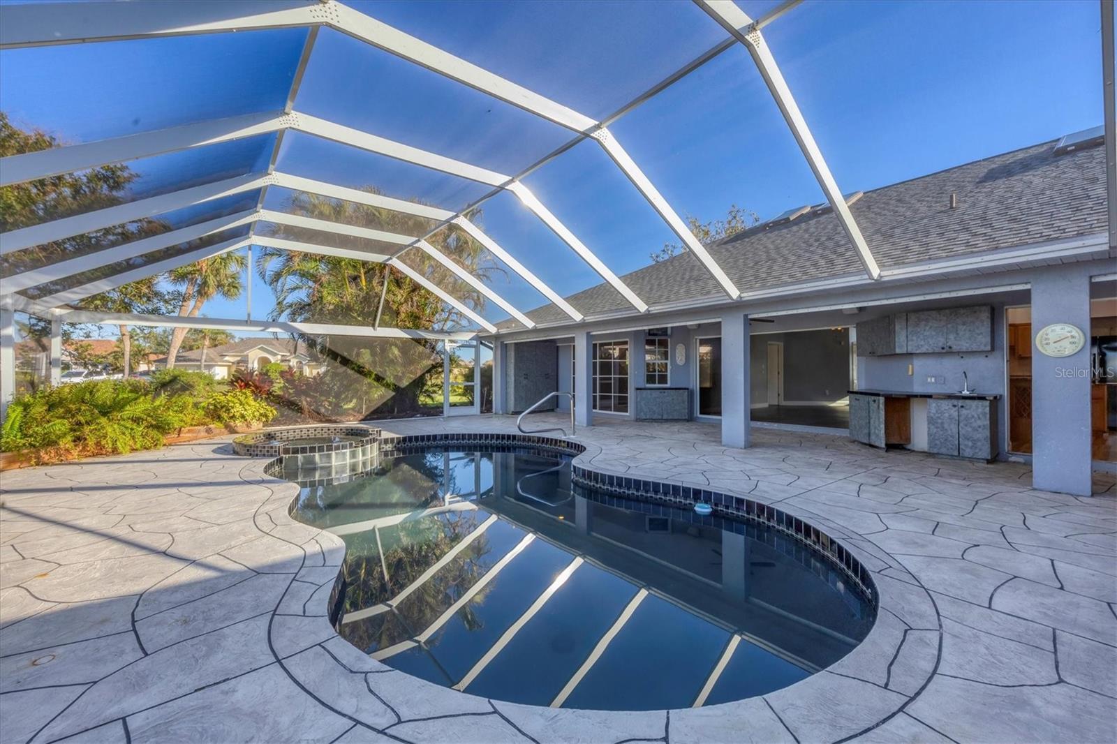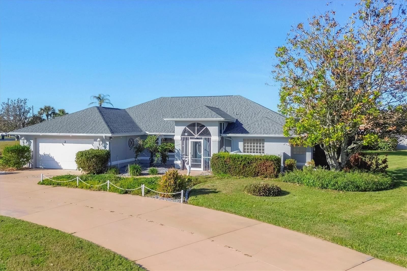 Spacious Living with Circular Driveway on Oversized Corner Lot in Rotonda West – This Three Bedroom, Two and a Half Bath Home is a Must-See! This home offers peace of mind with its location in the X flood zone, a 2023 roof, 9 impact windows, hurricane shutters for all remaining openings, and impact-resistant skylights for added storm protection. The screened entryway and double doors with decorative leaded glass welcome you into a stunning open space featuring triple pocketing sliders, vaulted ceilings, an abundance of natural light, upgraded light fixtures, and gleaming floors that flow throughout. Step into the spacious kitchen, a chef's delight with ample granite countertop space, rich wood cabinets, a tray ceiling with a skylight, and double sliding glass doors that open to the pool area, perfect for both indoor and outdoor entertaining. The primary ensuite offers private outdoor access through sliding glass doors, a tray ceiling, and a spacious walk-in closet with custom organizers. The primary bathroom serves as a serene retreat, featuring a jetted tub, a separate step-in shower, and an expansive dual-sink vanity with a makeup area. One guest bedroom features a walk-in closet and sliding glass doors leading to the pool, while the other includes a cedar reach-in closet. Both guest rooms share a convenient bathroom, and an additional half bath ensures everyone has their own space to prepare for the day. The air conditioned garage features tiled floors, tons of built-in cabinets, and a cleverly designed false wall concealing the garage door, creating a seamless extension of the home while providing abundant storage and parking space. The spacious lanai and recently updated caged pool area with panoramic screening offer everything needed to live the Florida lifestyle, featuring a spa, a wet bar with a sink and cabinets, and lush mature landscaping for added privacy. Located on Florida’s beautiful southwest coast, the deed-restricted Rotonda West community offers the perfect balance of peaceful living and an active outdoor lifestyle. With 26 miles of tranquil canals, ponds, and lakes, this charming neighborhood is just a short drive from pristine beaches, boating in Lemon Bay and Boca Grande, shopping, local dining, major league baseball facilities, and some of the world’s best fishing in the Gulf of Mexico. Whether you’re seeking relaxation or adventure, this area has it all. Contact us today to schedule your private showing!