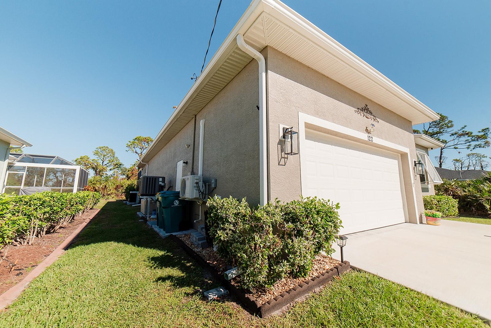 Welcome to 122 Glades Dr. Only 3 years young! PRICED REDUCED, MOTIVATED SELLER! Located in the up and coming Rotonda Heights! This home shows like a Model from the custom tile entry to the sparkling pool, beautifully decorated with a Coastal feel and available partially furnished. As you walk up to the house you will notice the custom screened entryway with custom tile floor. Enter the front door into the living room your eyes go immediately to the inviting, 13'x26' heated pool and lanai area. The heated pool is protected by screened lanai that has been fortified with extra framing, pool alarm, and a baby barrier for the little ones. Large kitchen includes a spacious island, granite counter tops, pantry and opens to the living and dining area's with tray ceilings and ceramic wood look tile throughout the entire home. The open floor plan is perfect for entertaining! Office/Flex room can be utilized many ways to suit your lifestyle. Primary Bedroom has a walk in closet, en suite with a large walk in shower, double sinks and vanity. The 2 guest bedrooms share guest bath. Laundry with cabinets is conveniently located between the kitchen and garage. The garage has shelving and a Mini Split A/C for temperature control, great for working in the garage or just extra storage that is climate controlled. Other updates include Hurricane rated Bermuda Shutters, Accordion Shutters for lanai area, Hurricane Shutters, Rain Gutters. Last but certainly not least Generator Hook up that connects directly to the Breaker Box for ease of use! This home is conveniently located to shopping, restaurants within just minutes. Manasota Key, Englewood Beach and Boca Grande are a short 15 minute drive for beaches, boating and your fun in the sun activities! This home comes with a 1 Year Home Warranty! Motivated Seller, schedule your private showing today!