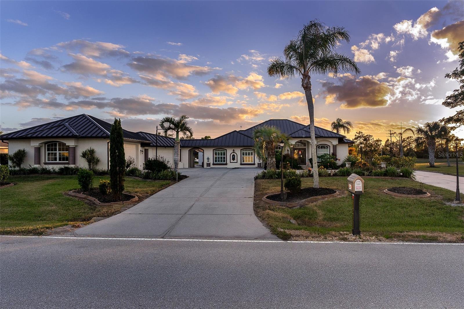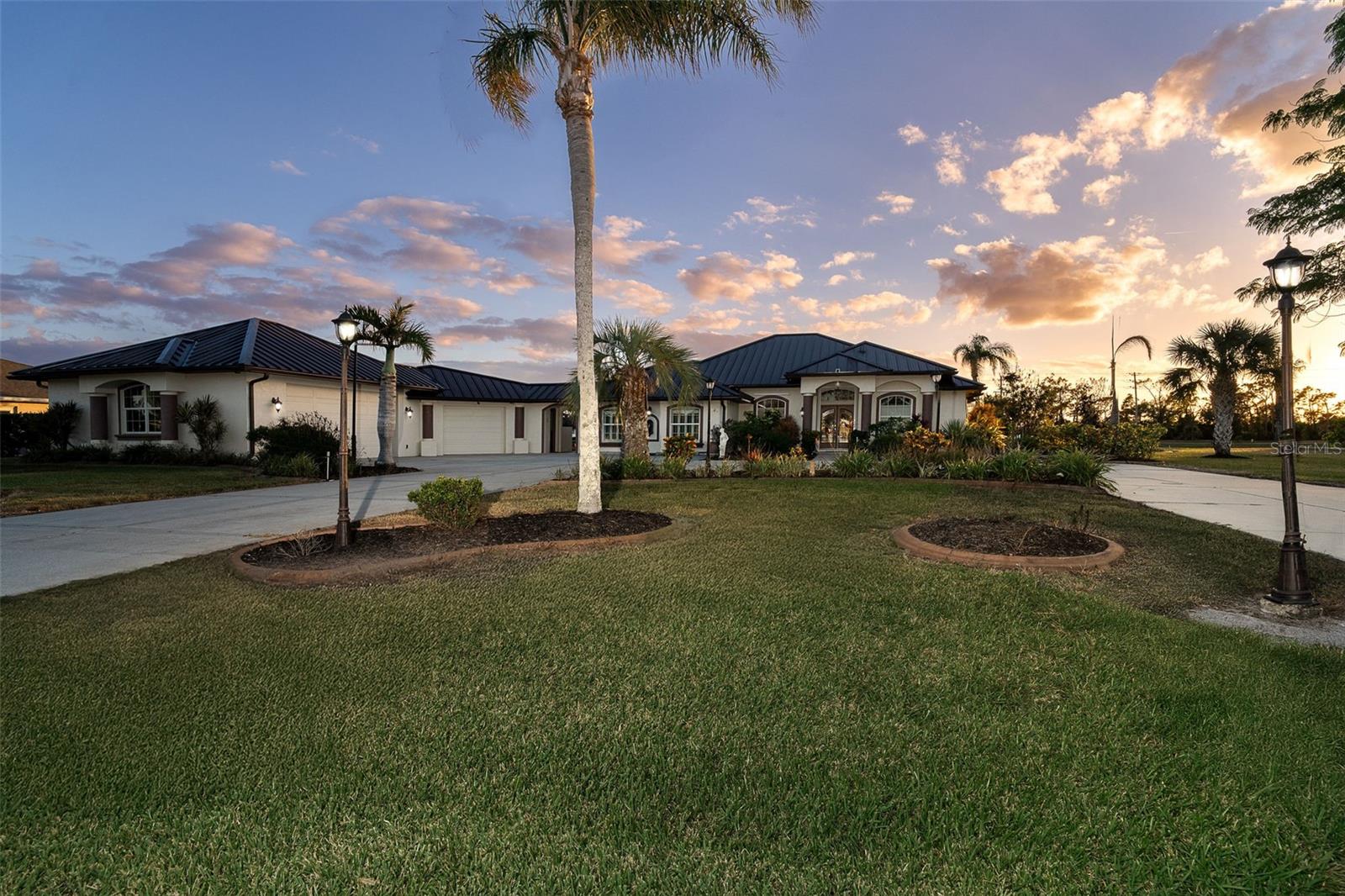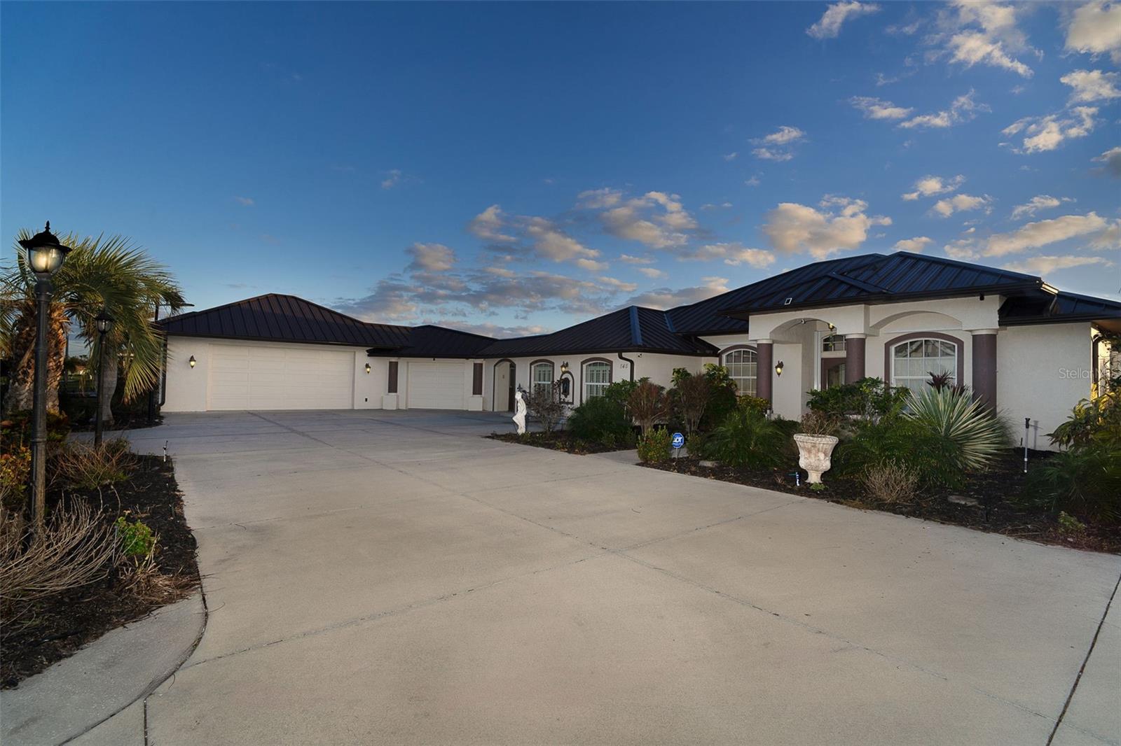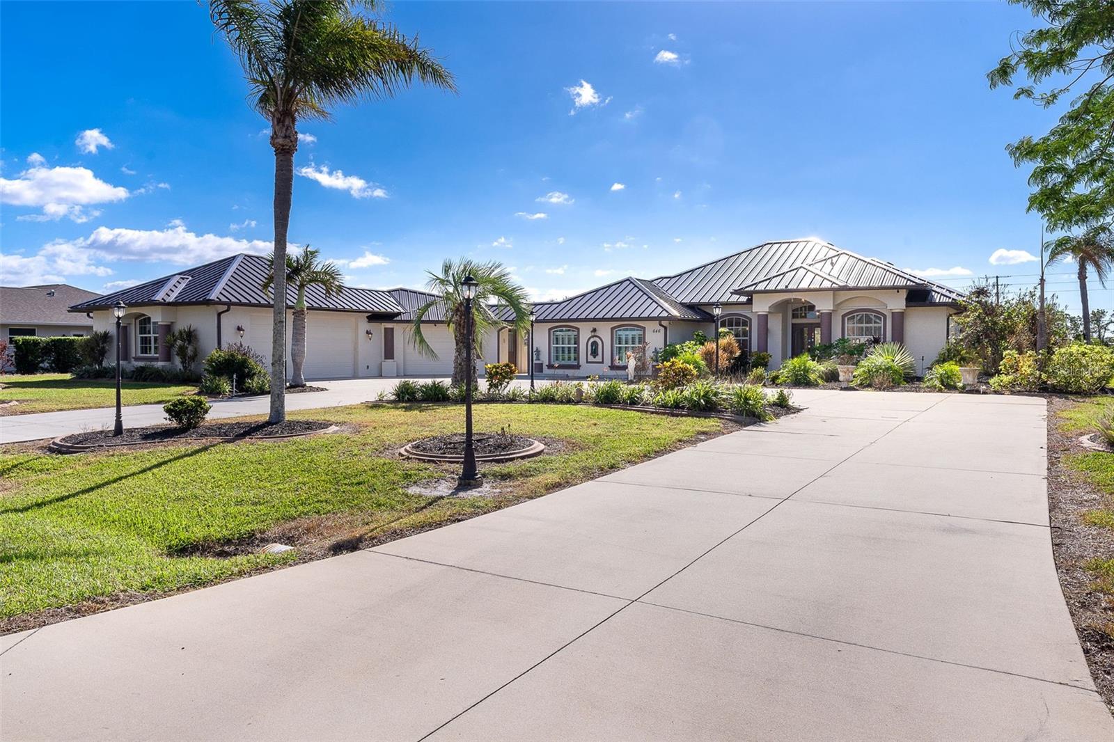 One or more photo(s) has been virtually staged. SELLER FINANCING AVAILABLE at 4.25% interest for qualified buyers! Located in an "X" Flood Zone, this home does not require flood insurance—a rare and valuable benefit in Florida. If you're searching for a high-and-dry home that offers the perfect blend of privacy, space, and style, this is the one. Situated on nearly ¾ of an acre across two waterfront lots, the property features one of the widest views of the Rotonda River/Canal, providing peaceful water vistas and unmatched seclusion. From the moment you arrive, the curb appeal is undeniable. A grand circular driveway welcomes you and leads to oversized garages, while freshly mulched flower beds and lush landscaping enhance the home’s visual charm. A brand-new steel standing seam metal roof (2023) with a dry-in underlayment membrane offers long-term durability and preferred insurance benefits. The property is also protected by three separate security systems for your peace of mind. There’s ample outdoor storage with two fenced-in areas, perfect for lawn equipment or hobby gear. The garages total nearly 1,200 square feet and include space for three cars, a workshop, motorcycles, and even a Level 2 EV charging outlet (50 Amp). A spacious attic provides plenty of extra storage space for your holiday decorations. A professionally installed transfer switch allows for quick generator hookup during power outages. Inside, the primary suite is a true retreat, featuring a spacious bedroom with tray ceilings and tranquil water views. The adjoining bathroom is beautifully appointed with double vanities, a large walk-in shower, soaking tub, two walk-in closets, and a private entrance for added seclusion. The second bedroom offers a walk-in closet and waterproof laminate flooring, while the third bedroom, also with waterproof laminate flooring, currently used as a home office, includes built-in closet space for a printer and a dedicated Winchester fireproof safe. The fourth bedroom was created during a professional garage conversion and serves as a spacious exercise room, accompanied by a large bonus room ideal as a playroom or second office. This portion of the home has its own AC and heating system for added comfort. The kitchen is a chef’s dream, complete with a center island, high-end stainless steel appliances, and extensive cabinetry for storage. The laundry room features upgraded front-loading machines, and three refrigerators (two in home and one in garage) convey with the home. The home is equipped with up-to-code hurricane-rated accordion shutters, metal panels, impact windows, and garage doors for full storm protection. The accordion quick-close hurricane shutters on the lanai provide easy storm protection for all your pool accessories/outdoor furniture without having to drag them into the house. You'll also find luxury touches throughout, including Hansgrohe faucets, Schonbek chandeliers in the dining and entry areas, built-in speaker wiring for a home theater, and a panoramic screen pool cage with sealed pavers and HD materials. Perfectly located just minutes from the stunning beaches of Englewood and Boca Grande, as well as five championship golf courses, this home offers a rare combination of luxury, function, and location.