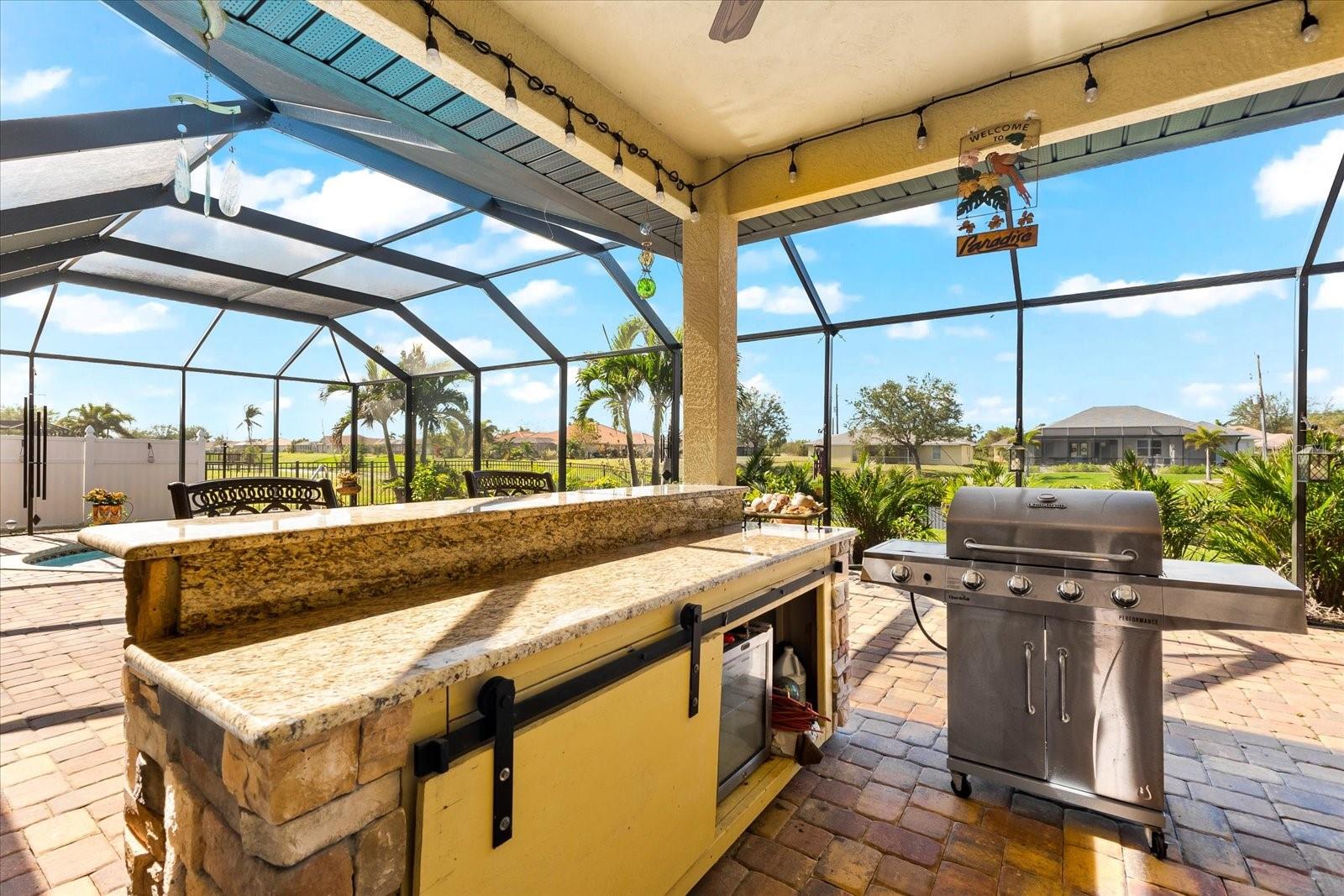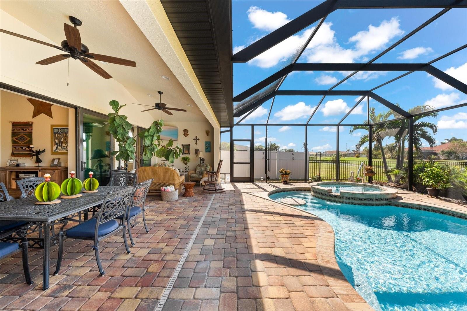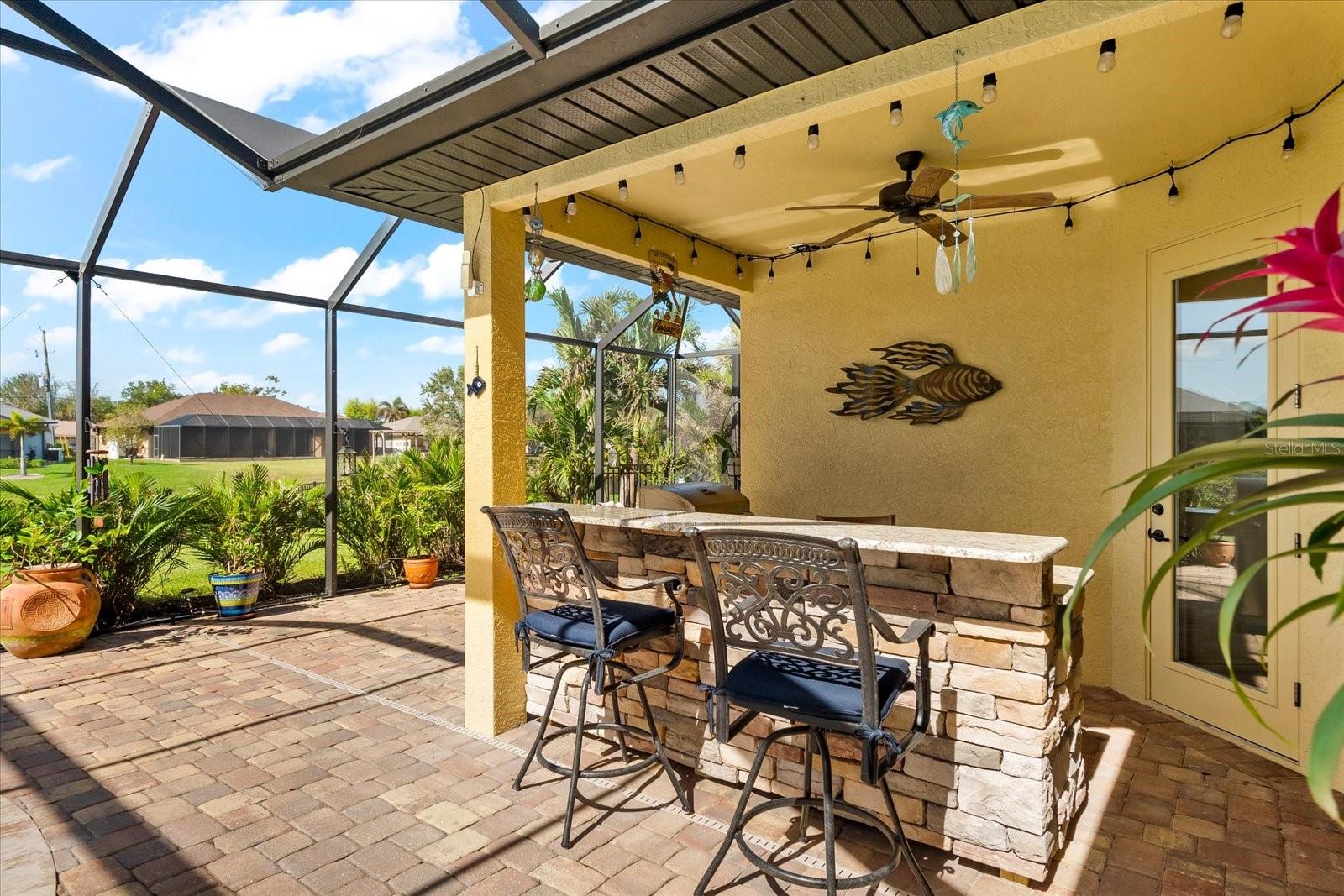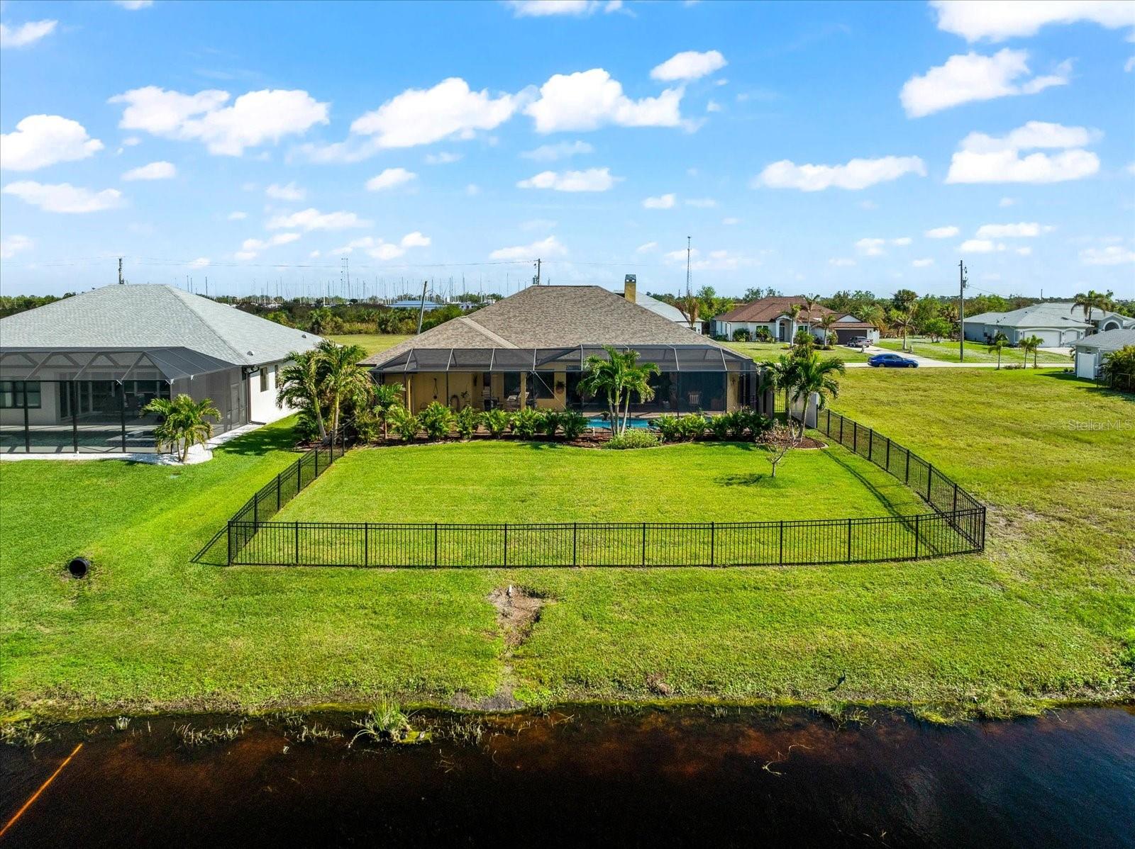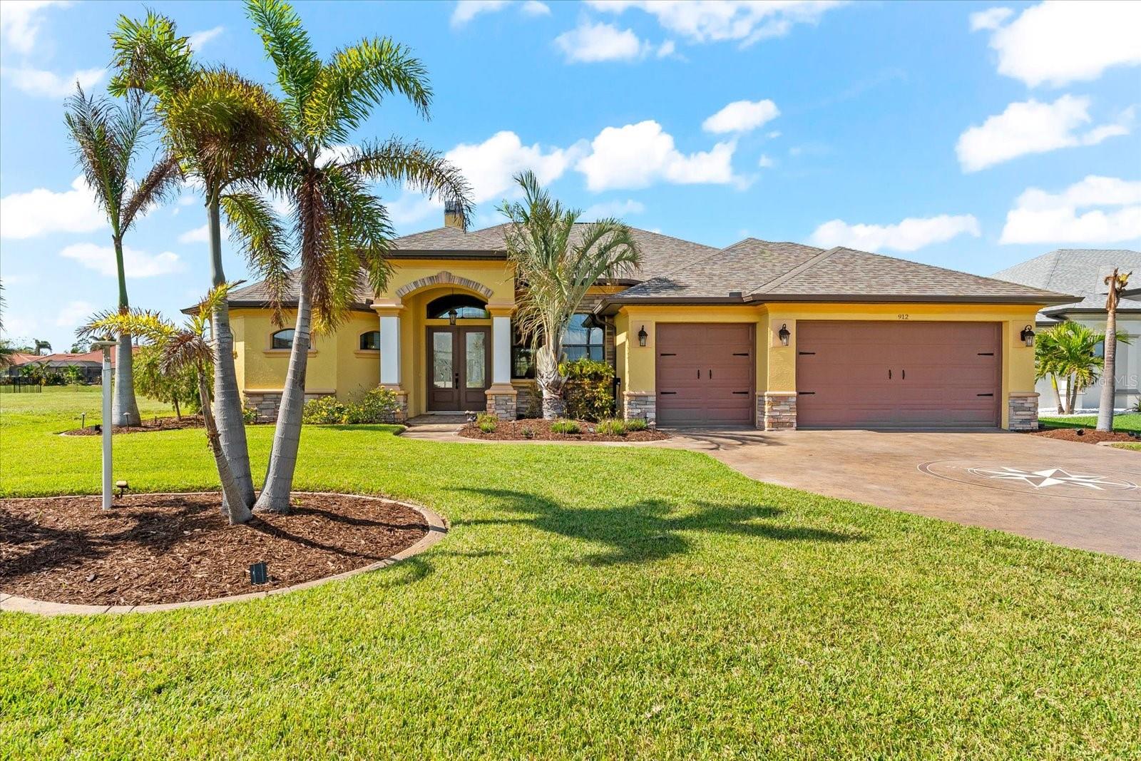 Welcome to your dream home in the highly sought-after Golf community of Rotonda West! This stunning custom-built Halverson Home features a custom-designed driveway, a stone front, and a brand new 2023 roof. Impact windows and doors, concrete curbing, and canal-fed irrigation add to its curb appeal. Situated on an oversized waterfront lot with mature landscaping, this home is a true gem. Inside, you'll be wowed by stunning architectural details, including a double front door that leads into a formal dining room with a built-in credenza. The living room features a cozy propane fireplace and zero-corner doors that open to a luxurious pool and spa area. The kitchen is a chef’s delight with a huge island seating eight, custom soft-close cabinetry topped with custom glass front cabinets, under-mount lighting, stainless steel appliances, and a double convection oven. Plank tile flooring runs throughout the majority of the home, with plush carpeting in the guest bedrooms for added comfort. The large primary bedroom includes space for a sitting area and sliding glass doors to outdoor seating. It boasts a large walk-in closet, a soaking tub, a walk-through shower, dual vanities, and more custom soft-close cabinetry. The split floor plan offers two ample-sized guest bedrooms with a guest bathroom in between. Outside, enjoy the serene view of the freshwater canal, perfect for bird-watching, fishing, or nature enthusiasts. The outdoor space features a heated pool, a custom spa, two large seating areas under fans, and an outdoor kitchen/bar for entertaining. The yard is fenced and the location is unbeatable, under 10 miles to Englewood beaches, close to golf courses, shopping, local restaurants, and more.