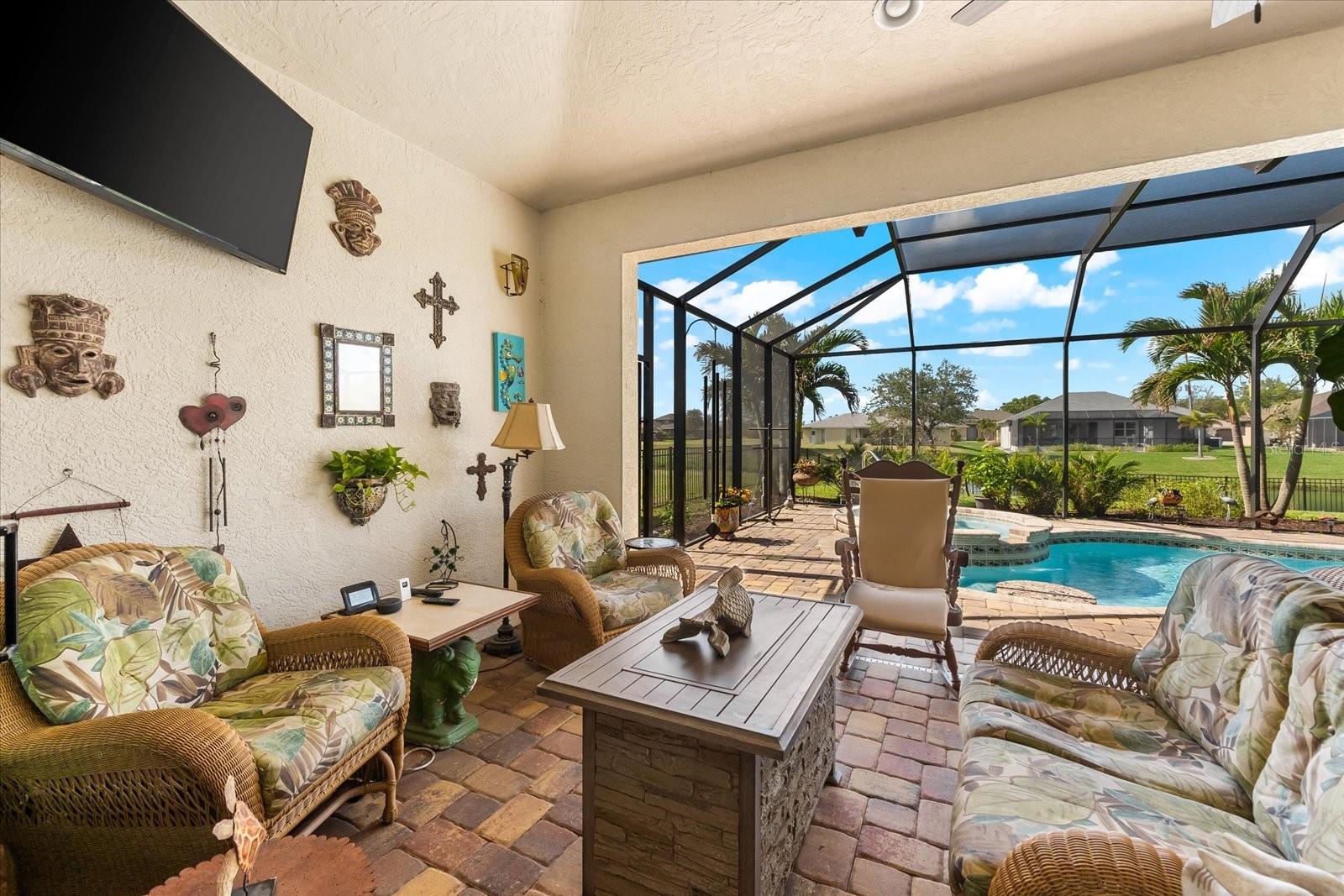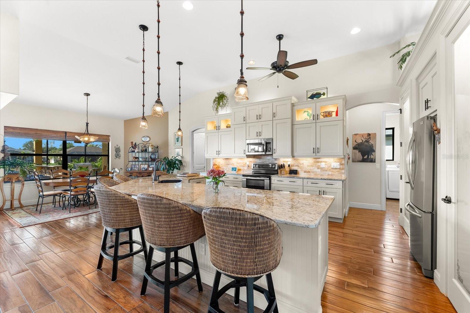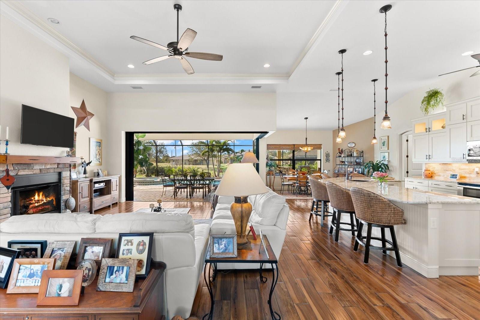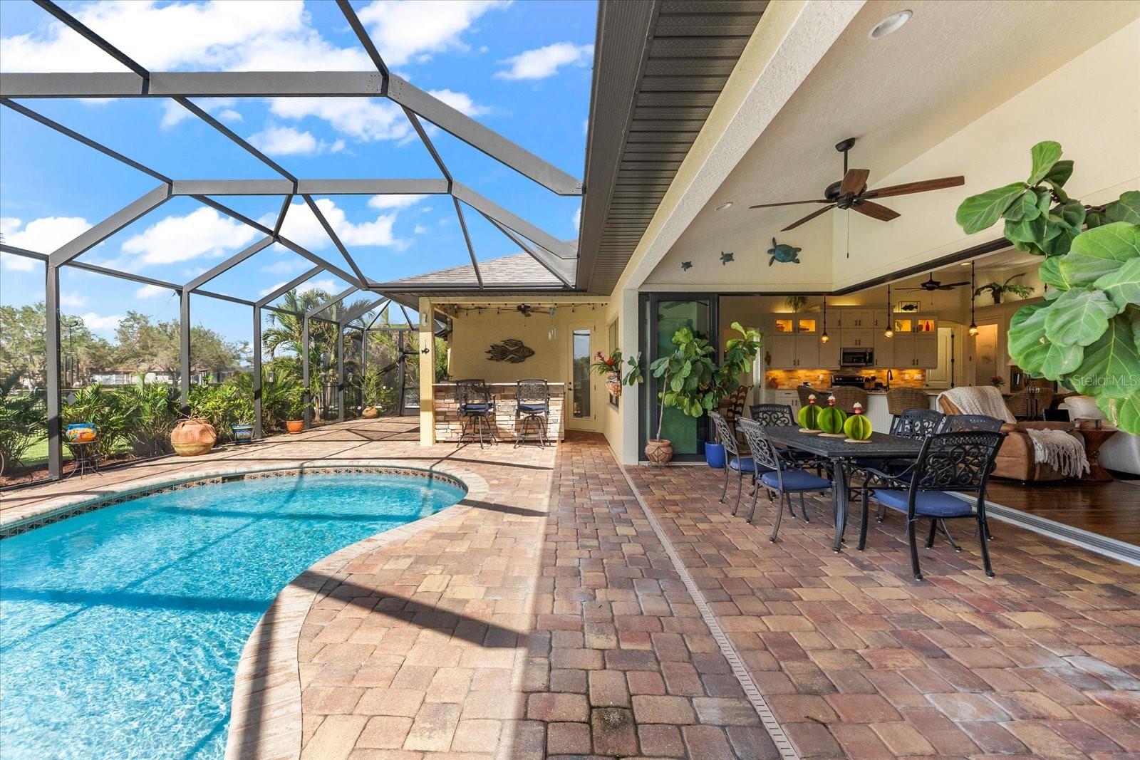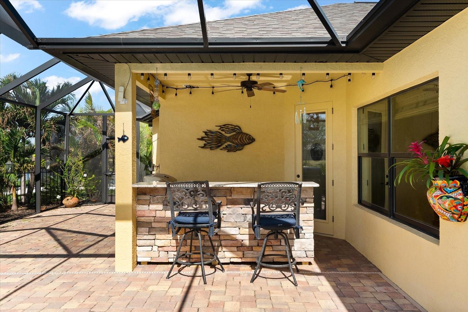 Welcome to your dream home in the highly sought-after Golf community of Rotonda West! This stunning custom-built Halverson Home features a custom-designed driveway, a stone front, and a brand new 2023 roof. Impact windows and doors, concrete curbing, and canal-fed irrigation add to its curb appeal. Situated on an oversized waterfront lot with mature landscaping, this home is a true gem. Inside, you'll be wowed by stunning architectural details, including a double front door that leads into a formal dining room with a built-in credenza. The living room features a cozy propane fireplace and zero-corner doors that open to a luxurious pool and spa area. The kitchen is a chef’s delight with a huge island seating eight, custom soft-close cabinetry topped with custom glass front cabinets, under-mount lighting, stainless steel appliances, and a double convection oven. Plank tile flooring runs throughout the majority of the home, with plush carpeting in the guest bedrooms for added comfort. The large primary bedroom includes space for a sitting area and sliding glass doors to outdoor seating. It boasts a large walk-in closet, a soaking tub, a walk-through shower, dual vanities, and more custom soft-close cabinetry. The split floor plan offers two ample-sized guest bedrooms with a guest bathroom in between. Outside, enjoy the serene view of the freshwater canal, perfect for bird-watching, fishing, or nature enthusiasts. The outdoor space features a heated pool, a custom spa, two large seating areas under fans, and an outdoor kitchen/bar for entertaining. The yard is fenced and the location is unbeatable, under 10 miles to Englewood beaches, close to golf courses, shopping, local restaurants, and more.