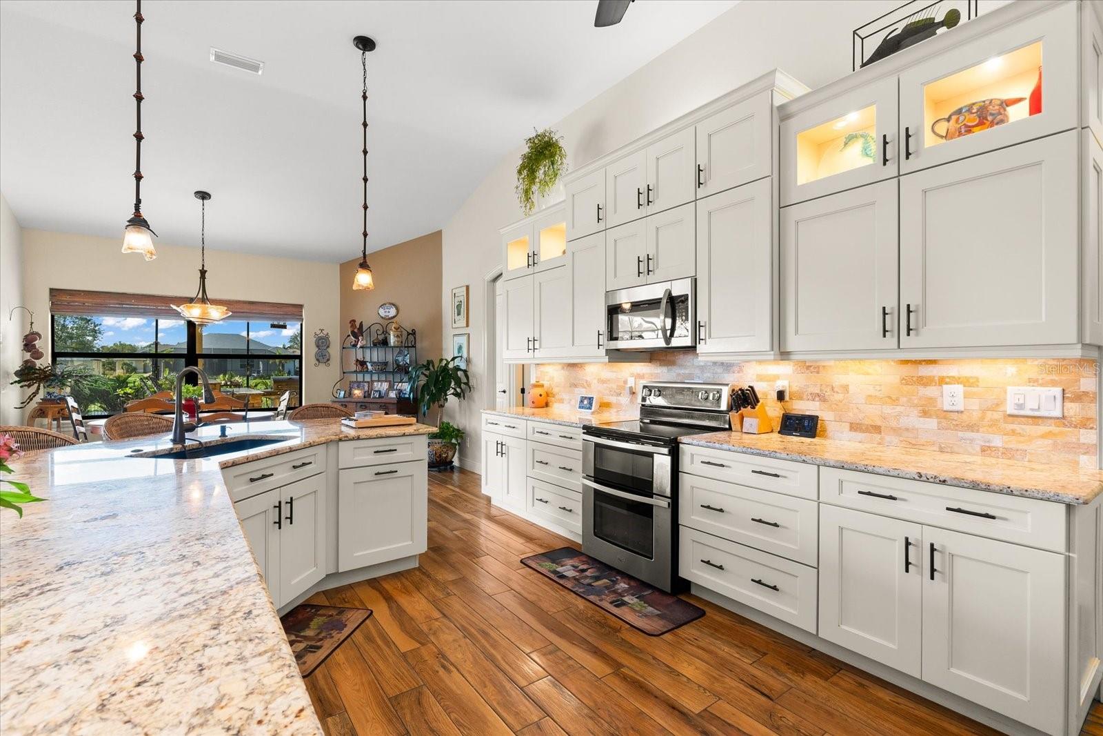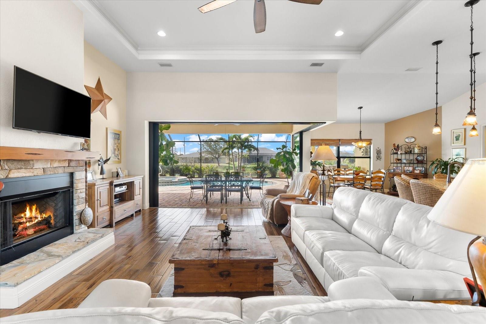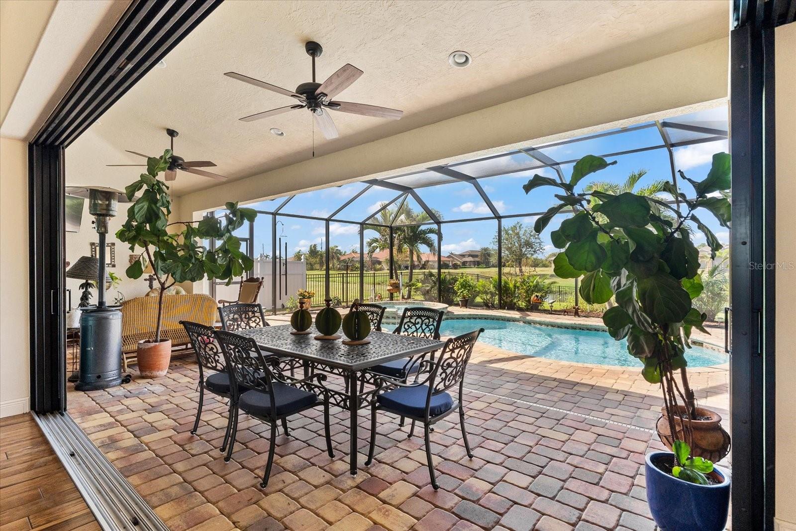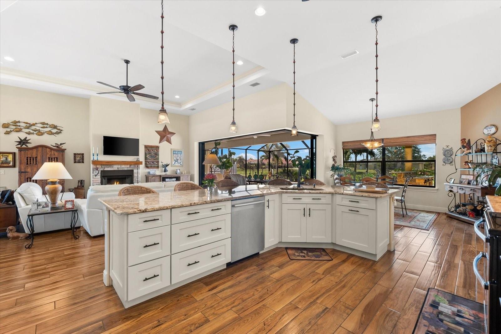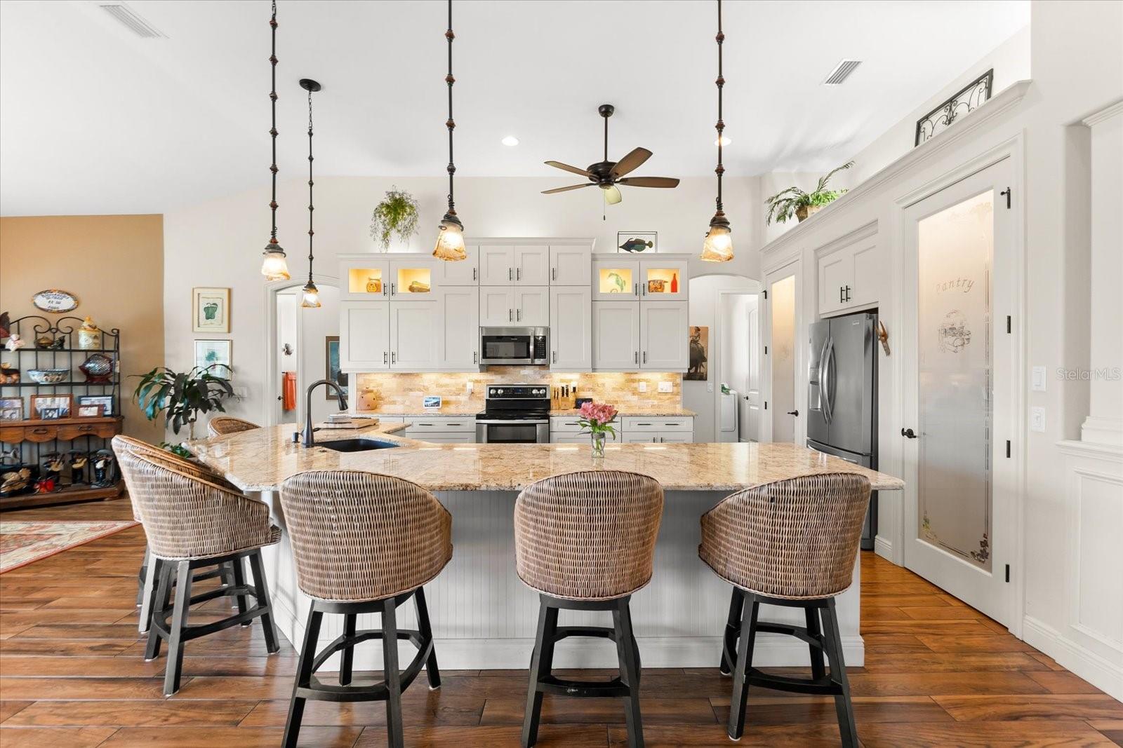 Welcome to your dream home in the highly sought-after Golf community of Rotonda West! This stunning custom-built Halverson Home features a custom-designed driveway, a stone front, and a brand new 2023 roof. Impact windows and doors, concrete curbing, and canal-fed irrigation add to its curb appeal. Situated on an oversized waterfront lot with mature landscaping, this home is a true gem. Inside, you'll be wowed by stunning architectural details, including a double front door that leads into a formal dining room with a built-in credenza. The living room features a cozy propane fireplace and zero-corner doors that open to a luxurious pool and spa area. The kitchen is a chef’s delight with a huge island seating eight, custom soft-close cabinetry topped with custom glass front cabinets, under-mount lighting, stainless steel appliances, and a double convection oven. Plank tile flooring runs throughout the majority of the home, with plush carpeting in the guest bedrooms for added comfort. The large primary bedroom includes space for a sitting area and sliding glass doors to outdoor seating. It boasts a large walk-in closet, a soaking tub, a walk-through shower, dual vanities, and more custom soft-close cabinetry. The split floor plan offers two ample-sized guest bedrooms with a guest bathroom in between. Outside, enjoy the serene view of the freshwater canal, perfect for bird-watching, fishing, or nature enthusiasts. The outdoor space features a heated pool, a custom spa, two large seating areas under fans, and an outdoor kitchen/bar for entertaining. The yard is fenced and the location is unbeatable, under 10 miles to Englewood beaches, close to golf courses, shopping, local restaurants, and more.