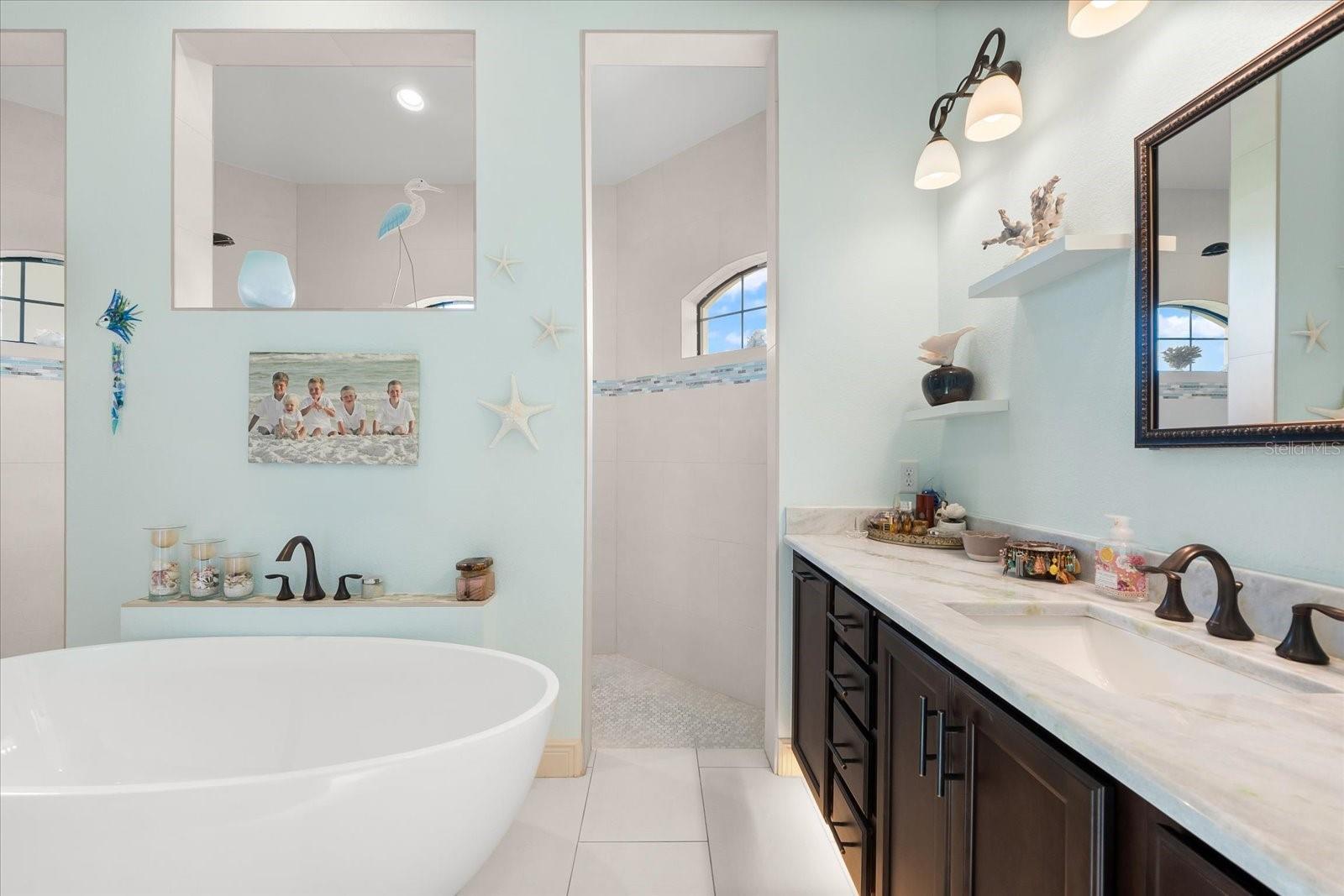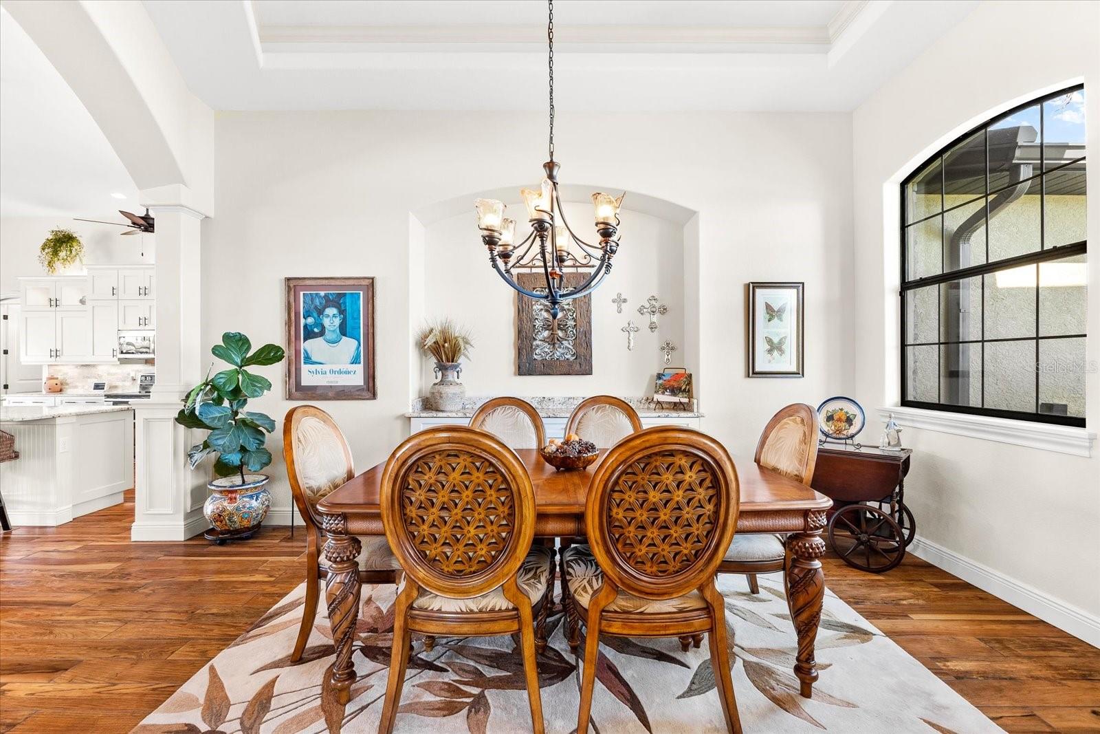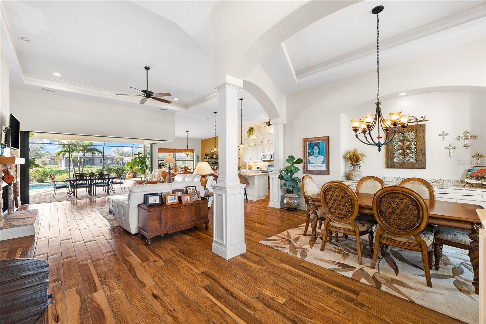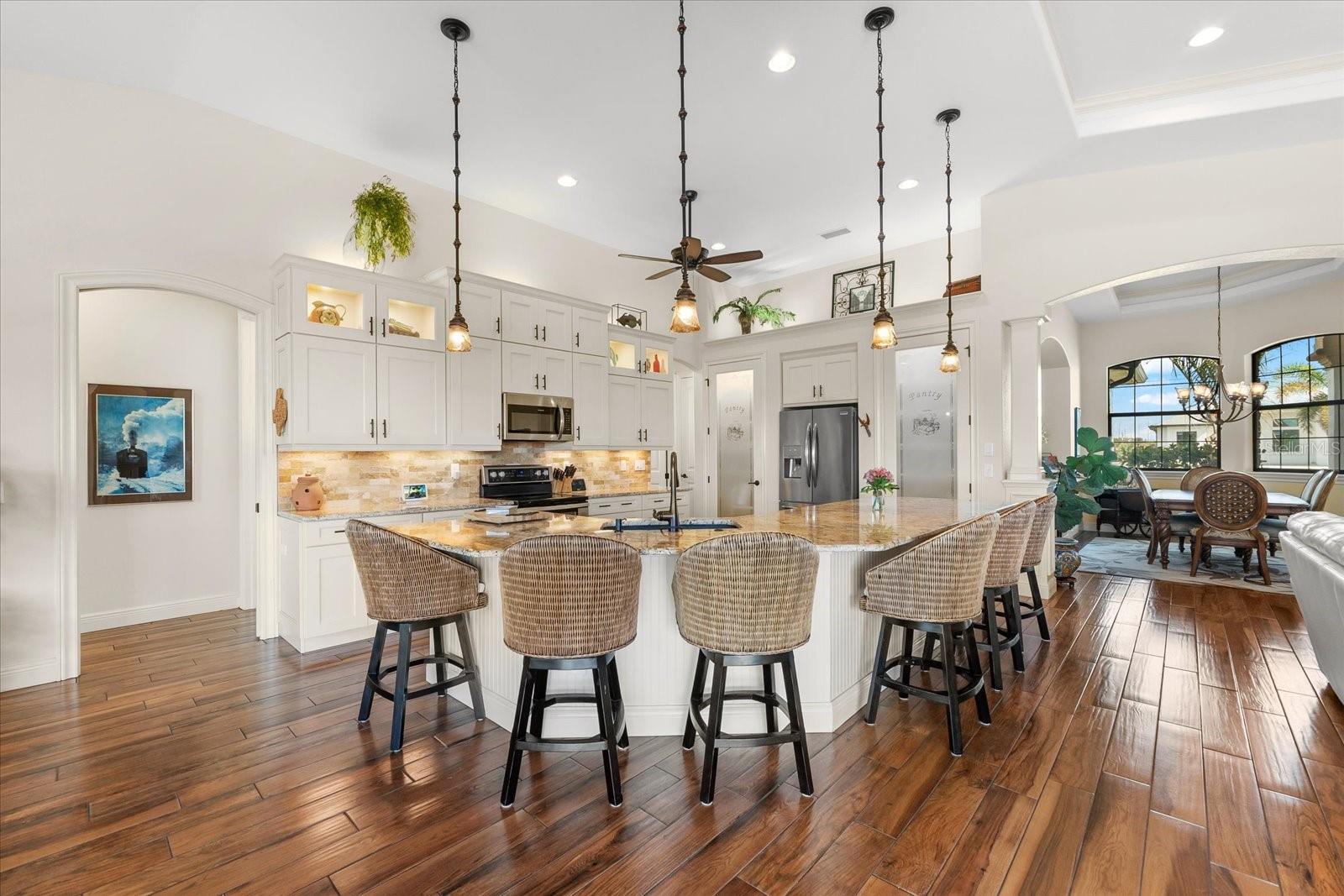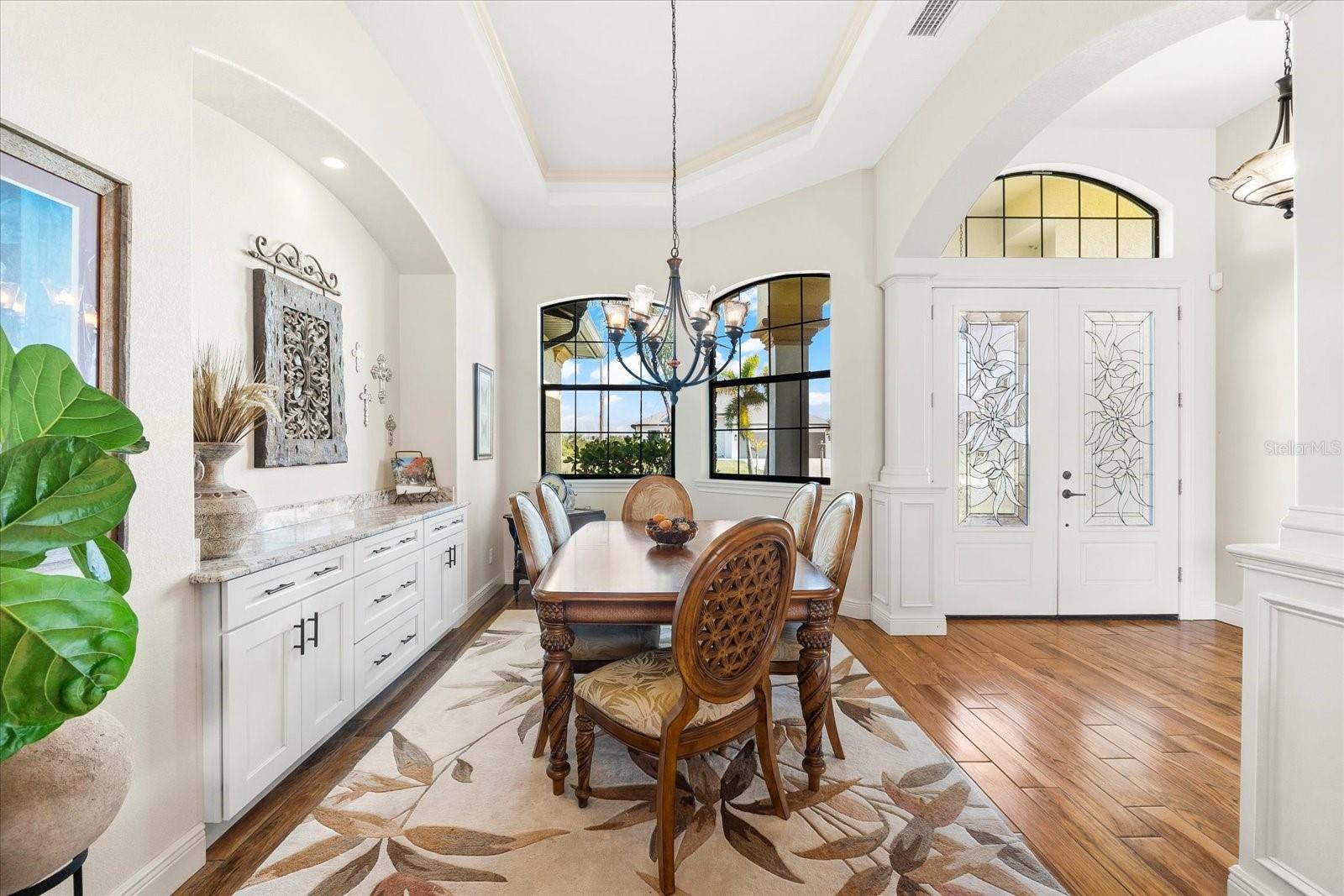 Welcome to your dream home in the highly sought-after Golf community of Rotonda West! This stunning custom-built Halverson Home features a custom-designed driveway, a stone front, and a brand new 2023 roof. Impact windows and doors, concrete curbing, and canal-fed irrigation add to its curb appeal. Situated on an oversized waterfront lot with mature landscaping, this home is a true gem. Inside, you'll be wowed by stunning architectural details, including a double front door that leads into a formal dining room with a built-in credenza. The living room features a cozy propane fireplace and zero-corner doors that open to a luxurious pool and spa area. The kitchen is a chef’s delight with a huge island seating eight, custom soft-close cabinetry topped with custom glass front cabinets, under-mount lighting, stainless steel appliances, and a double convection oven. Plank tile flooring runs throughout the majority of the home, with plush carpeting in the guest bedrooms for added comfort. The large primary bedroom includes space for a sitting area and sliding glass doors to outdoor seating. It boasts a large walk-in closet, a soaking tub, a walk-through shower, dual vanities, and more custom soft-close cabinetry. The split floor plan offers two ample-sized guest bedrooms with a guest bathroom in between. Outside, enjoy the serene view of the freshwater canal, perfect for bird-watching, fishing, or nature enthusiasts. The outdoor space features a heated pool, a custom spa, two large seating areas under fans, and an outdoor kitchen/bar for entertaining. The yard is fenced and the location is unbeatable, under 10 miles to Englewood beaches, close to golf courses, shopping, local restaurants, and more.