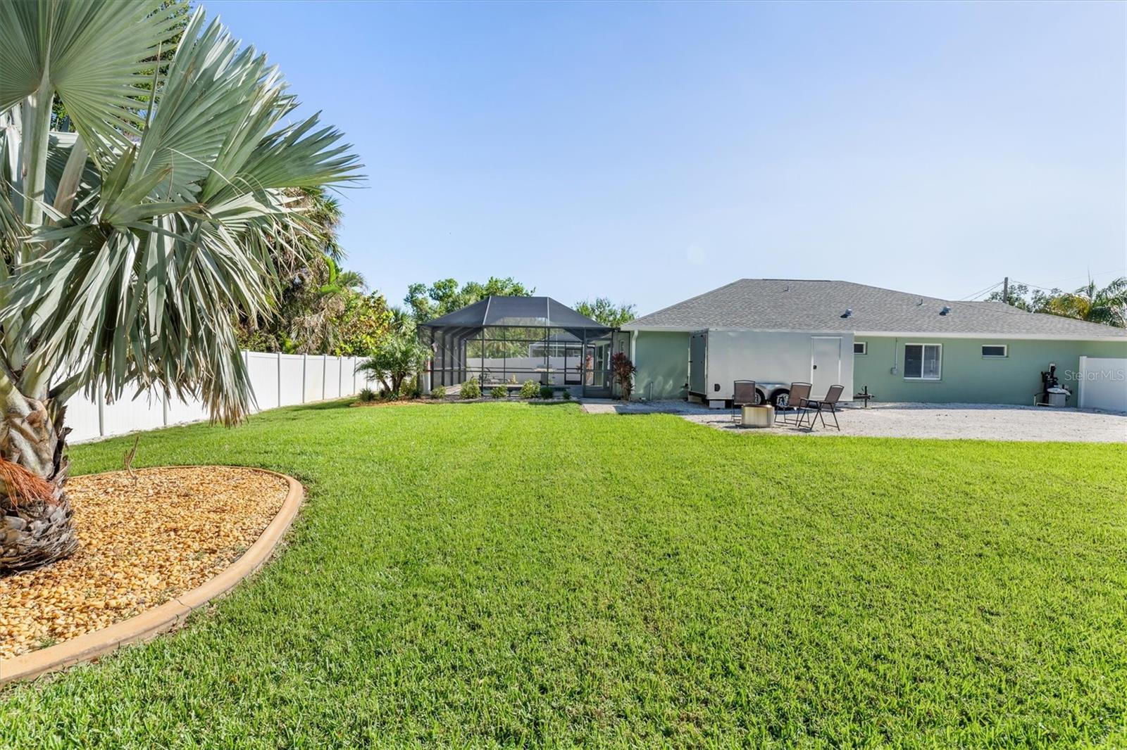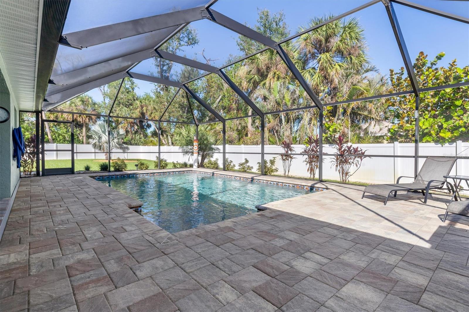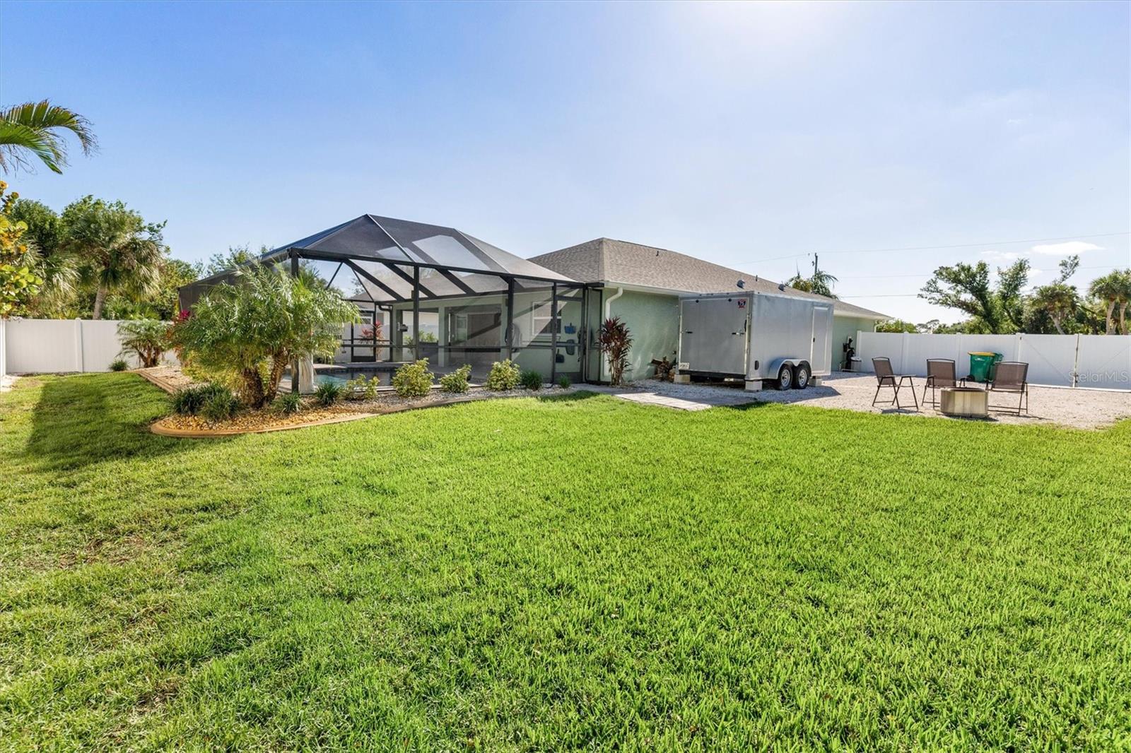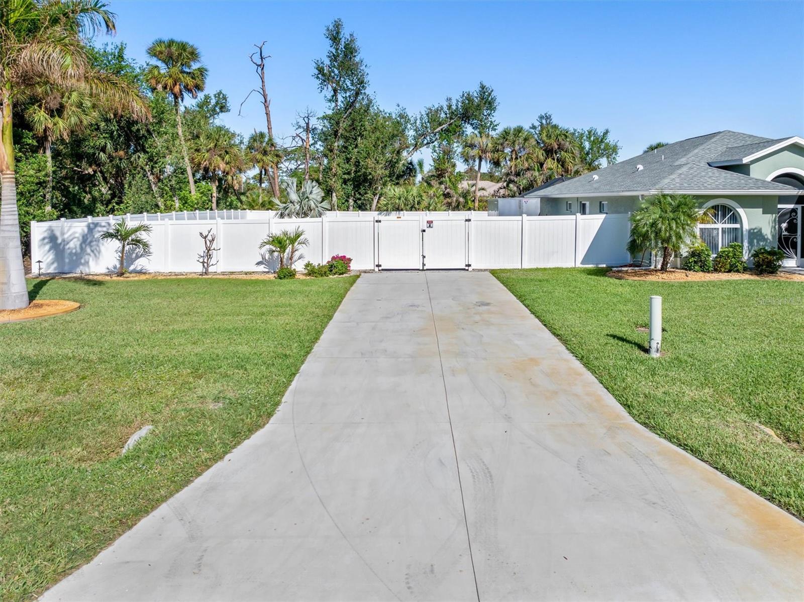 Huge price adjustment! Welcome to this beautifully updated 3-bedroom, 2-bath home with a garage, offering a perfect blend of comfort and style. Featuring high ceilings and two sets of sliding wall doors that lead to a spacious screened lanai, this home is ideal for both relaxation and entertaining. Freshly painted throughout with new door hardware and updated light fixtures, every detail has been thoughtfully designed. The garage is a standout, with an epoxy-coated floor and a convenient washtub. Outside, enjoy a heated gunite saltwater pool with a sunshelf, installed in 2021, and surrounded by a screened cage and newly resealed pavers. The pool area is perfect for year-round enjoyment. The property also includes a separate 6" concrete drive with a double gate that leads to RV parking and a 50 amp electric hookup. Plenty of room to store your trailers and extra vehicles within a secured gated area. Plenty of room to add a garage or mancave. (This property allows for a stand-alone structure. Does not require attachment to the home) Property had NO hurricane damage & is NOT IN A FLOOD ZONE. Located on a quiet, double lot with a privacy fence, you'll have plenty of space to relax. The irrigation system is supplied by a well, offering reduced water bills. Many recent large ticket improvements include: Roof (2022) HVAC (2024), Water Heater (2023), Additional insulation (2024), Kinetico water filtration/softener system w/reverse osmosis for kitchen (2023), Dishwasher (2025), New laundry cabinetry, Pool pavers cleaned & sealed (2024), Fresh interior paint, updated lighting fixtures & updated door hardware. Conveniently located close to marinas, beaches, restaurants, and shopping, this home offers the perfect combination of comfort, privacy, and location. Don't miss out on this amazing opportunity!