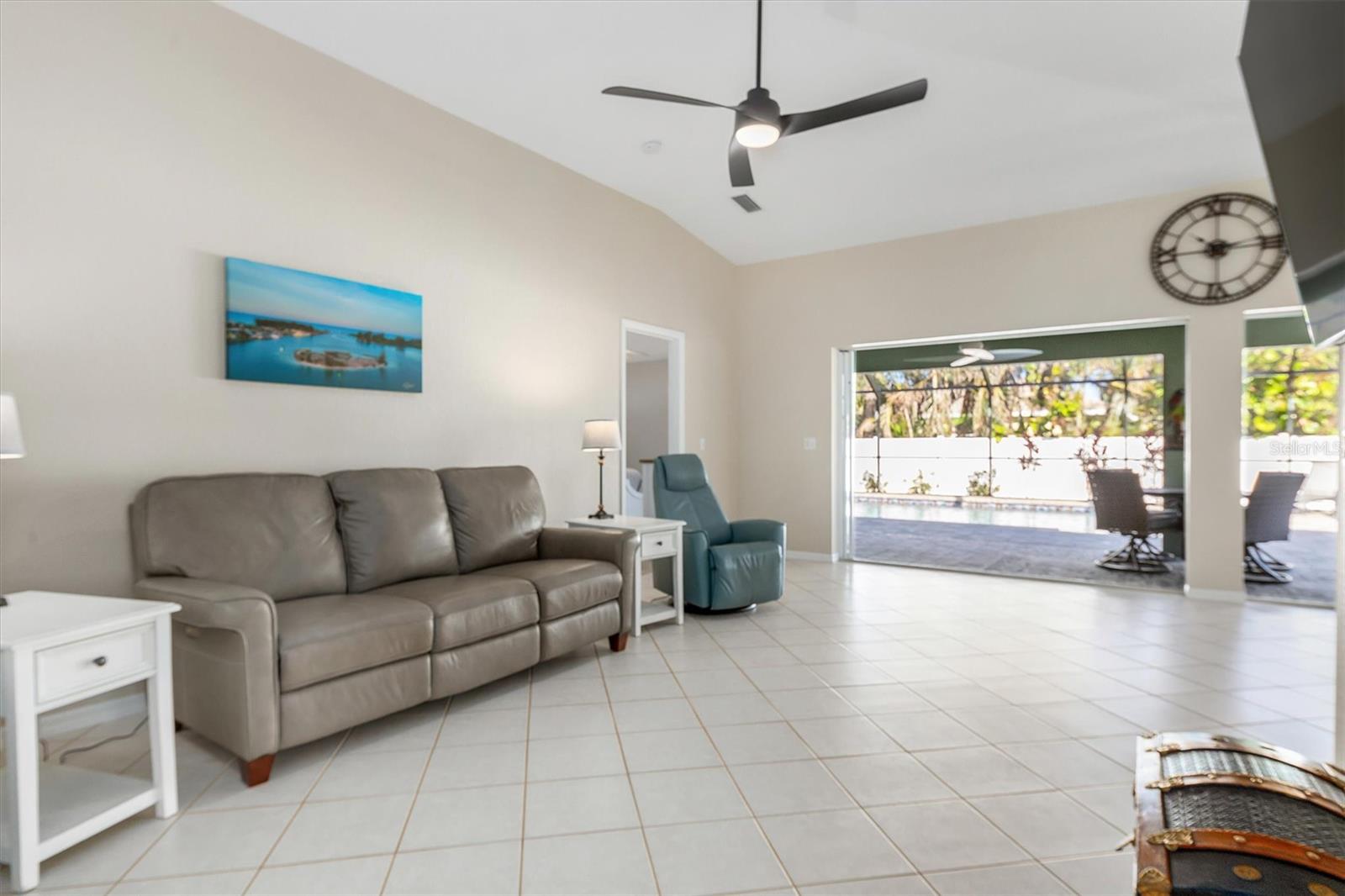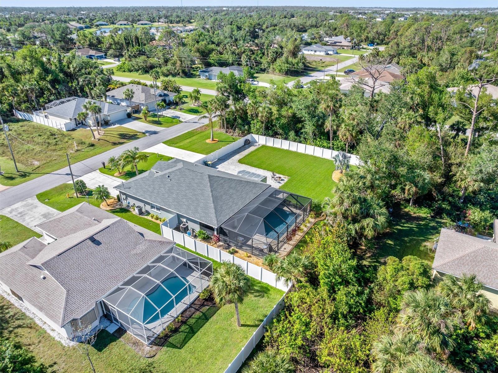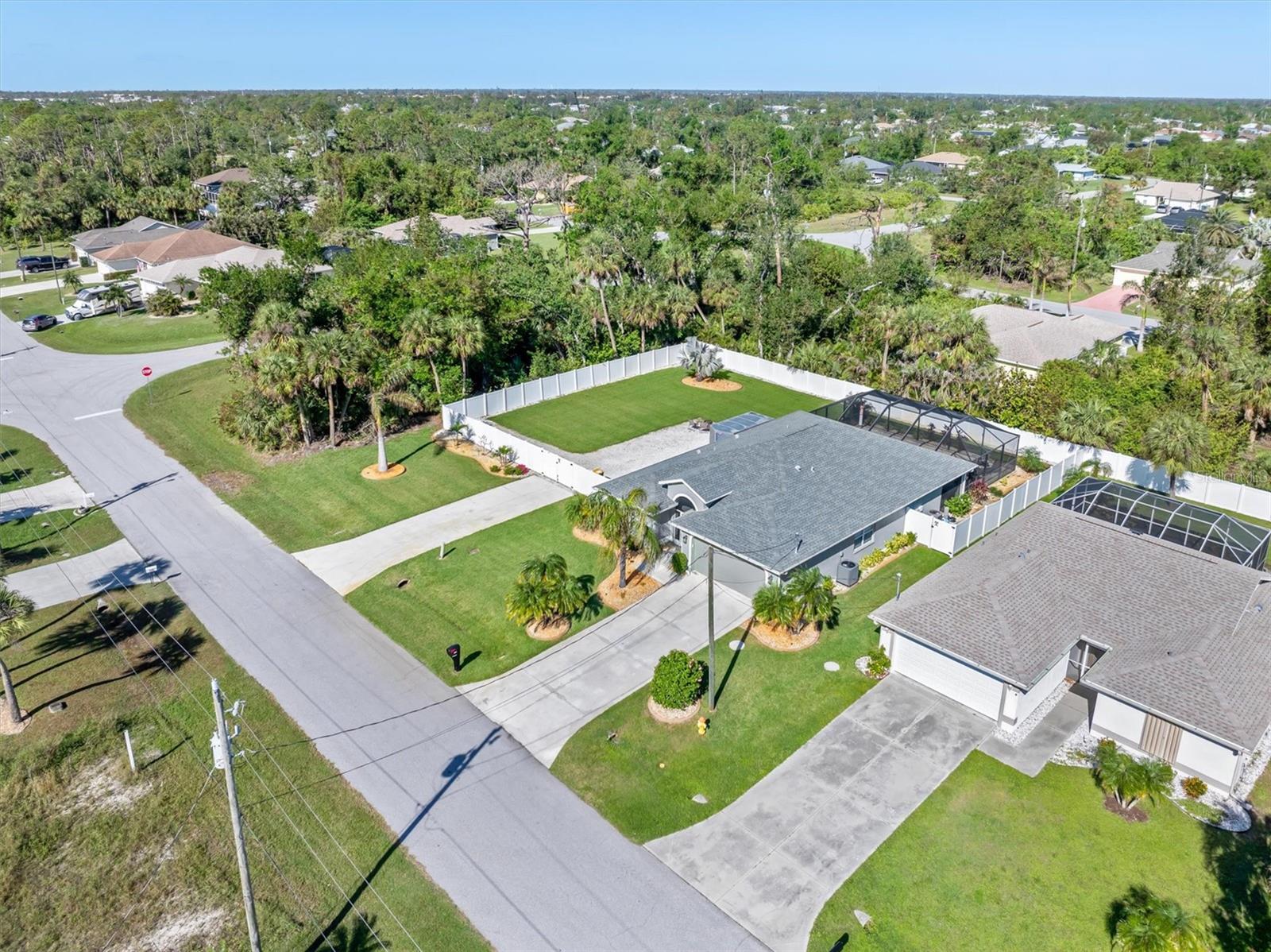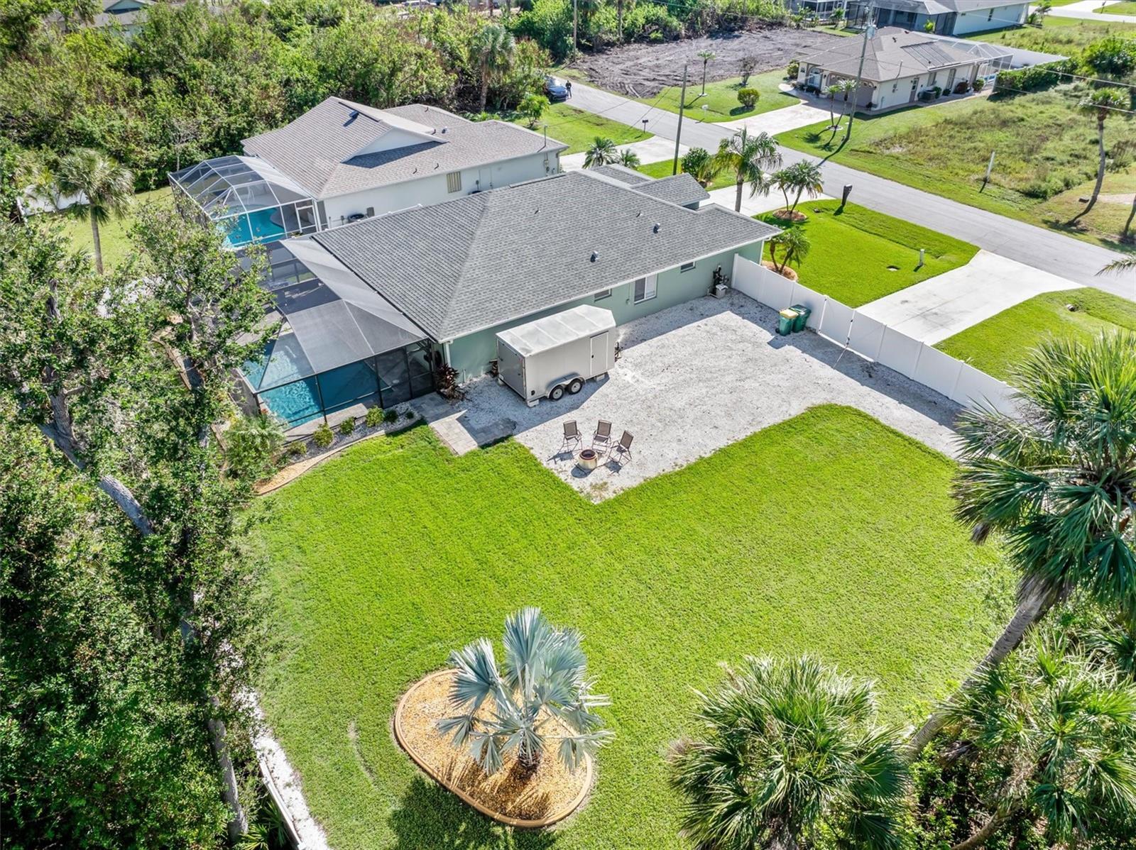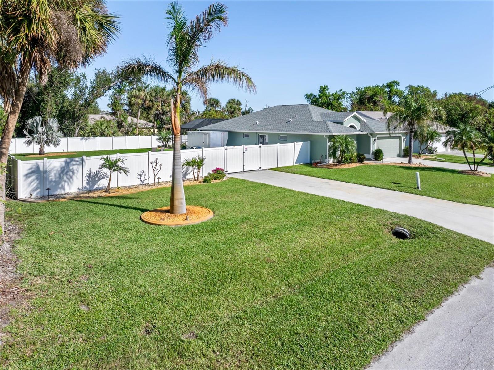 Huge price adjustment! Welcome to this beautifully updated 3-bedroom, 2-bath home with a garage, offering a perfect blend of comfort and style. Featuring high ceilings and two sets of sliding wall doors that lead to a spacious screened lanai, this home is ideal for both relaxation and entertaining. Freshly painted throughout with new door hardware and updated light fixtures, every detail has been thoughtfully designed. The garage is a standout, with an epoxy-coated floor and a convenient washtub. Outside, enjoy a heated gunite saltwater pool with a sunshelf, installed in 2021, and surrounded by a screened cage and newly resealed pavers. The pool area is perfect for year-round enjoyment. The property also includes a separate 6" concrete drive with a double gate that leads to RV parking and a 50 amp electric hookup. Plenty of room to store your trailers and extra vehicles within a secured gated area. Plenty of room to add a garage or mancave. (This property allows for a stand-alone structure. Does not require attachment to the home) Property had NO hurricane damage & is NOT IN A FLOOD ZONE. Located on a quiet, double lot with a privacy fence, you'll have plenty of space to relax. The irrigation system is supplied by a well, offering reduced water bills. Many recent large ticket improvements include: Roof (2022) HVAC (2024), Water Heater (2023), Additional insulation (2024), Kinetico water filtration/softener system w/reverse osmosis for kitchen (2023), Dishwasher (2025), New laundry cabinetry, Pool pavers cleaned & sealed (2024), Fresh interior paint, updated lighting fixtures & updated door hardware. Conveniently located close to marinas, beaches, restaurants, and shopping, this home offers the perfect combination of comfort, privacy, and location. Don't miss out on this amazing opportunity!
